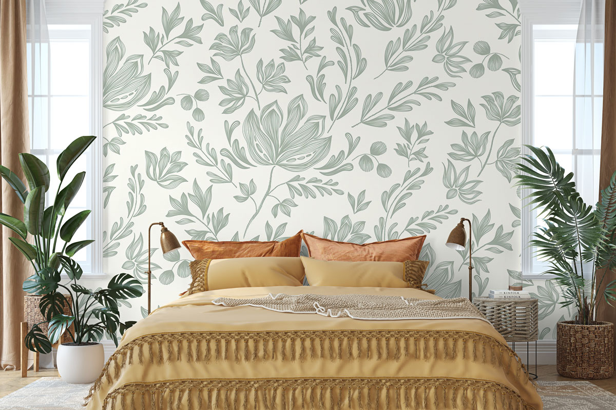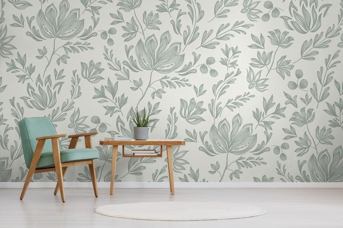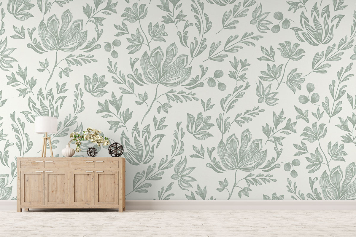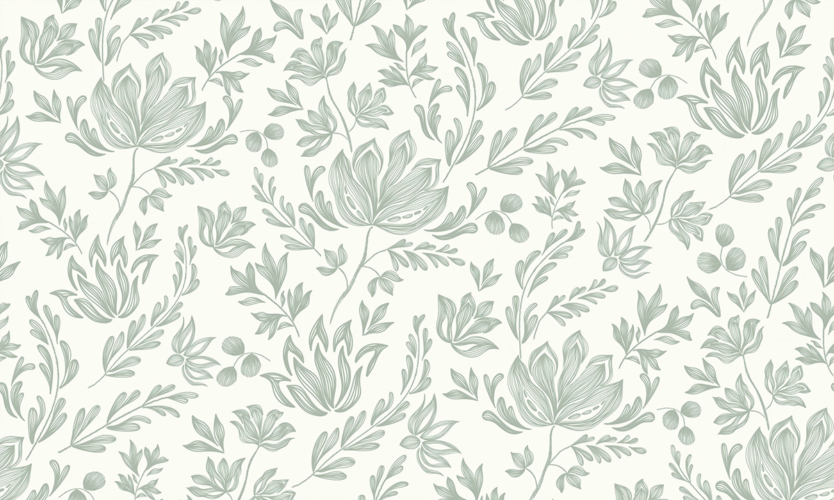 Botanisch patroon met lotusbloemen en ranken in saliegroen en eucalyptus op crème. Zacht en klassiek.