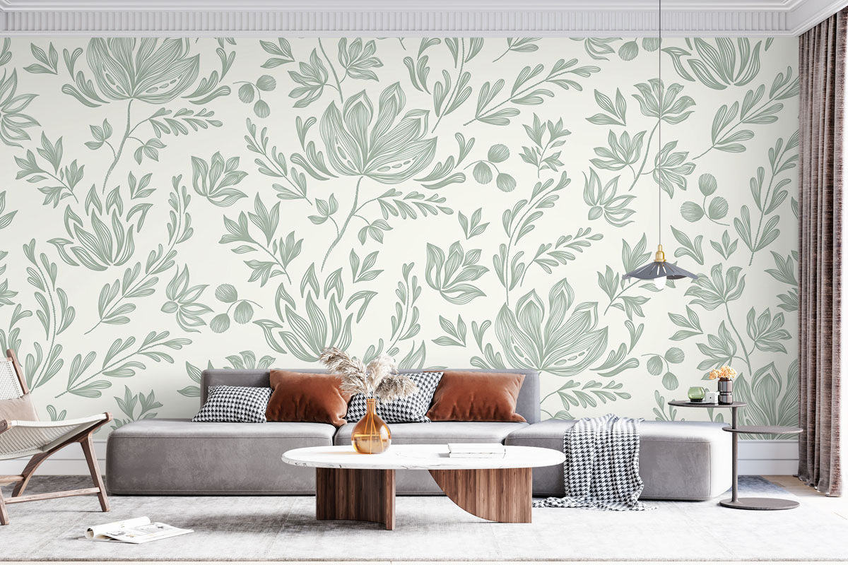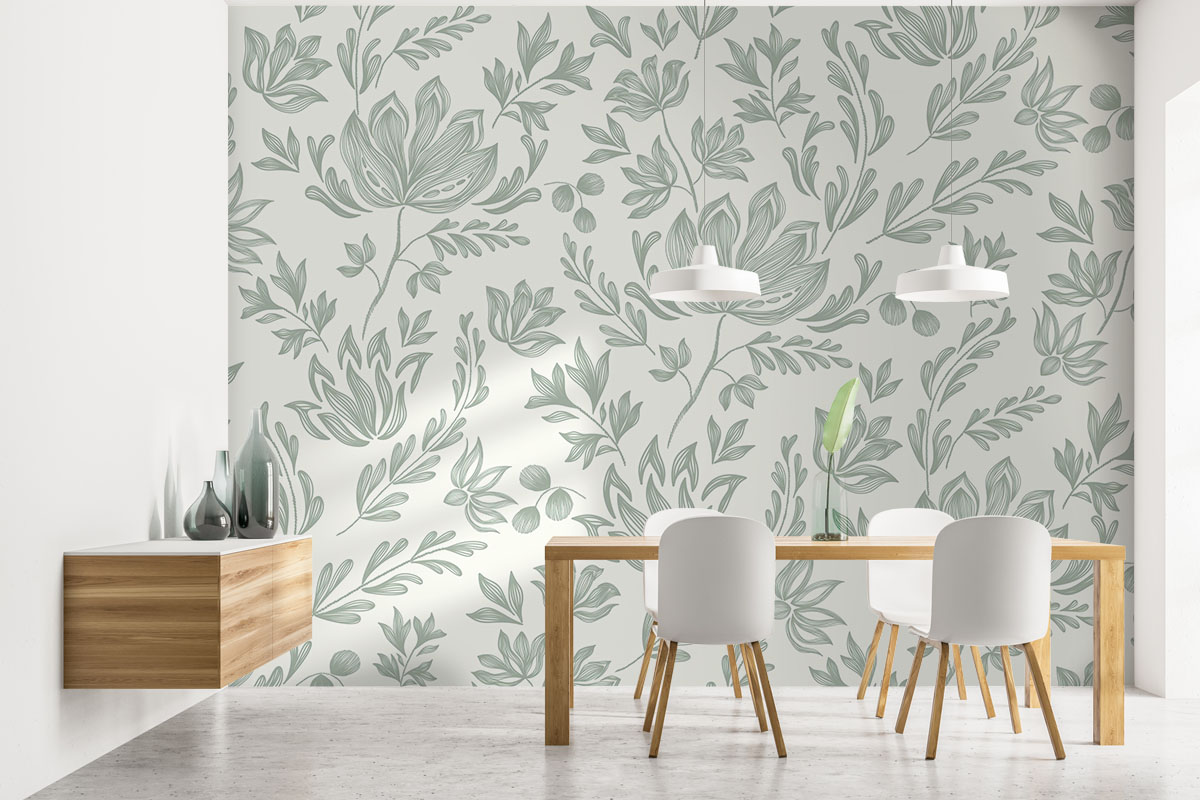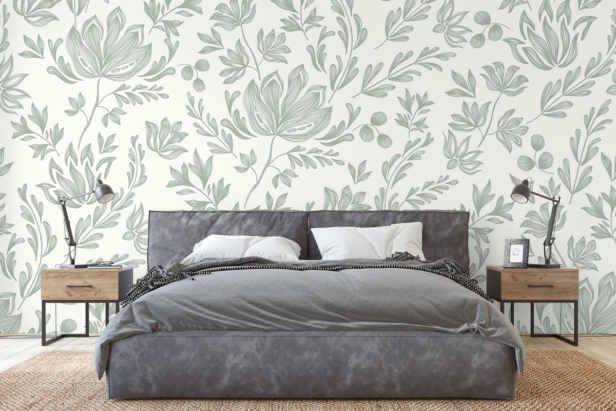 Botanisch patroon met lotusbloemen en ranken in saliegroen en eucalyptus op crème. Zacht en klassiek.