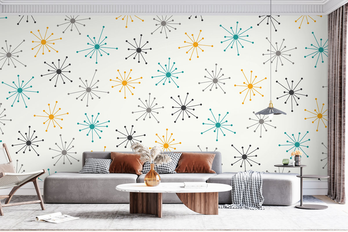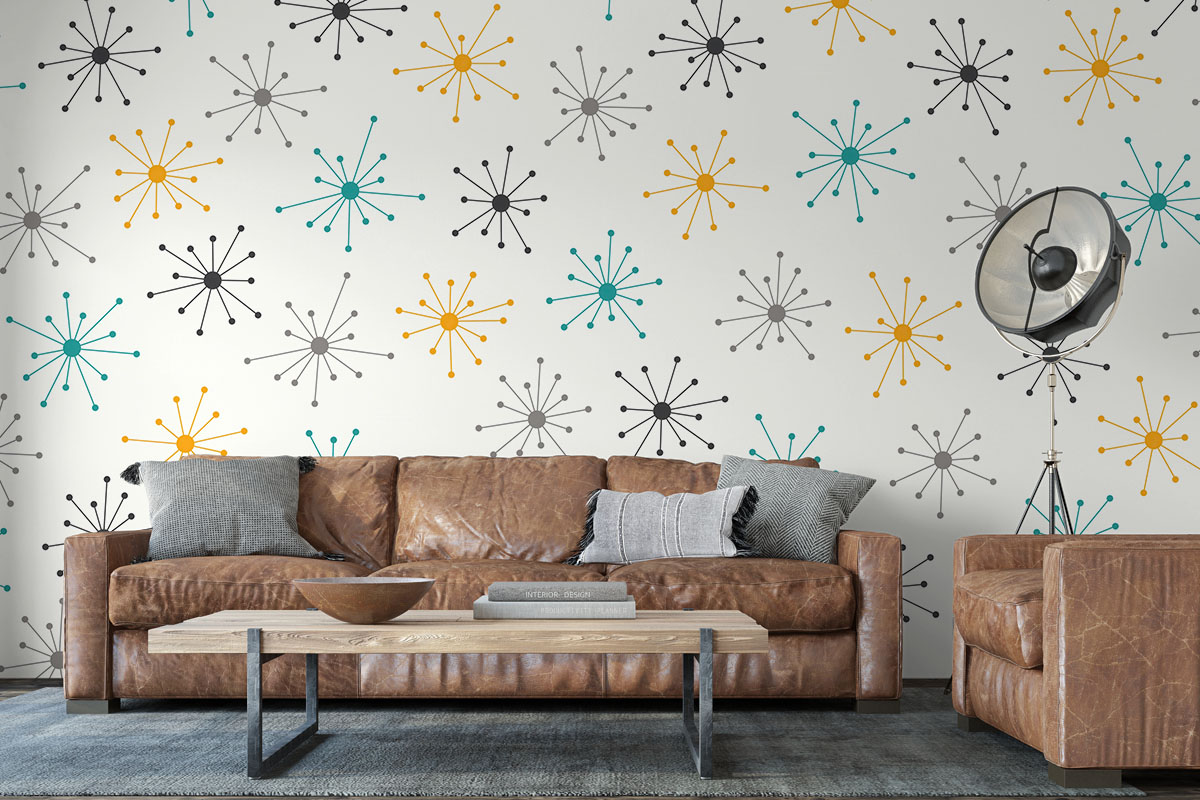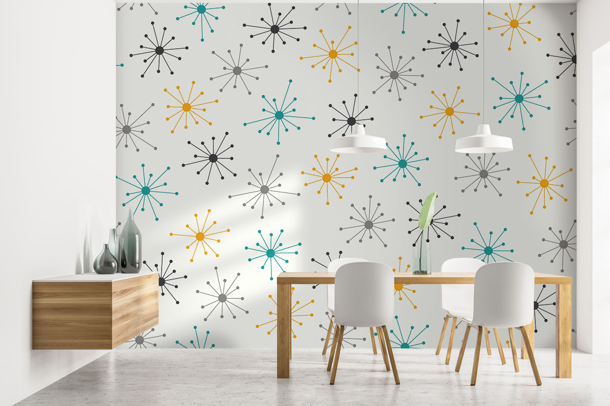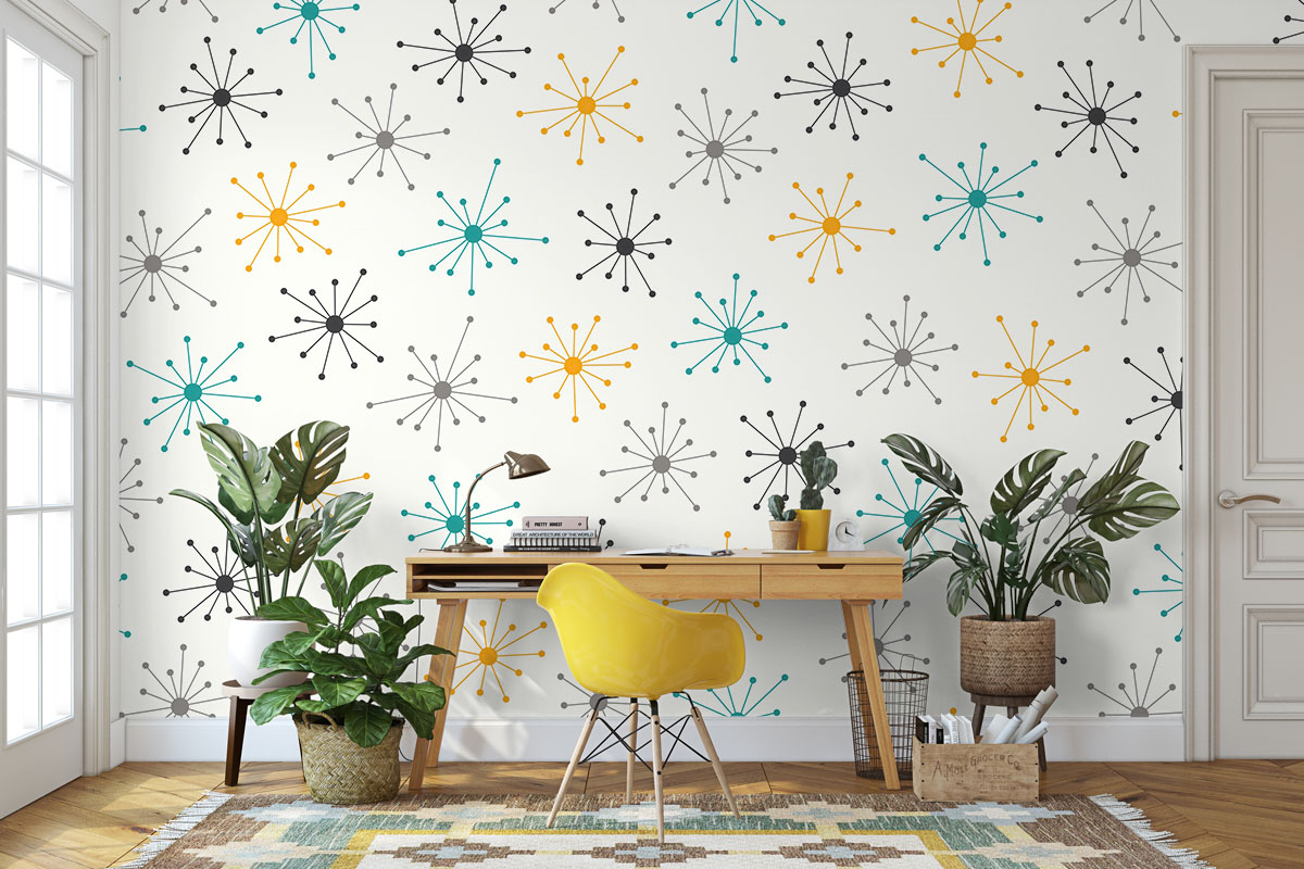 Wil je de muur combineren met verf? We hebben drie Flexa Pure kleuren geselecteerd die perfect matchen met dit fotobehang Midcentury pulse. Zo creëer je eenvoudig een harmonieus interieur.