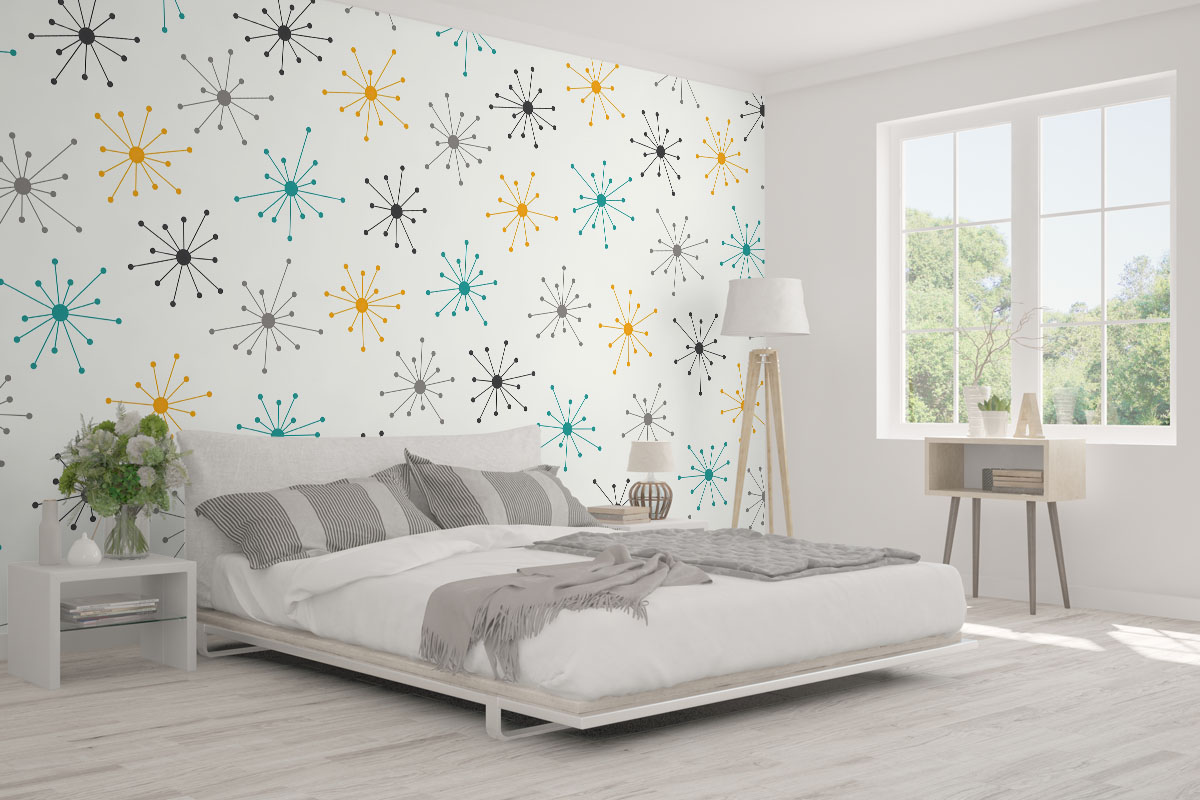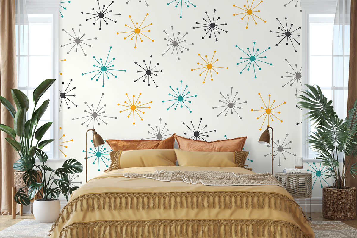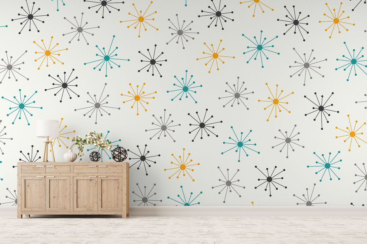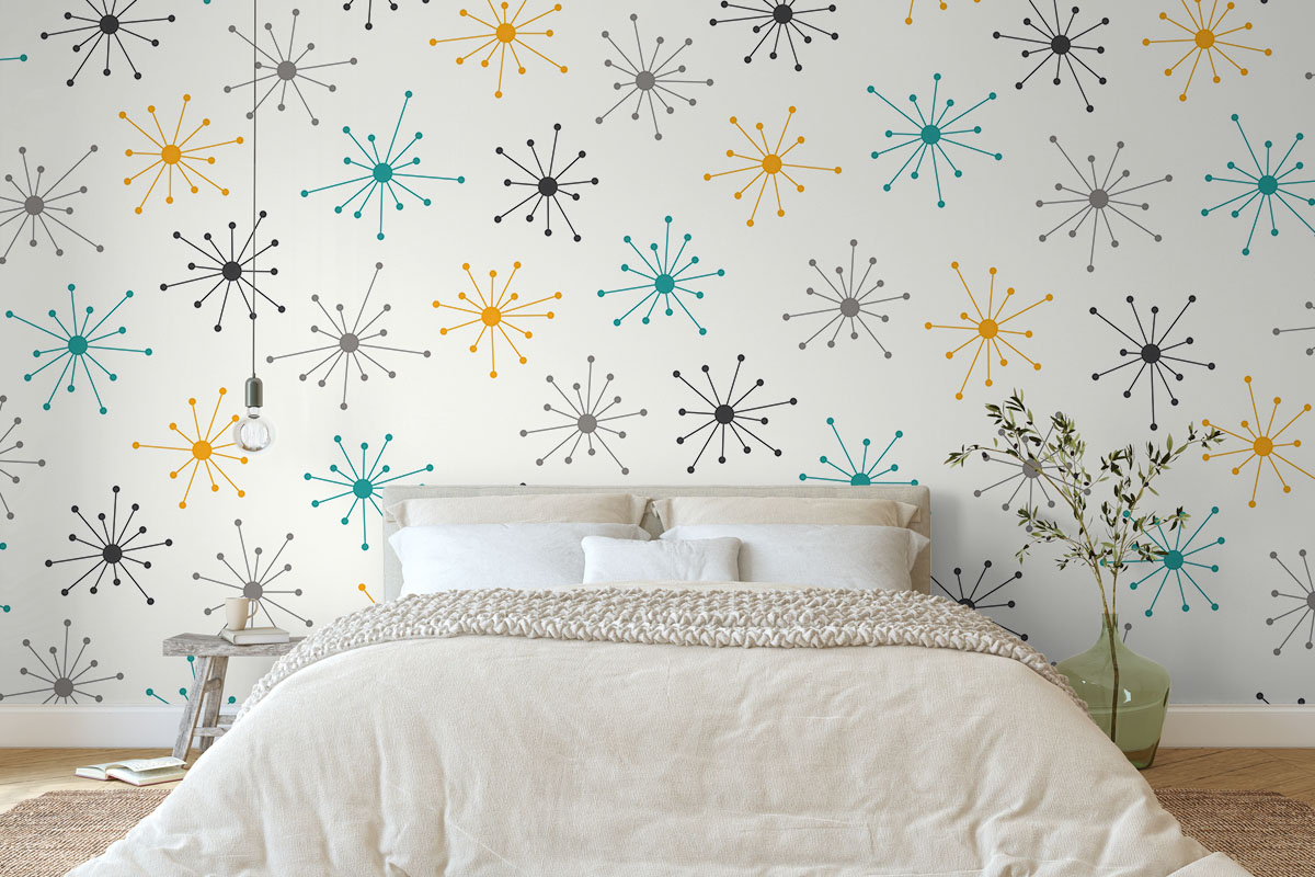 Wil je de muur combineren met verf? We hebben drie Flexa Pure kleuren geselecteerd die perfect matchen met dit fotobehang Midcentury pulse. Zo creëer je eenvoudig een harmonieus interieur.