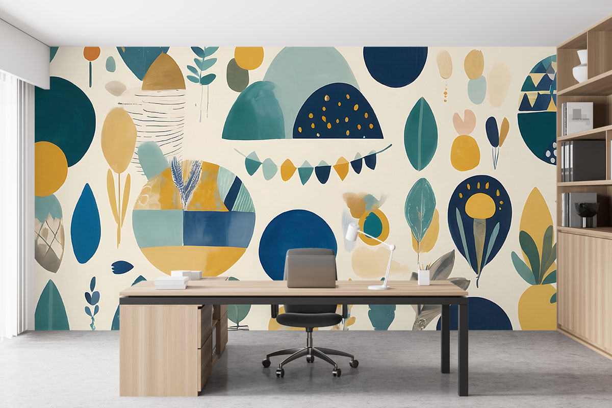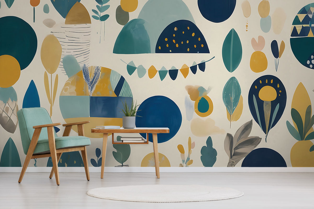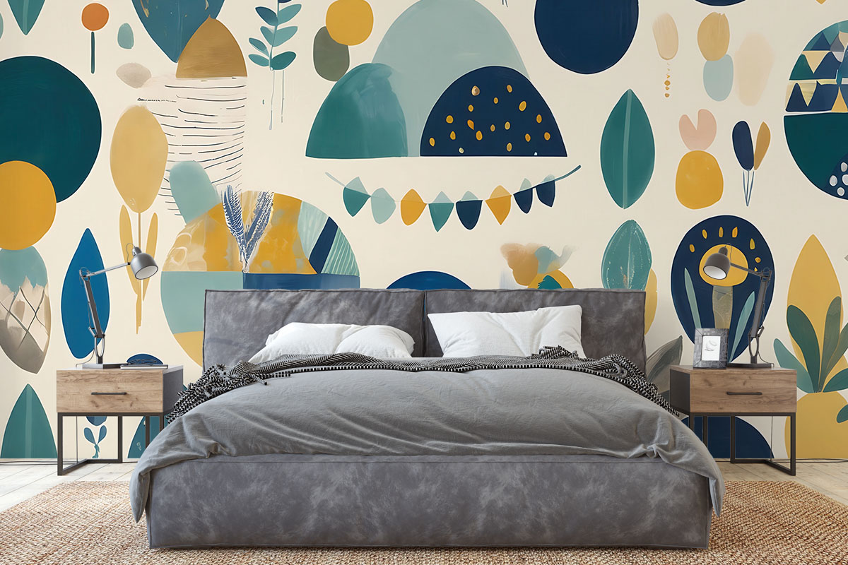 Geometrisch patroon met bladmotieven in petrol, mosterd en mintgroen. Fris Scandinavisch design.