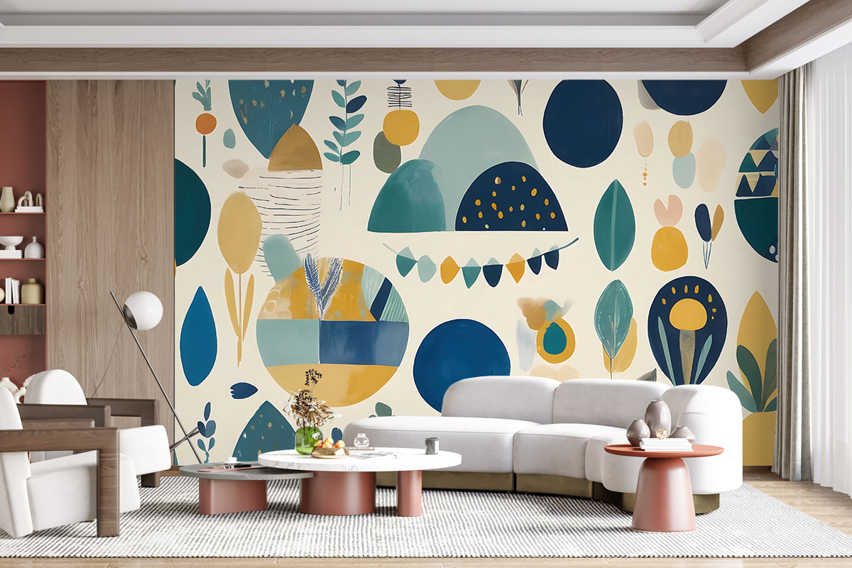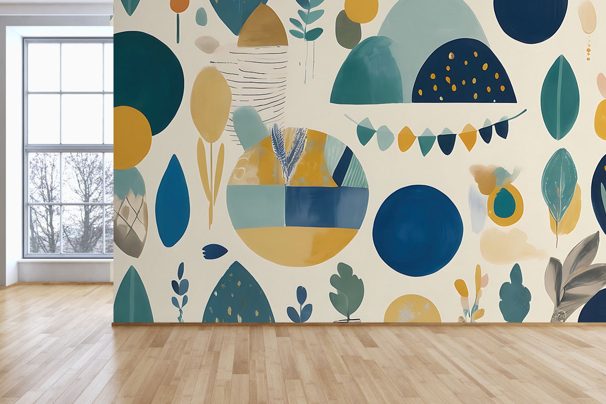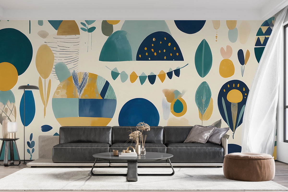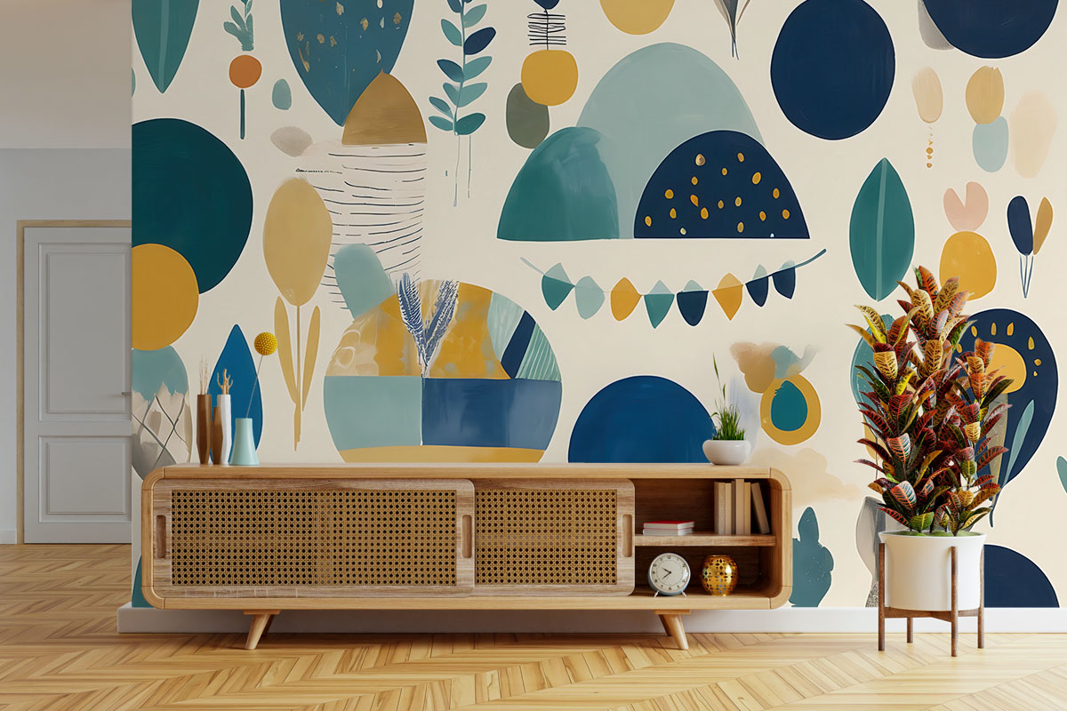 Geometrisch patroon met bladmotieven in petrol, mosterd en mintgroen. Fris Scandinavisch design.