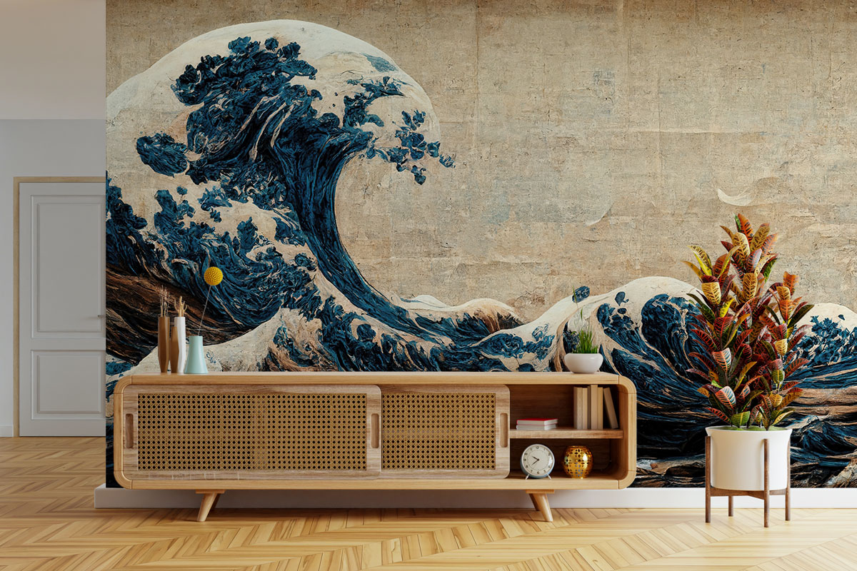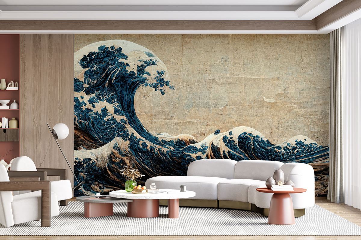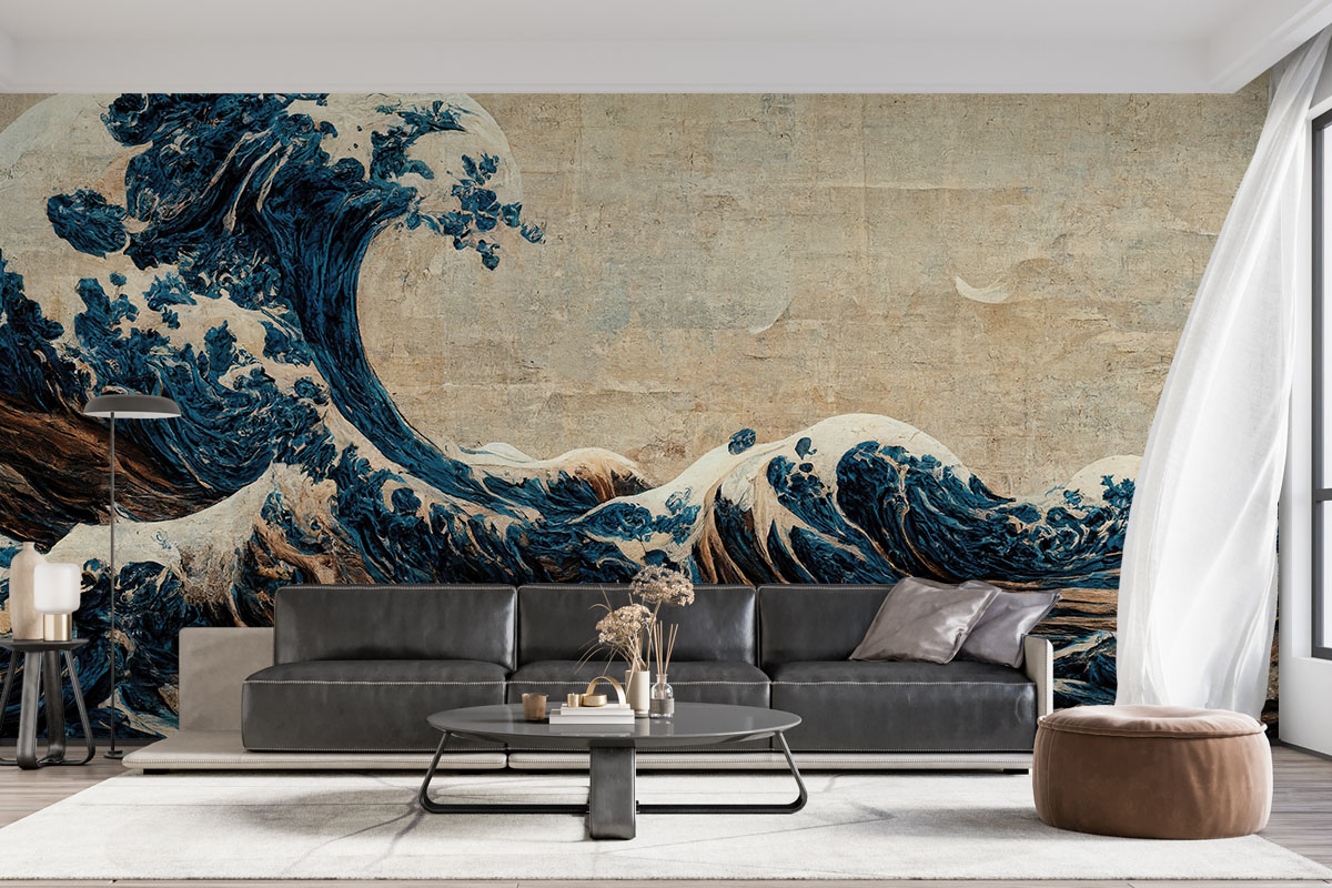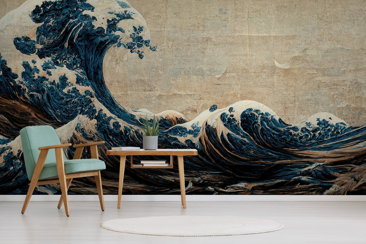 Een tijdloze interpretatie van de Hokusai golf in diepblauw en sepia. Dynamiek en rust in één klassiek kunstwerk.