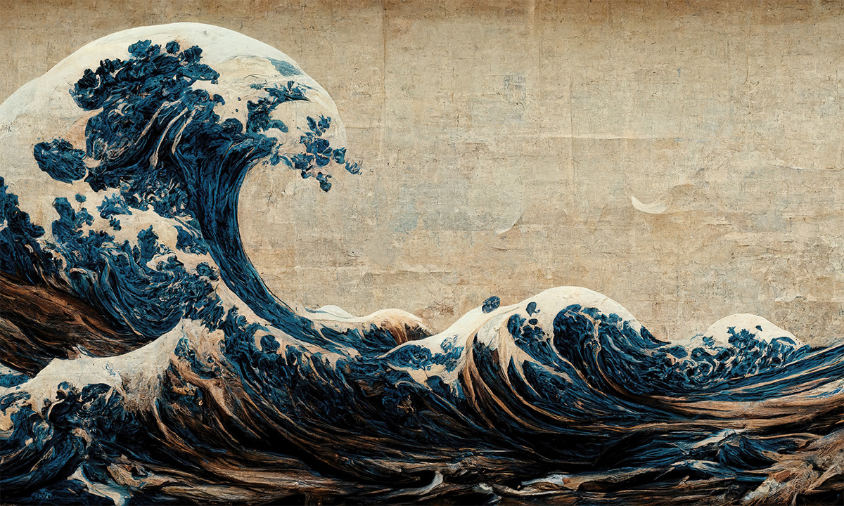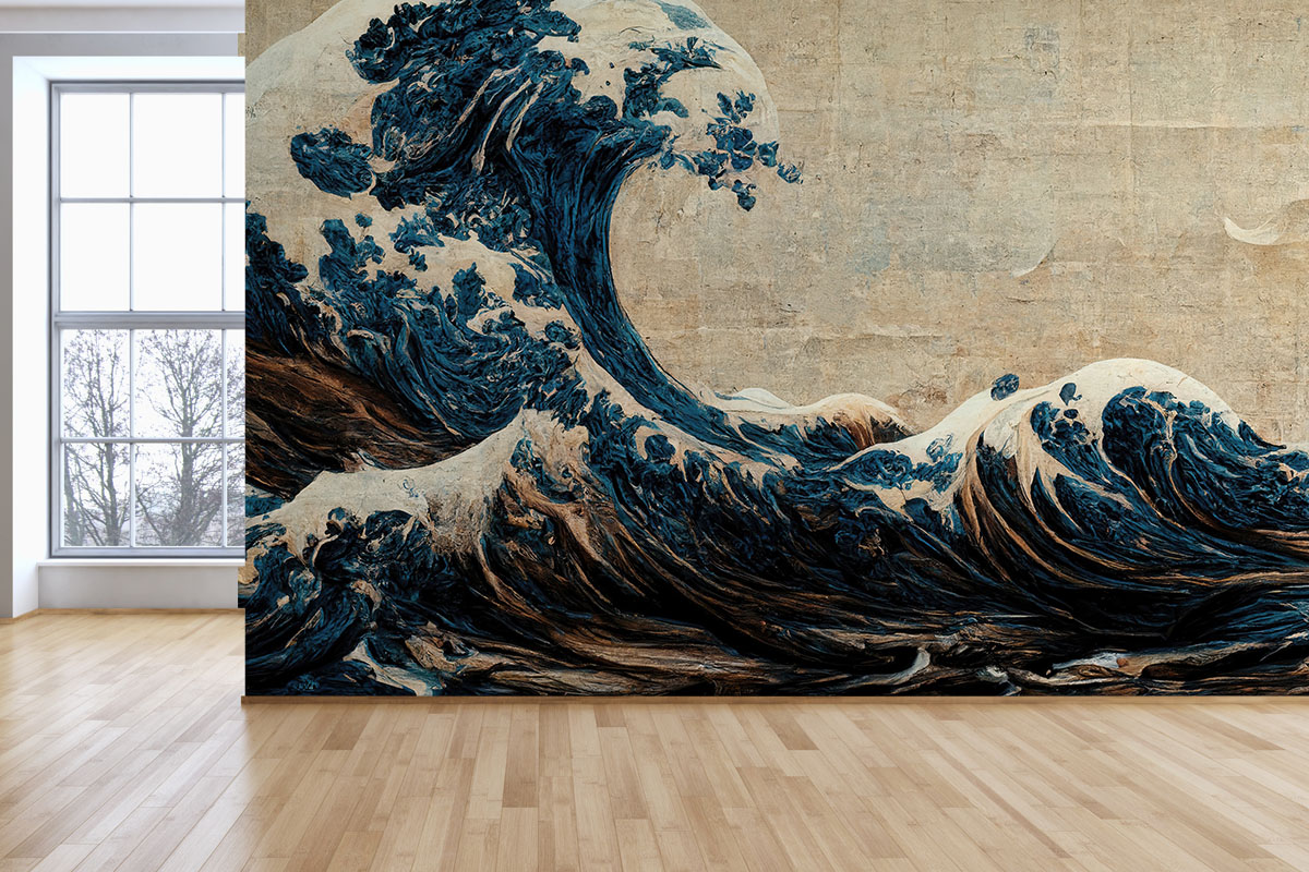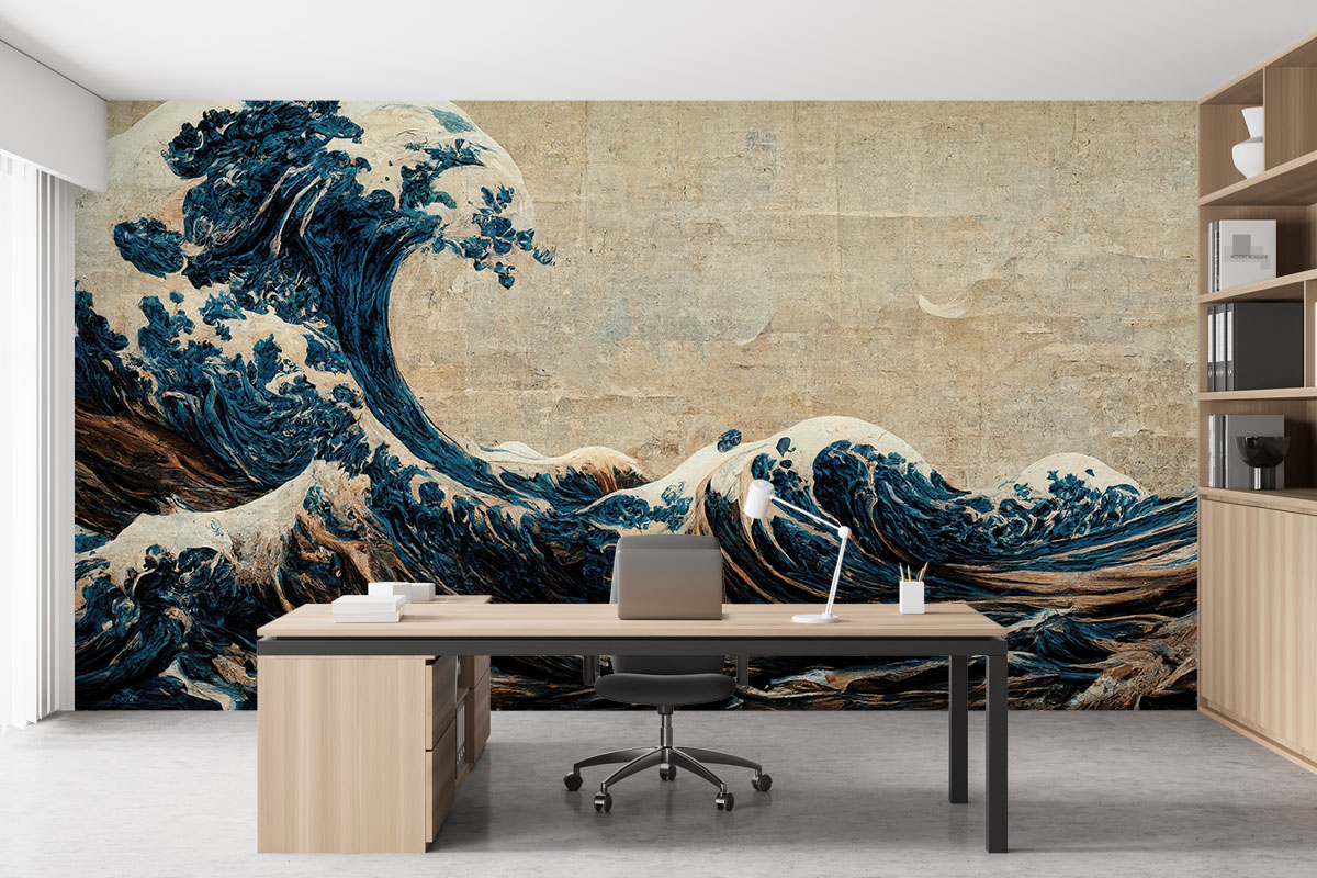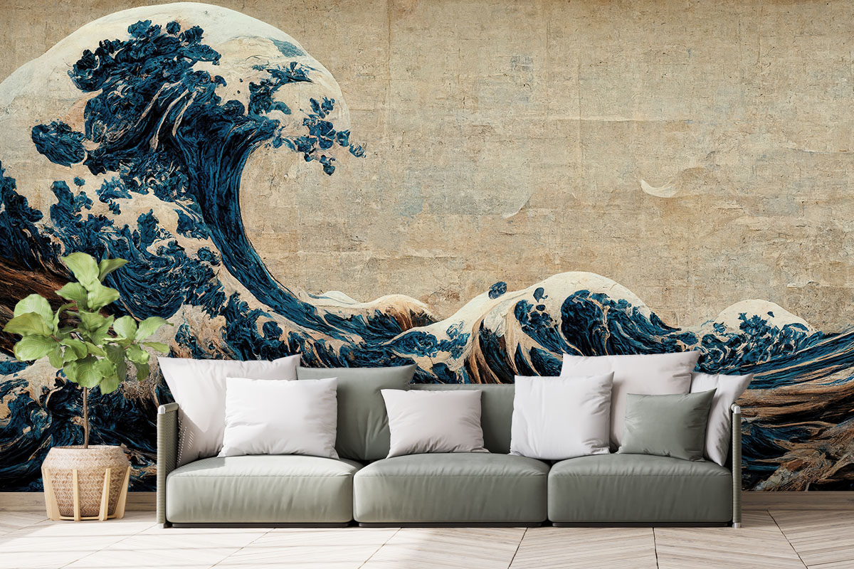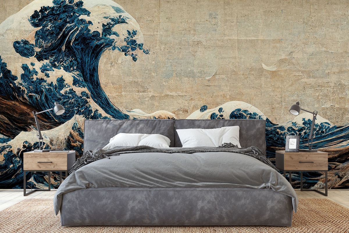 Een tijdloze interpretatie van de Hokusai golf in diepblauw en sepia. Dynamiek en rust in één klassiek kunstwerk.