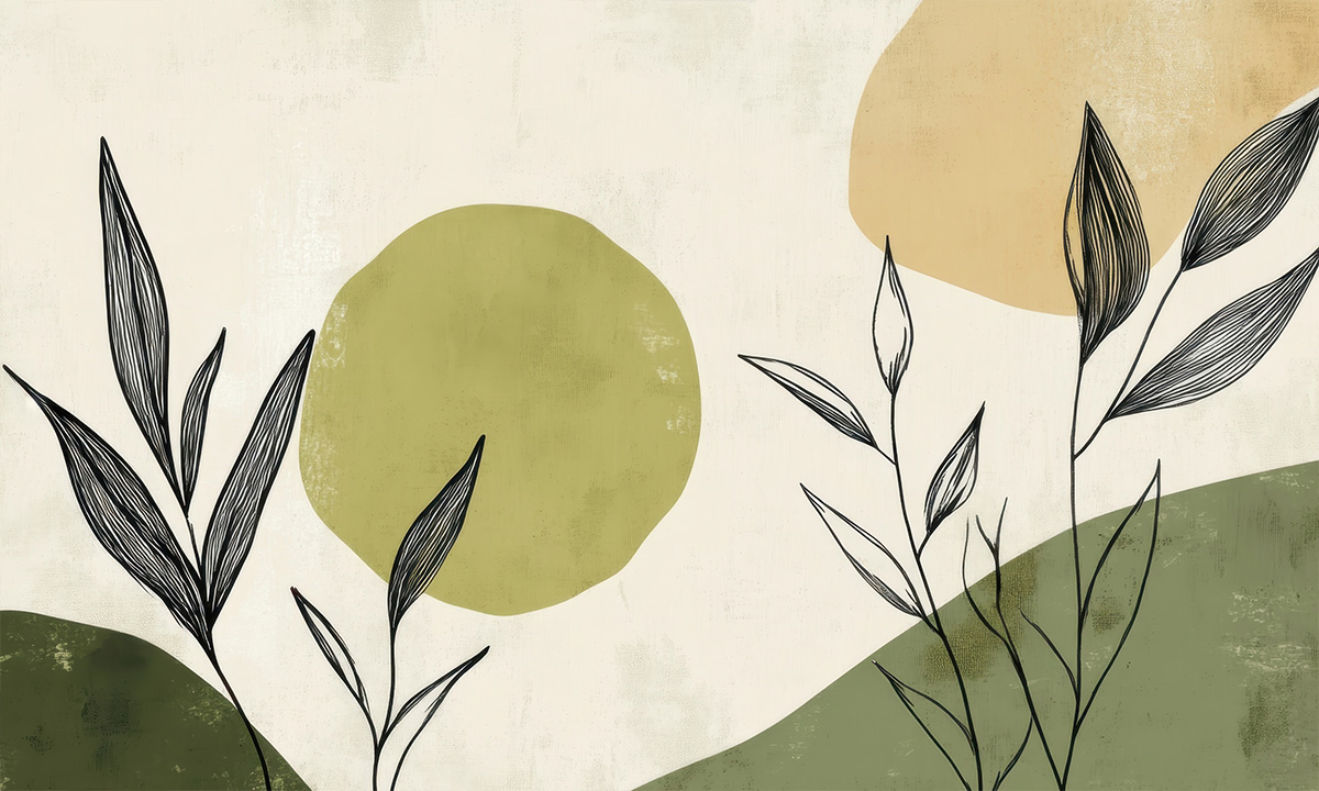 Abstract landschap met bladeren en organische vormen in olijfgroen en oker. Rustig en natuurlijk.