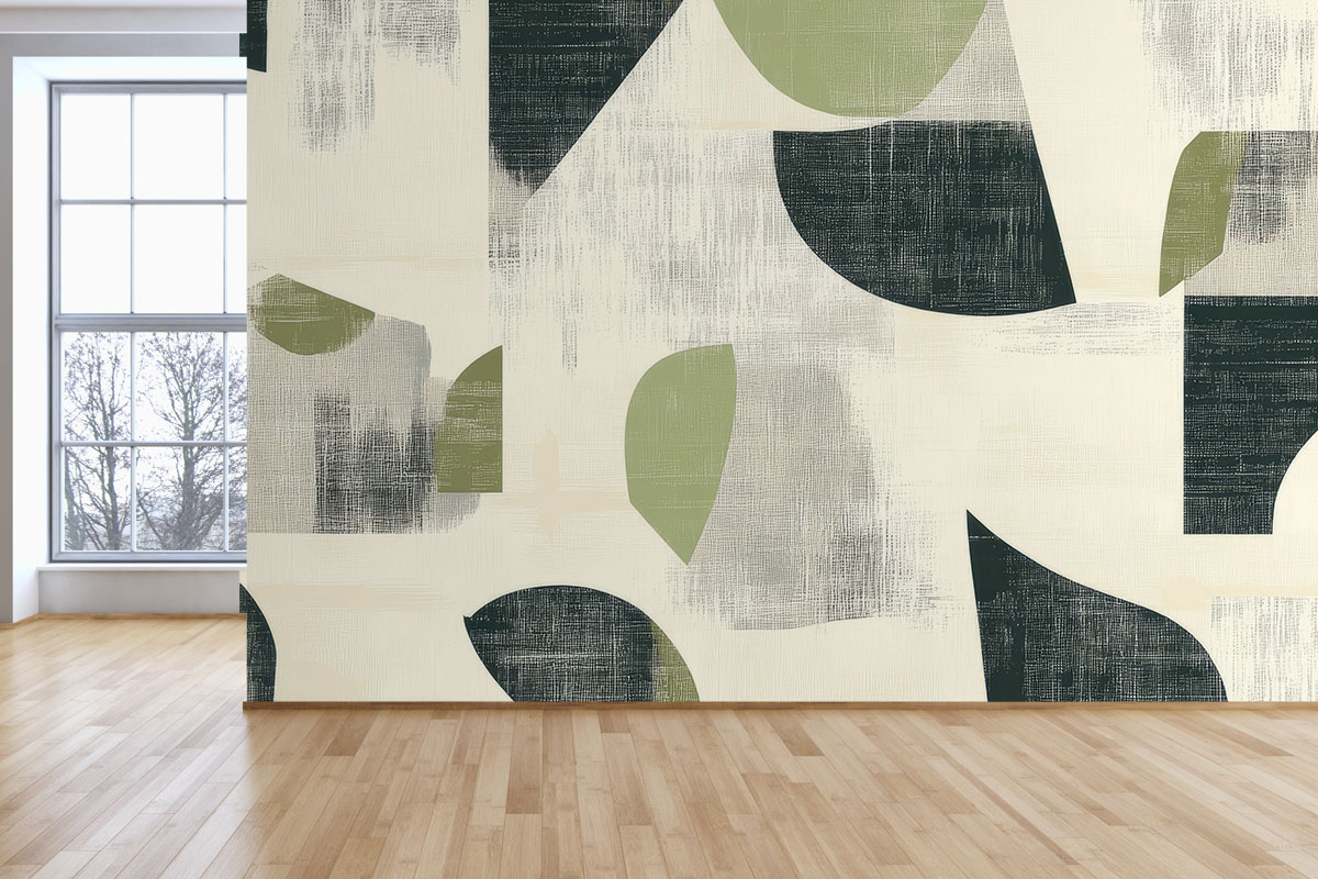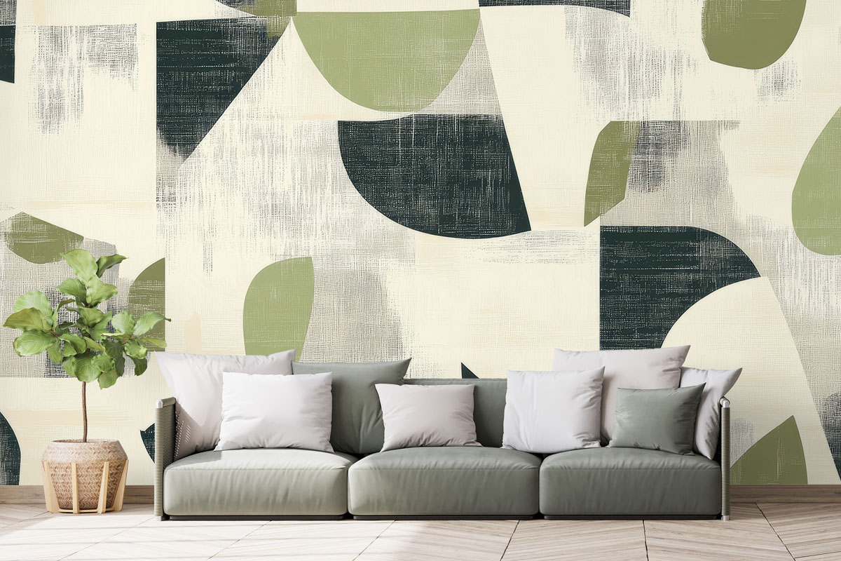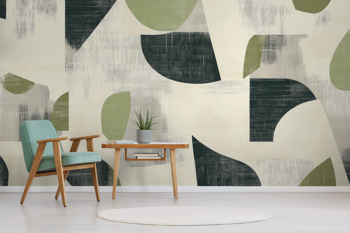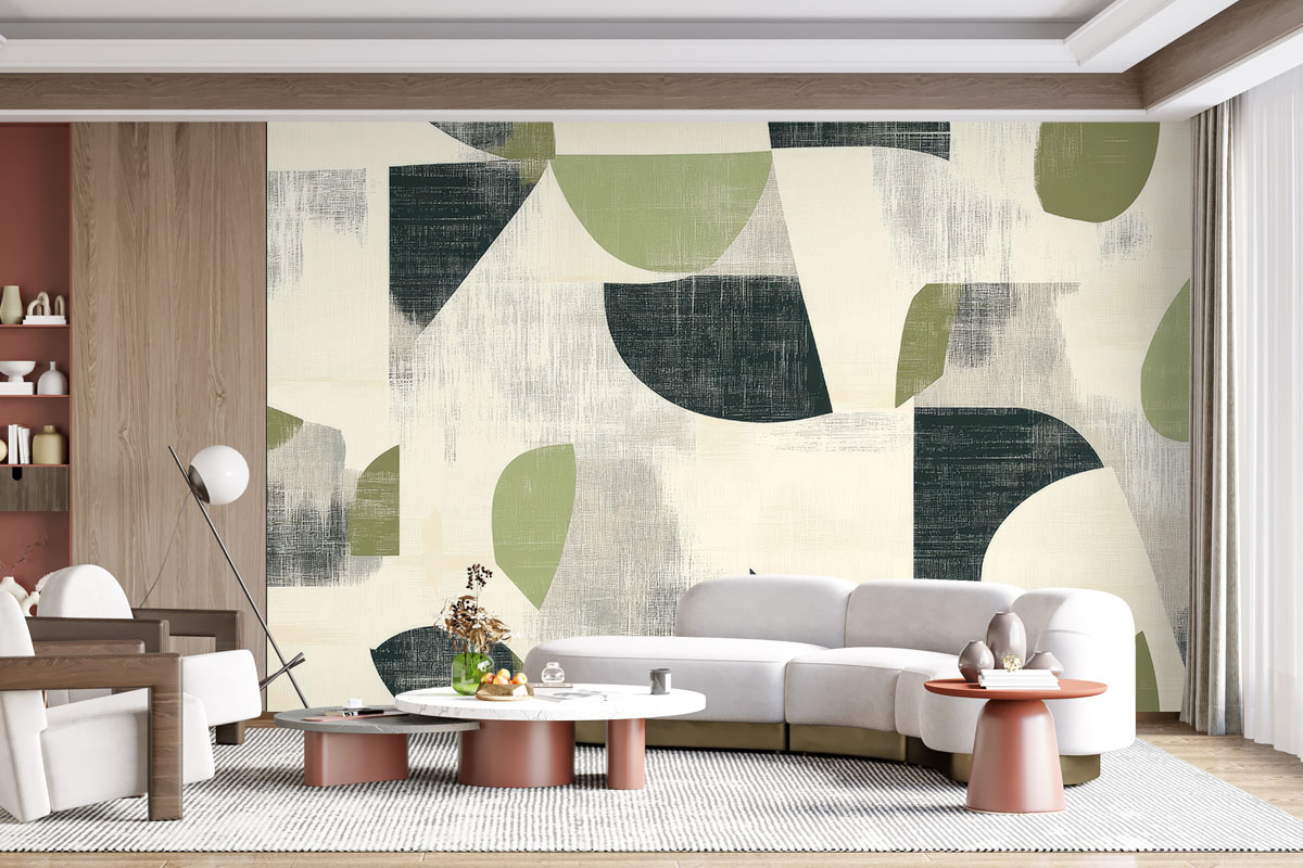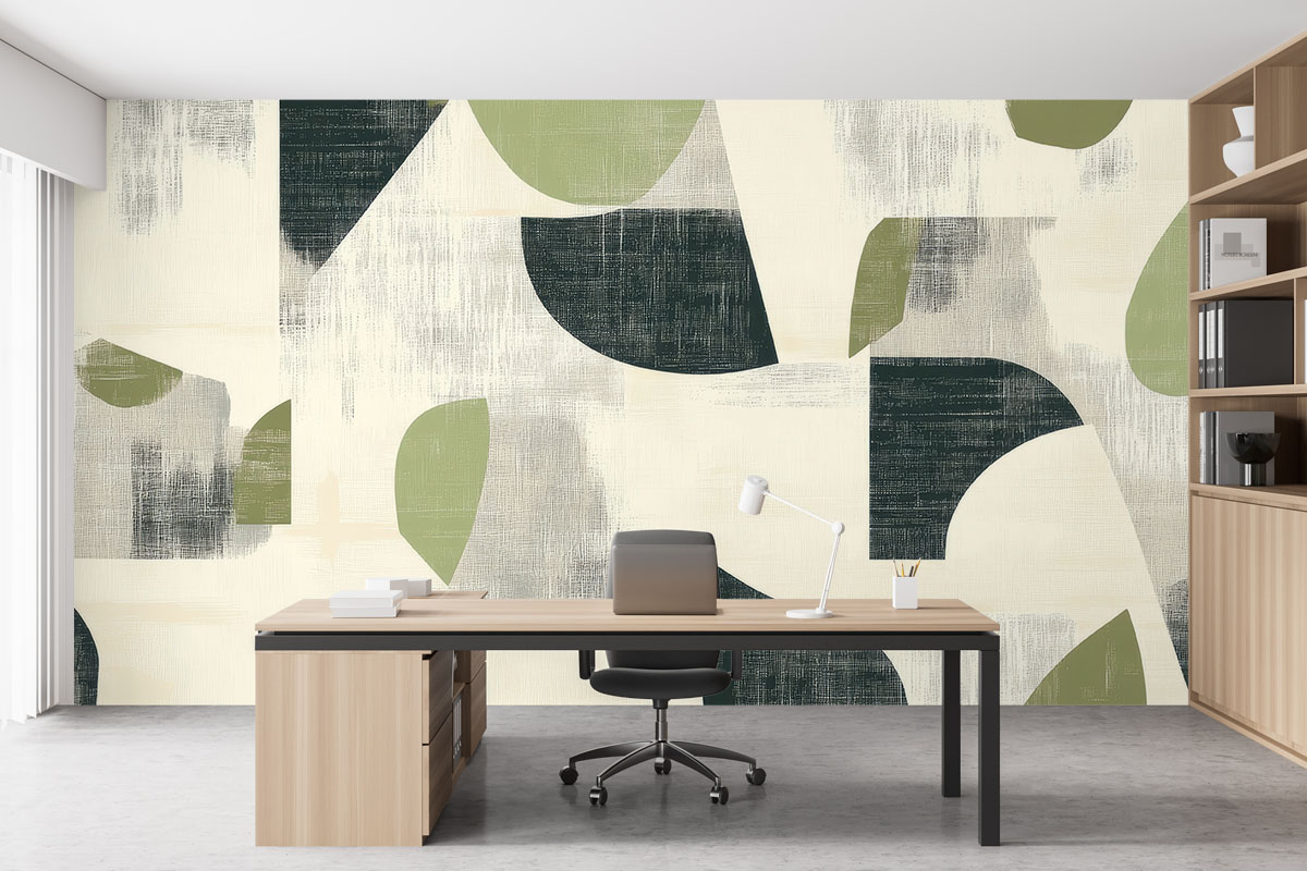 Zachte geometrische vormen in olijf en zandbeige vloeien samen. Een modern ontwerp met subtiele textuur en diepte.