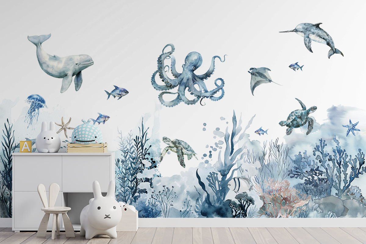 Wil je naast het behang ook een muur in de baby- of kinderkamer verven? Wij hebben alvast 3 Flexa Pure kleuren geselecteerd die perfect passen bij dit fotobehang Onder de blauwe zee.