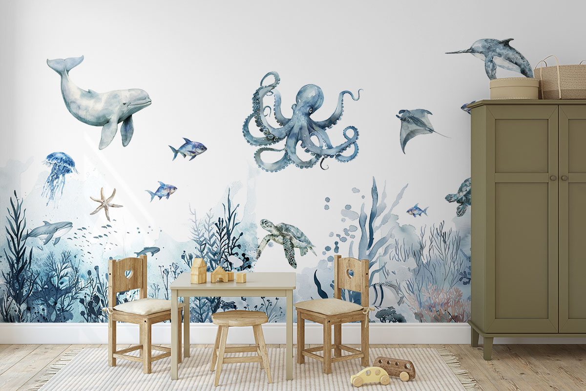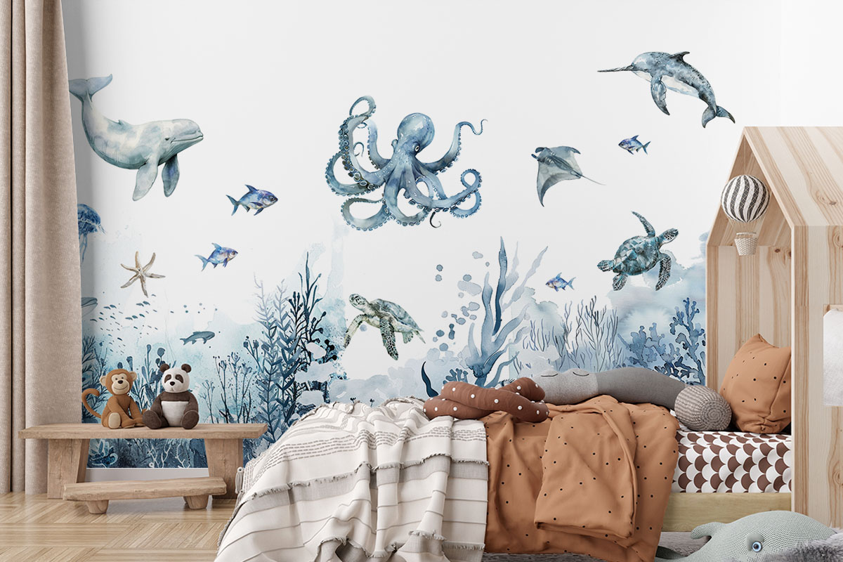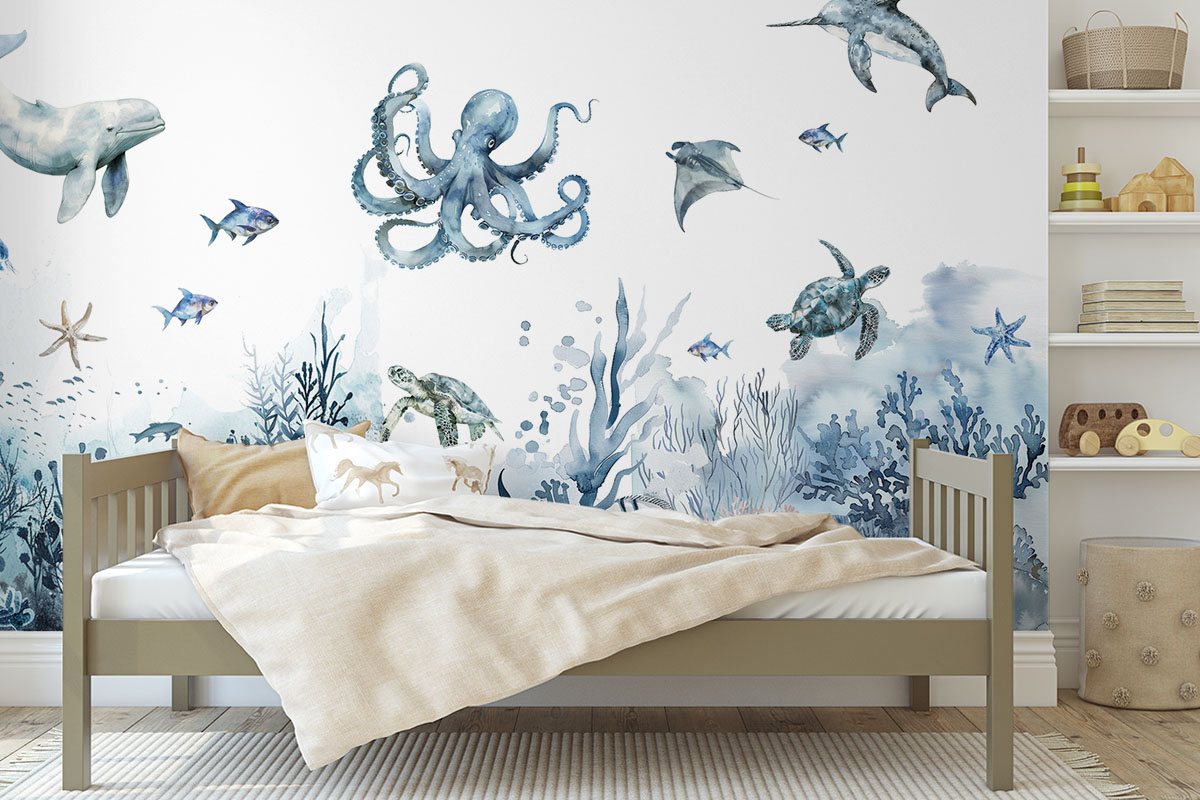 Jouw design Onder de blauwe zee wordt geprint op hoogwaardig duurzaam vliesbehang van premium kwaliteit. Dit stevige behang (200 g/m²) is krasvast, robuust en blijft jarenlang mooi — perfect voor in de kinderkamer, babykamer of speelkamer. Je kunt het behang helemaal op maat laten maken, zodat het ontwerp precies past op jouw muur. Dankzij de gladde afwerking en strakke structuur komt elk detail van het ontwerp perfect tot zijn recht.