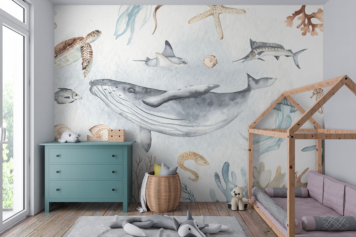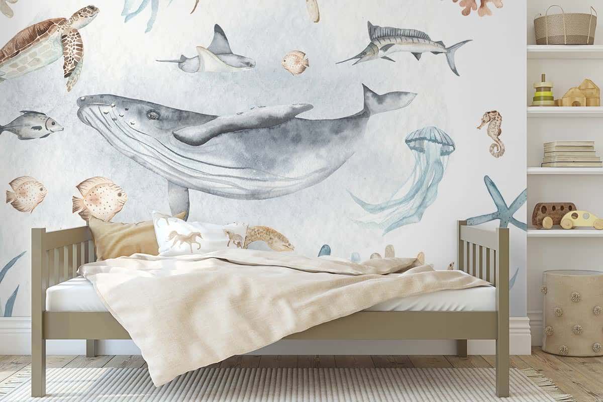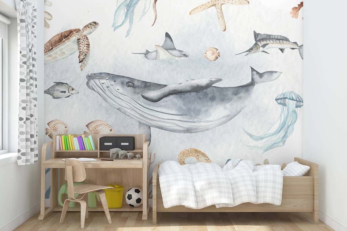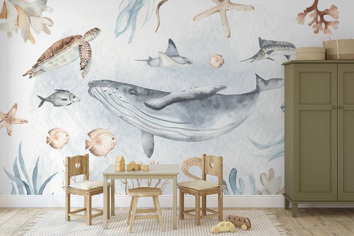 Wauw, wat een mooie onderwaterdieren vind je op dit behang! Een schildpad, zeepaardjes en zelfs een grote walvis… Alsof je diep in de zee bent!