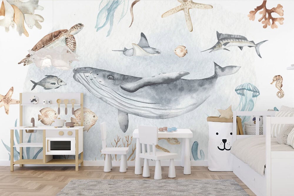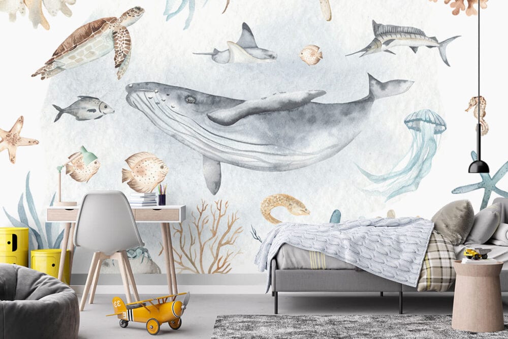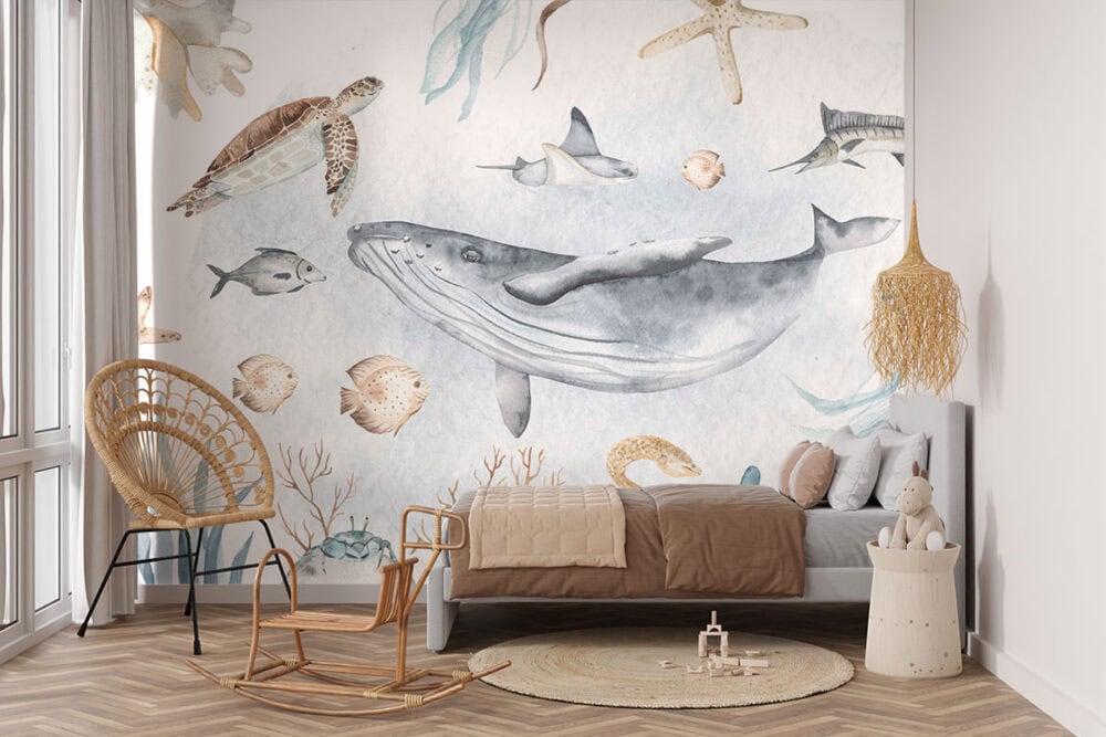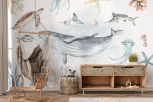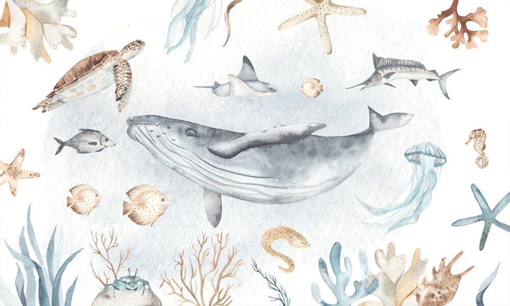 Wauw, wat een mooie onderwaterdieren vind je op dit behang! Een schildpad, zeepaardjes en zelfs een grote walvis… Alsof je diep in de zee bent!
