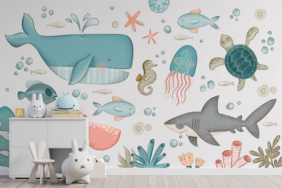 Wil je naast het behang ook een muur in de baby- of kinderkamer verven? Wij hebben alvast 3 Flexa Pure kleuren geselecteerd die perfect passen bij dit fotobehang Onderwaterwereld met zeedieren.
