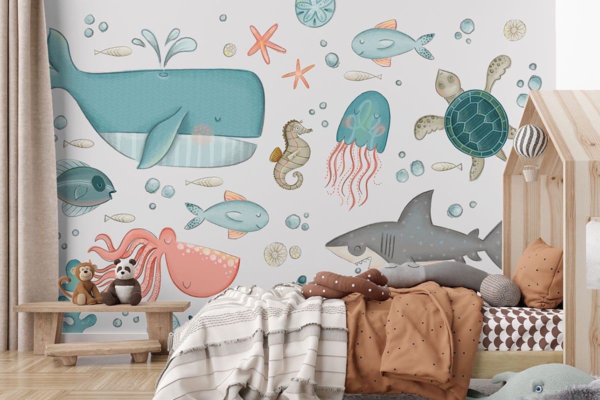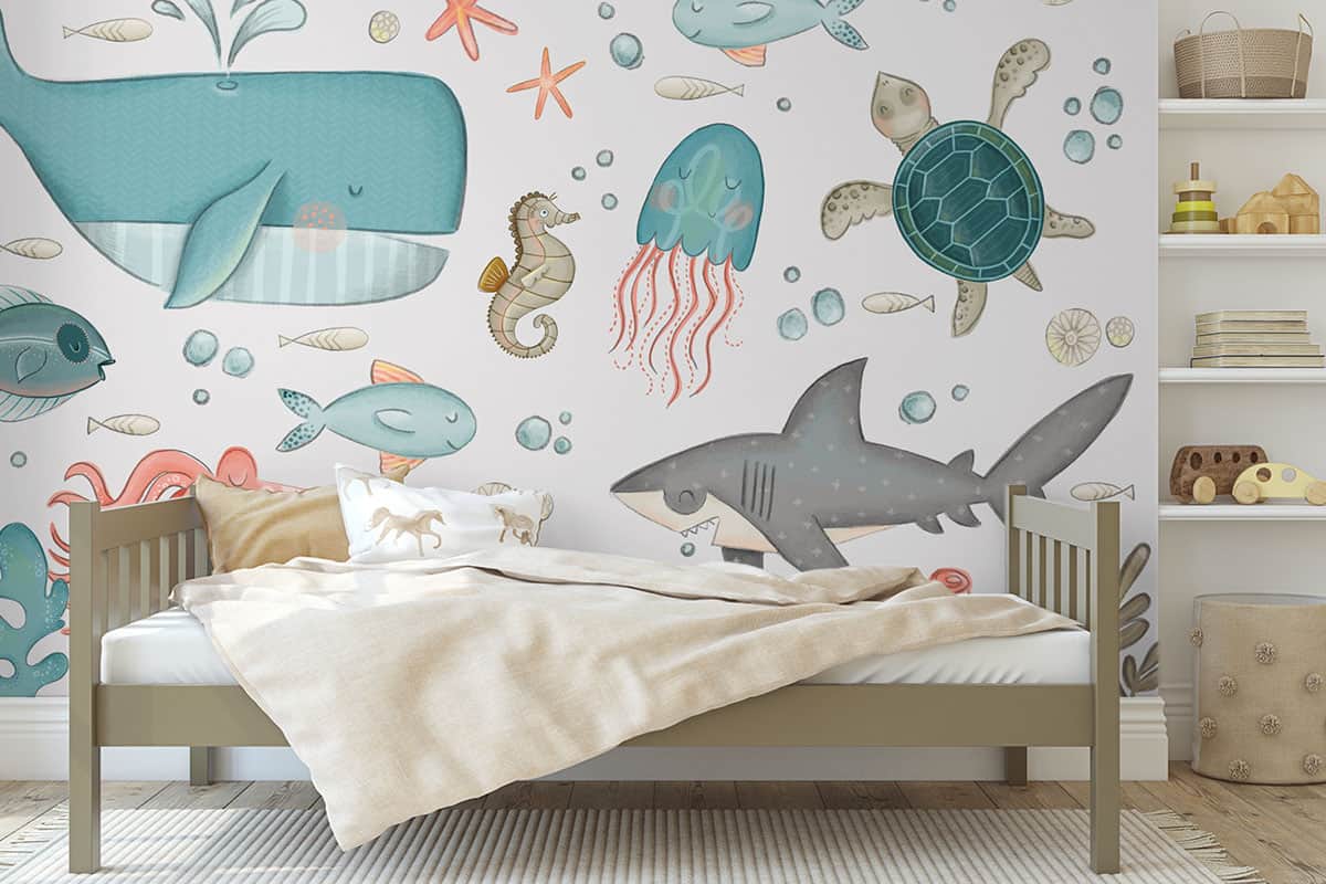 Jouw design Onderwaterwereld met zeedieren wordt geprint op hoogwaardig duurzaam vliesbehang van premium kwaliteit. Dit stevige behang (200 g/m²) is krasvast, robuust en blijft jarenlang mooi — perfect voor in de kinderkamer, babykamer of speelkamer. Je kunt het behang helemaal op maat laten maken, zodat het ontwerp precies past op jouw muur. Dankzij de gladde afwerking en strakke structuur komt elk detail van het ontwerp perfect tot zijn recht.