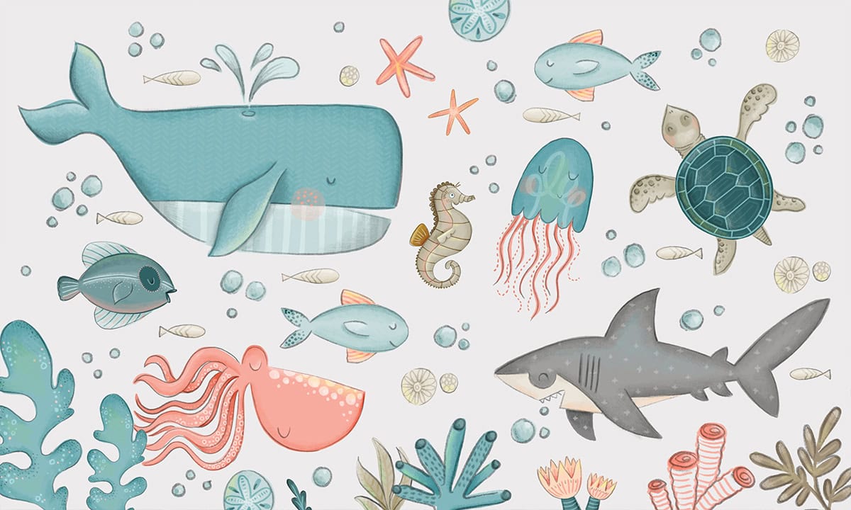 Wil je naast het behang ook een muur in de baby- of kinderkamer verven? Wij hebben alvast 3 Flexa Pure kleuren geselecteerd die perfect passen bij dit fotobehang Onderwaterwereld met zeedieren.