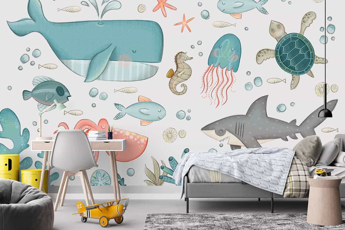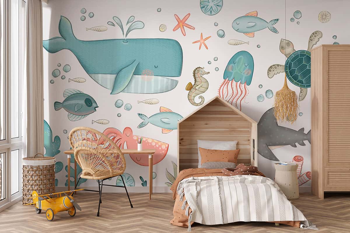 Jouw design Onderwaterwereld met zeedieren wordt geprint op hoogwaardig duurzaam vliesbehang van premium kwaliteit. Dit stevige behang (200 g/m²) is krasvast, robuust en blijft jarenlang mooi — perfect voor in de kinderkamer, babykamer of speelkamer. Je kunt het behang helemaal op maat laten maken, zodat het ontwerp precies past op jouw muur. Dankzij de gladde afwerking en strakke structuur komt elk detail van het ontwerp perfect tot zijn recht.