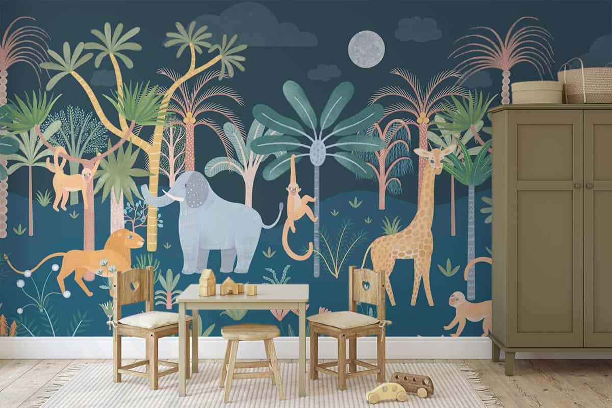 Jouw design Op de savanne bij nacht wordt geprint op hoogwaardig duurzaam vliesbehang van premium kwaliteit. Dit stevige behang (200 g/m²) is krasvast, robuust en blijft jarenlang mooi — perfect voor in de kinderkamer, babykamer of speelkamer. Je kunt het behang helemaal op maat laten maken, zodat het ontwerp precies past op jouw muur. Dankzij de gladde afwerking en strakke structuur komt elk detail van het ontwerp perfect tot zijn recht.