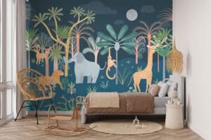 Jouw design Op de savanne bij nacht wordt geprint op hoogwaardig duurzaam vliesbehang van premium kwaliteit. Dit stevige behang (200 g/m²) is krasvast, robuust en blijft jarenlang mooi — perfect voor in de kinderkamer, babykamer of speelkamer. Je kunt het behang helemaal op maat laten maken, zodat het ontwerp precies past op jouw muur. Dankzij de gladde afwerking en strakke structuur komt elk detail van het ontwerp perfect tot zijn recht.