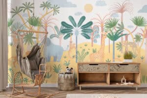 Jouw design Op de savanne in de zon wordt geprint op hoogwaardig duurzaam vliesbehang van premium kwaliteit. Dit stevige behang (200 g/m²) is krasvast, robuust en blijft jarenlang mooi — perfect voor in de kinderkamer, babykamer of speelkamer. Je kunt het behang helemaal op maat laten maken, zodat het ontwerp precies past op jouw muur. Dankzij de gladde afwerking en strakke structuur komt elk detail van het ontwerp perfect tot zijn recht.