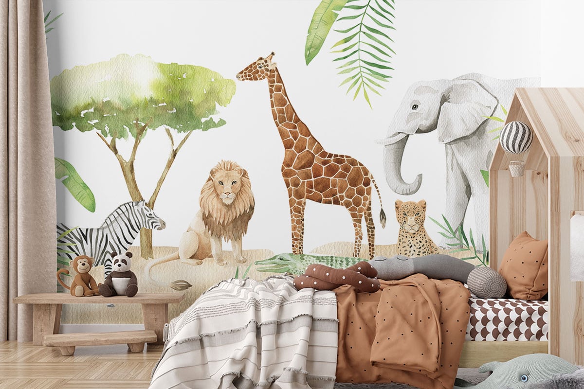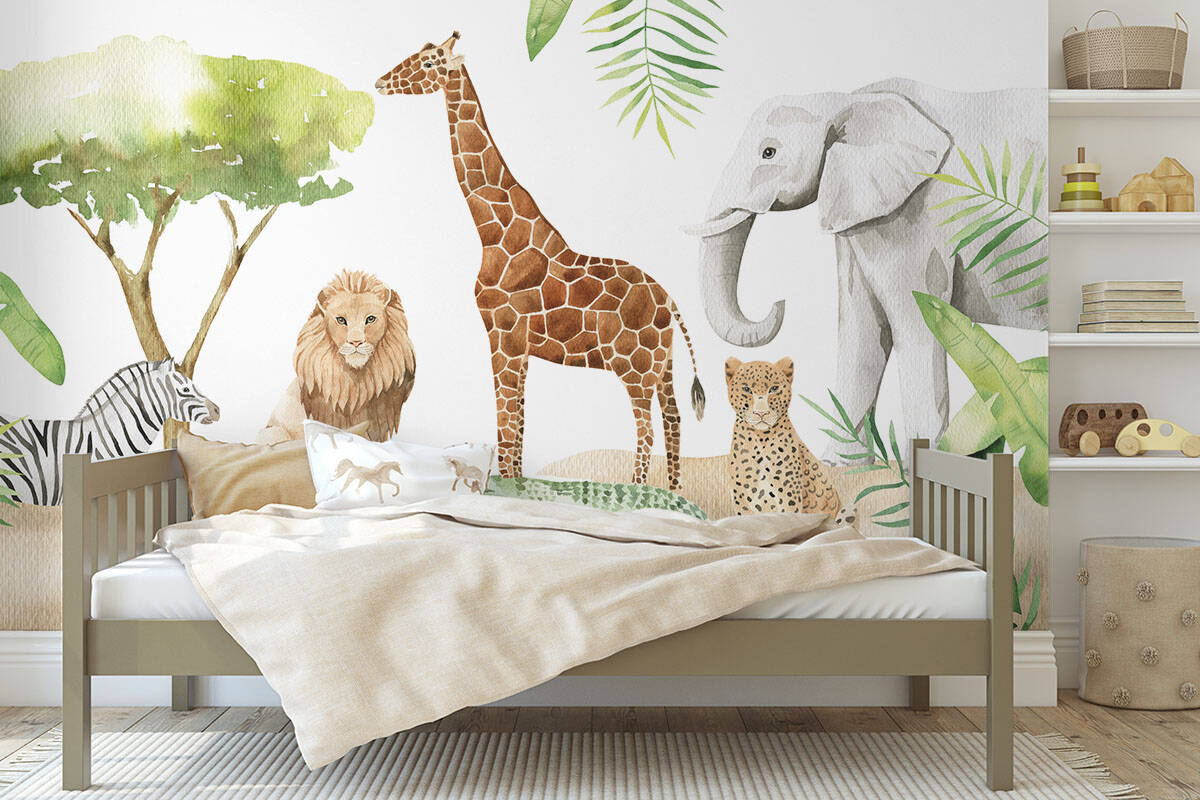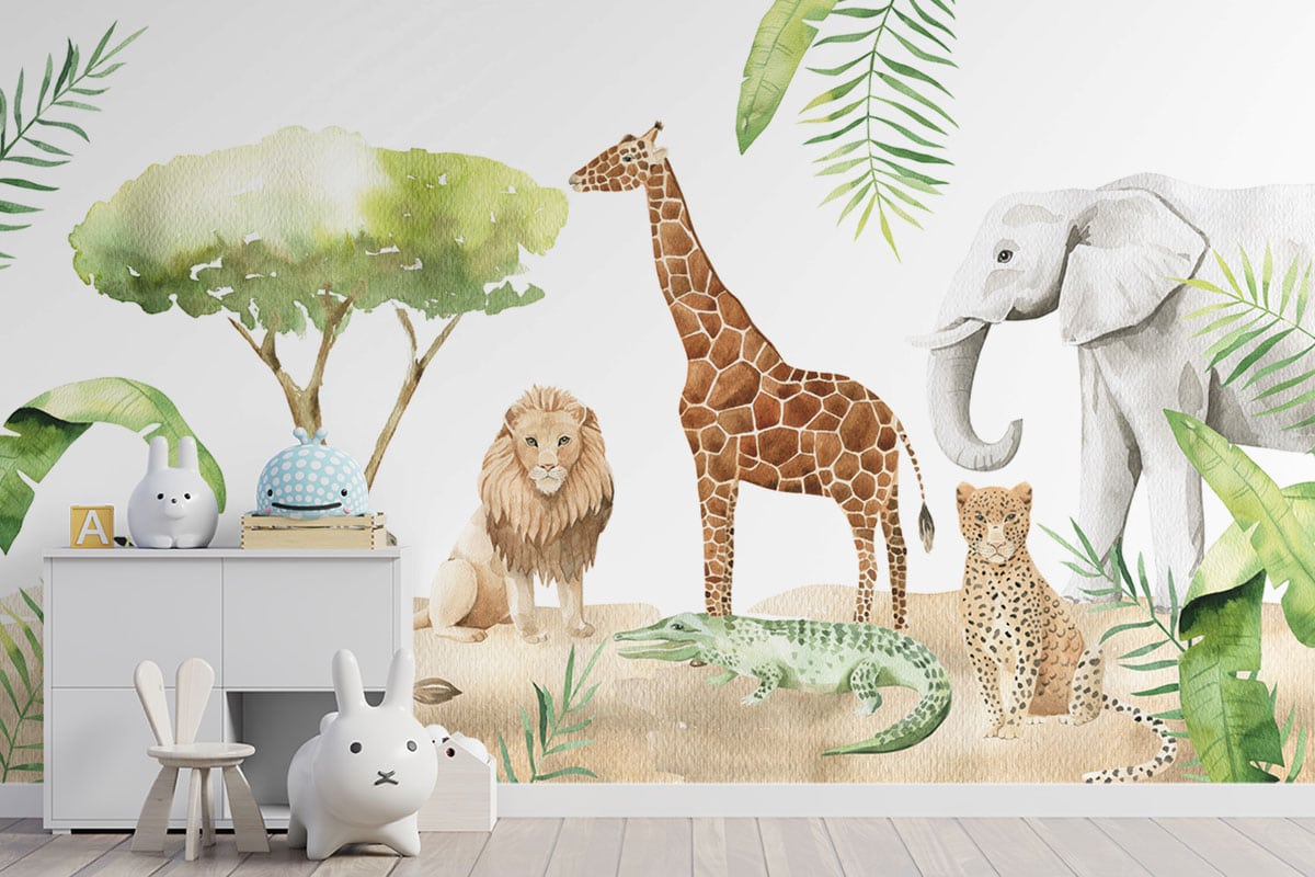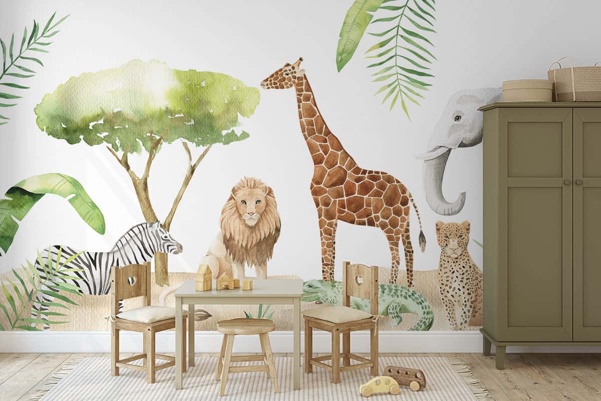 Jouw design Op safari in Afrika wordt geprint op hoogwaardig duurzaam vliesbehang van premium kwaliteit. Dit stevige behang (200 g/m²) is krasvast, robuust en blijft jarenlang mooi — perfect voor in de kinderkamer, babykamer of speelkamer. Je kunt het behang helemaal op maat laten maken, zodat het ontwerp precies past op jouw muur. Dankzij de gladde afwerking en strakke structuur komt elk detail van het ontwerp perfect tot zijn recht.