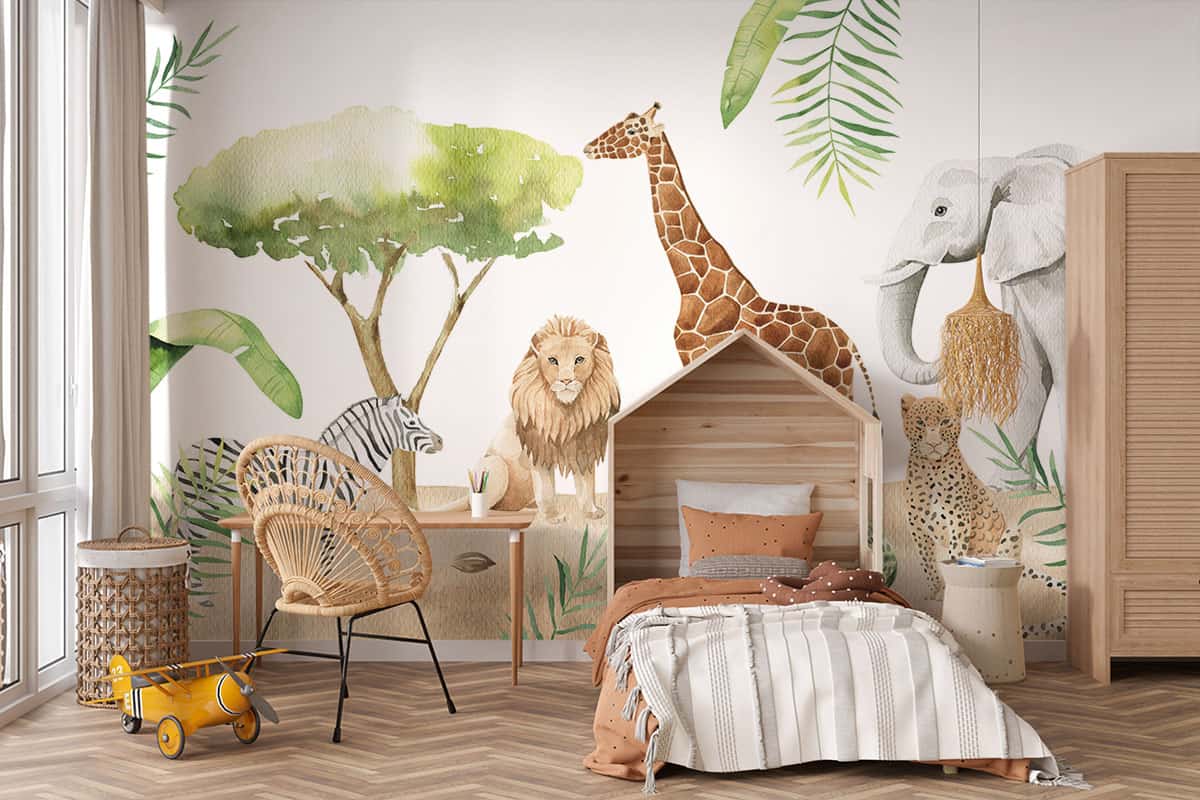 Jouw design Op safari in Afrika wordt geprint op hoogwaardig duurzaam vliesbehang van premium kwaliteit. Dit stevige behang (200 g/m²) is krasvast, robuust en blijft jarenlang mooi — perfect voor in de kinderkamer, babykamer of speelkamer. Je kunt het behang helemaal op maat laten maken, zodat het ontwerp precies past op jouw muur. Dankzij de gladde afwerking en strakke structuur komt elk detail van het ontwerp perfect tot zijn recht.