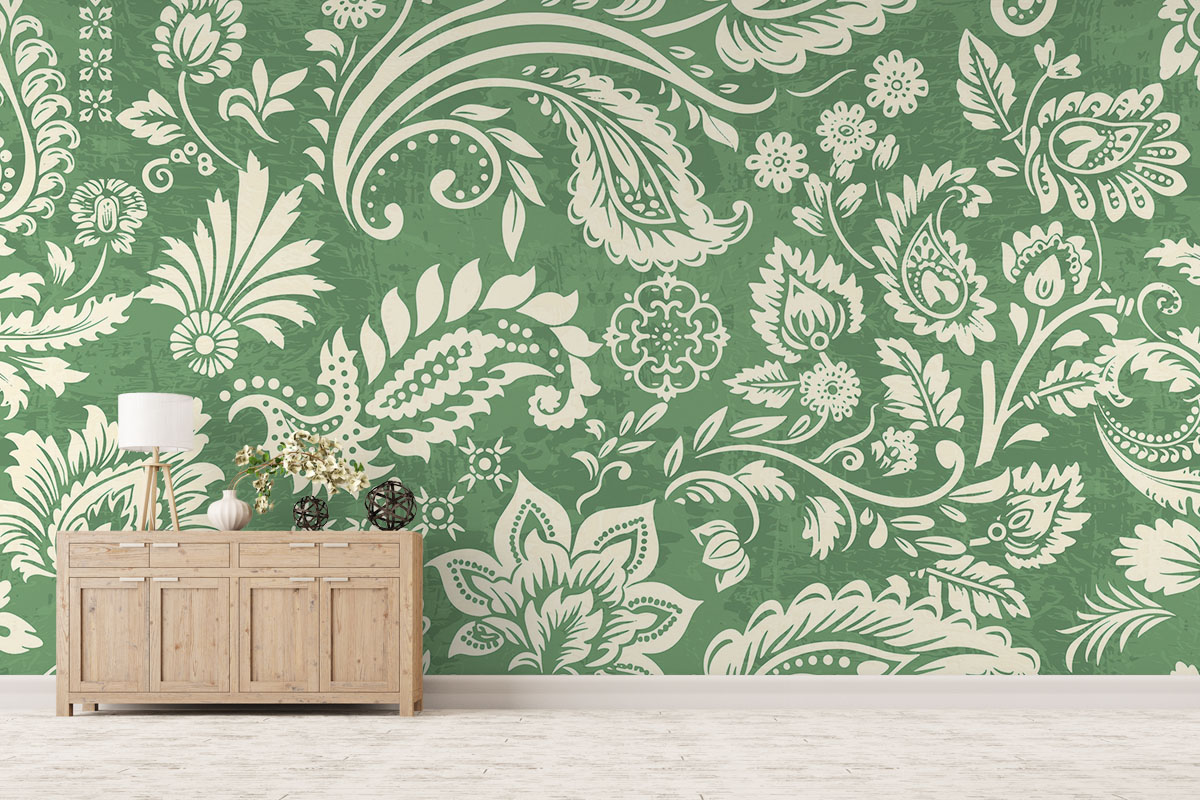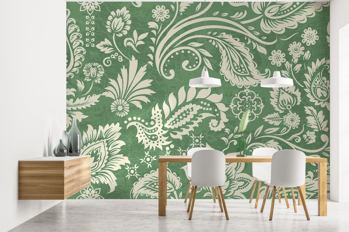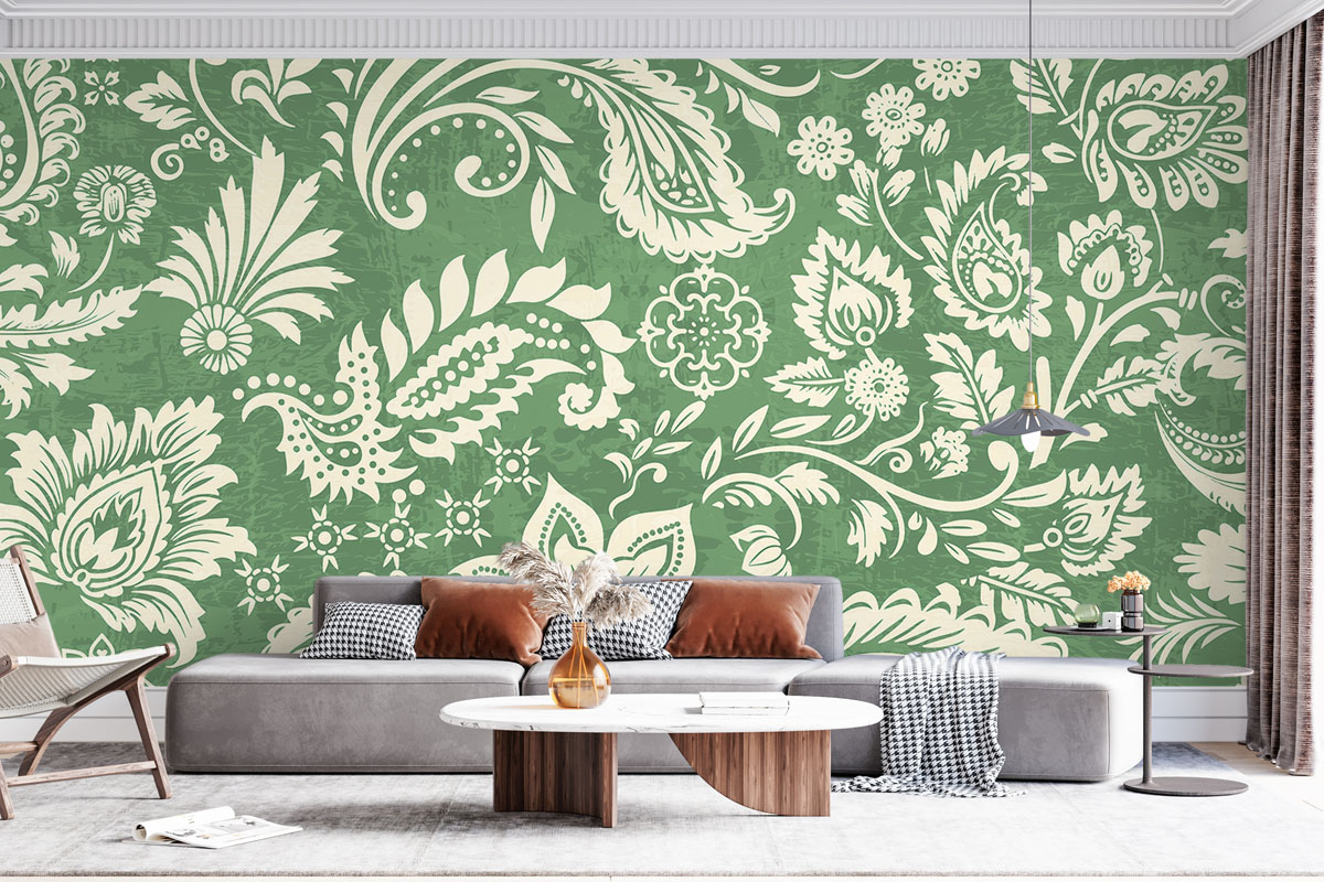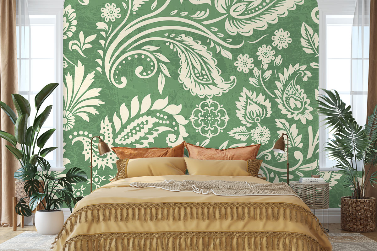 Klassiek paisleypatroon met sierlijke bloemranken in saliegroen en crème. Verfijnd en tijdloos.