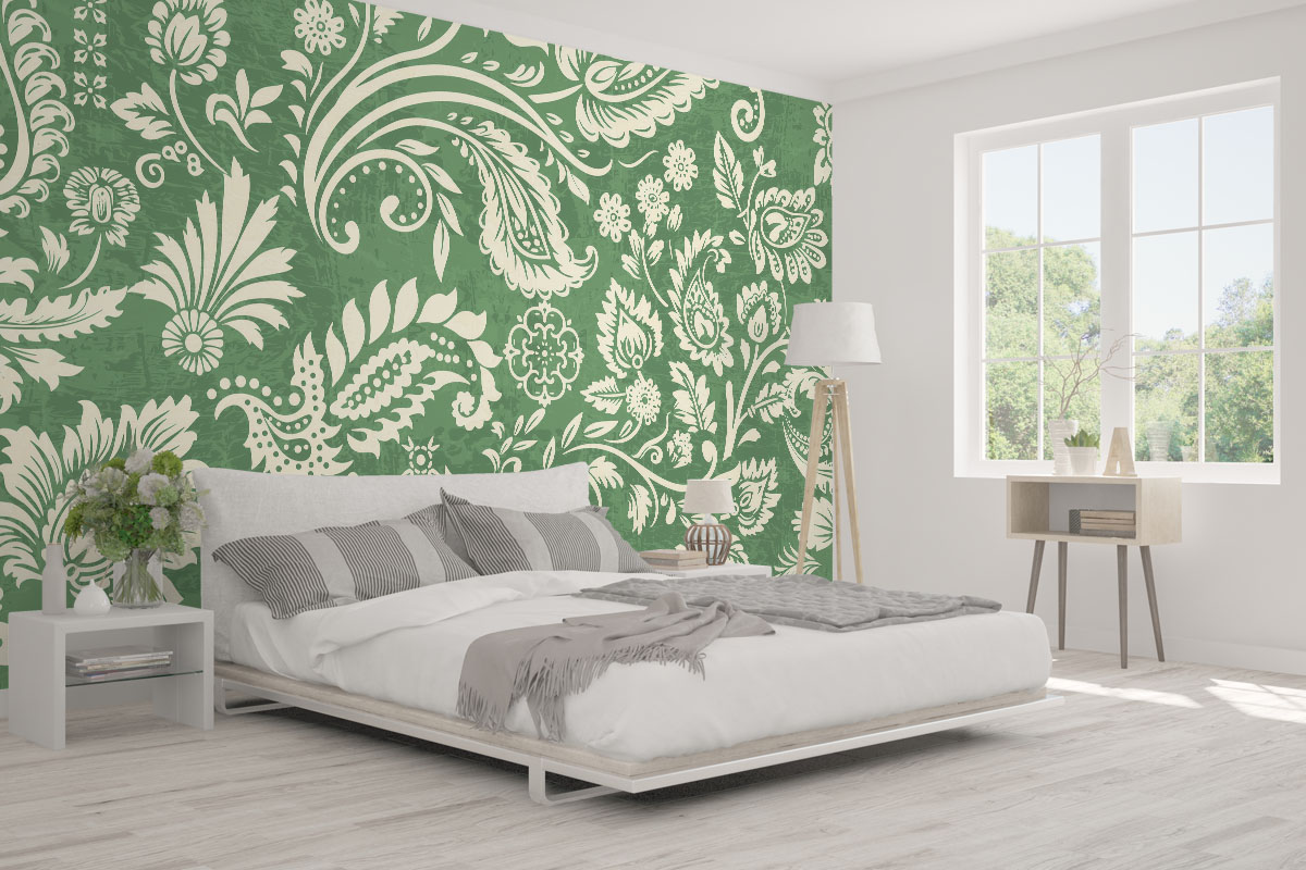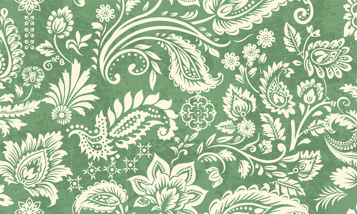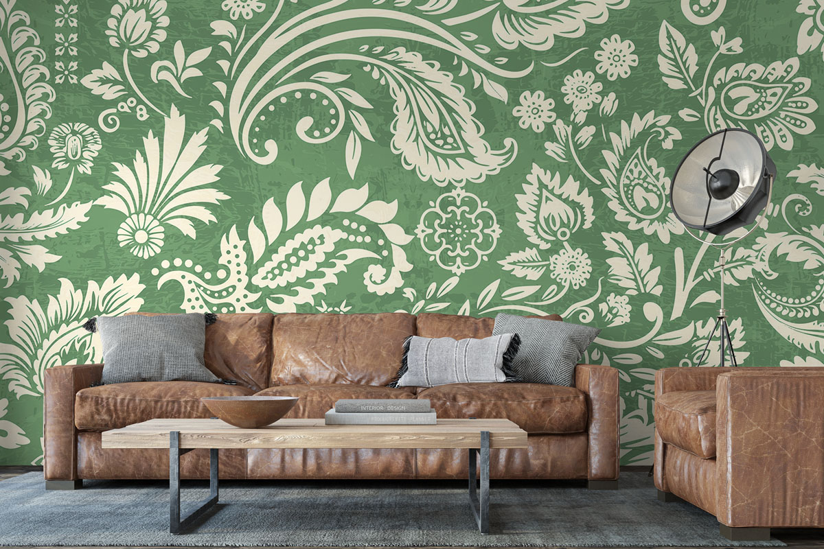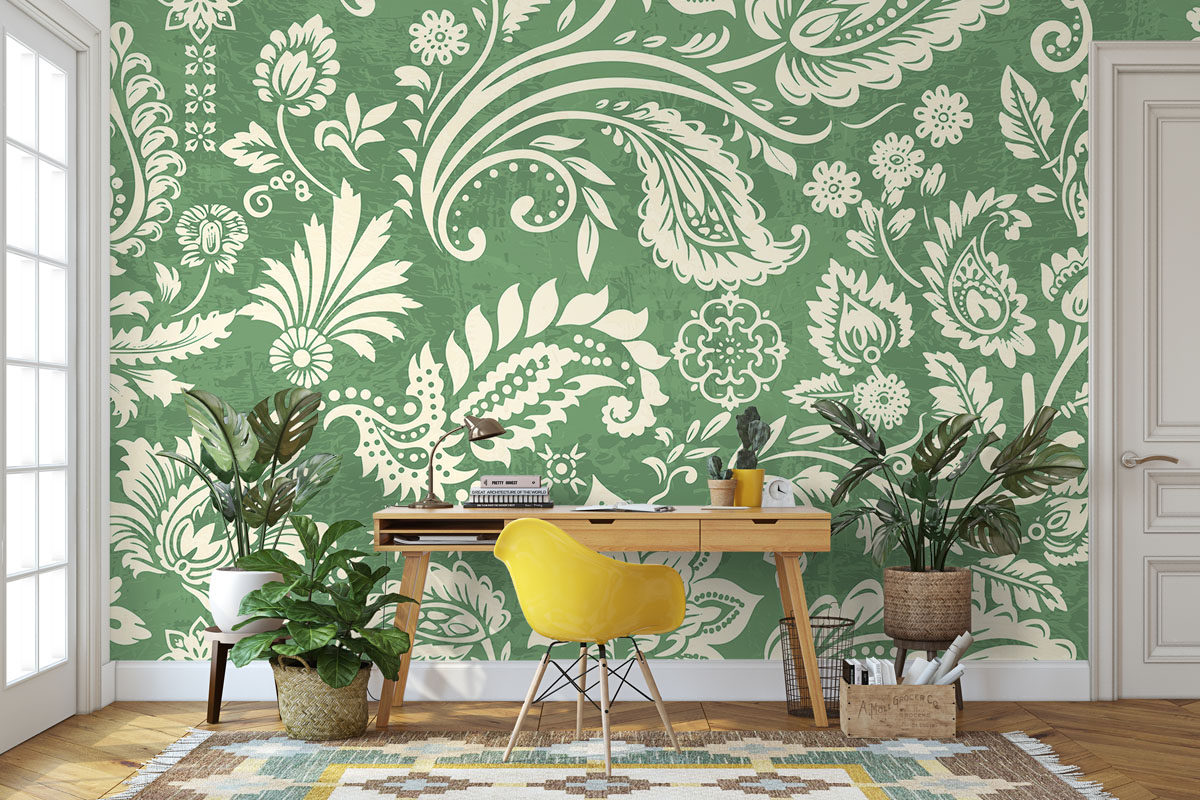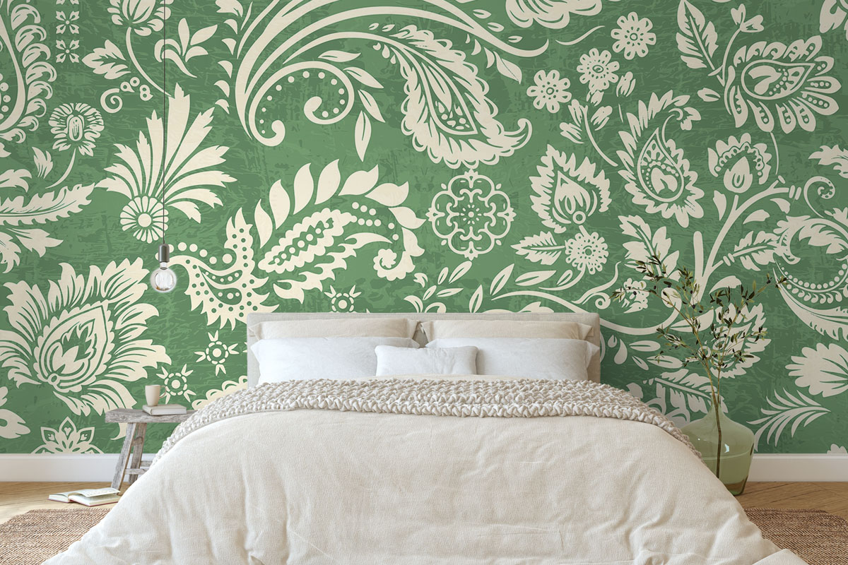 Klassiek paisleypatroon met sierlijke bloemranken in saliegroen en crème. Verfijnd en tijdloos.