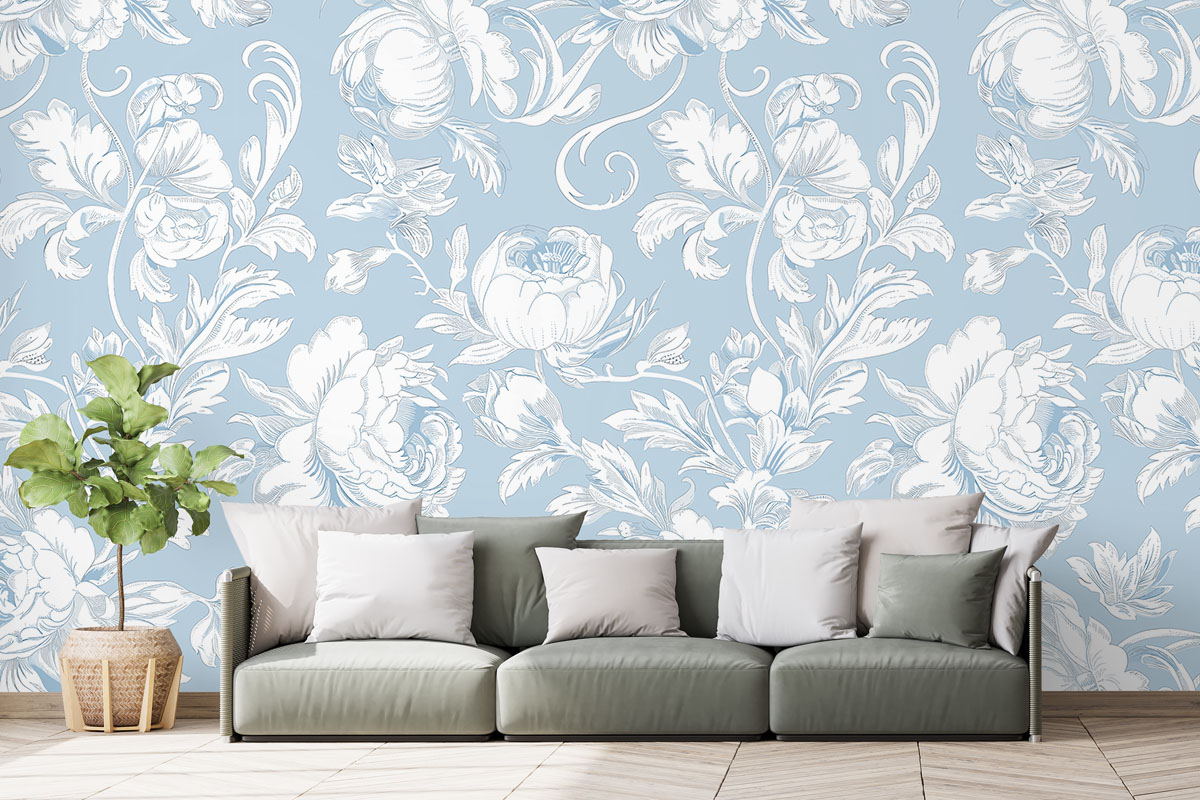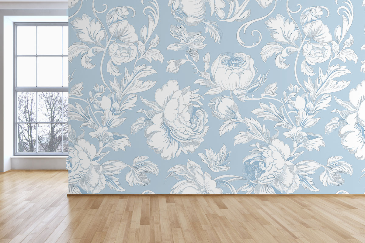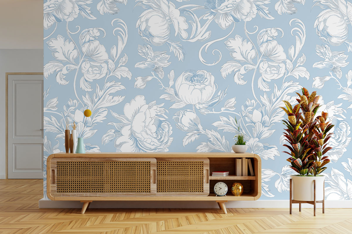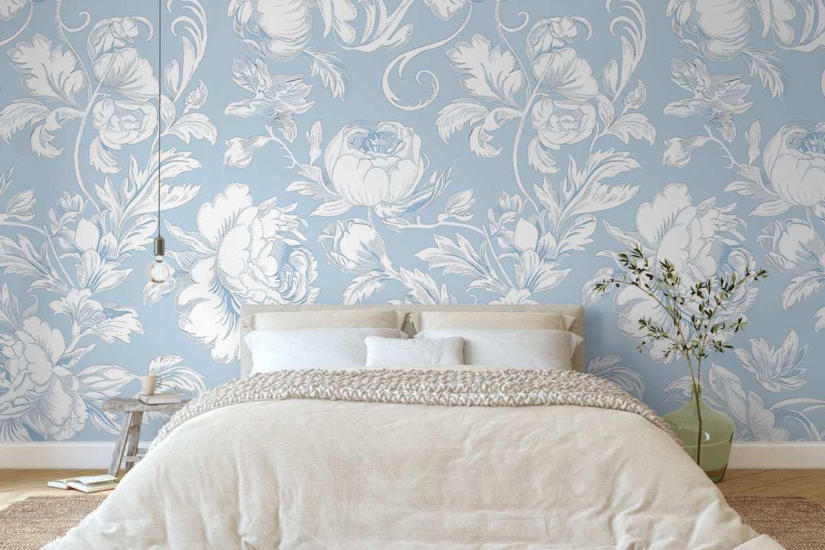 Wil je de muur combineren met verf? We hebben drie Flexa Pure kleuren geselecteerd die perfect matchen met dit fotobehang Poederblauwe barokbloemen. Zo creëer je eenvoudig een harmonieus interieur.