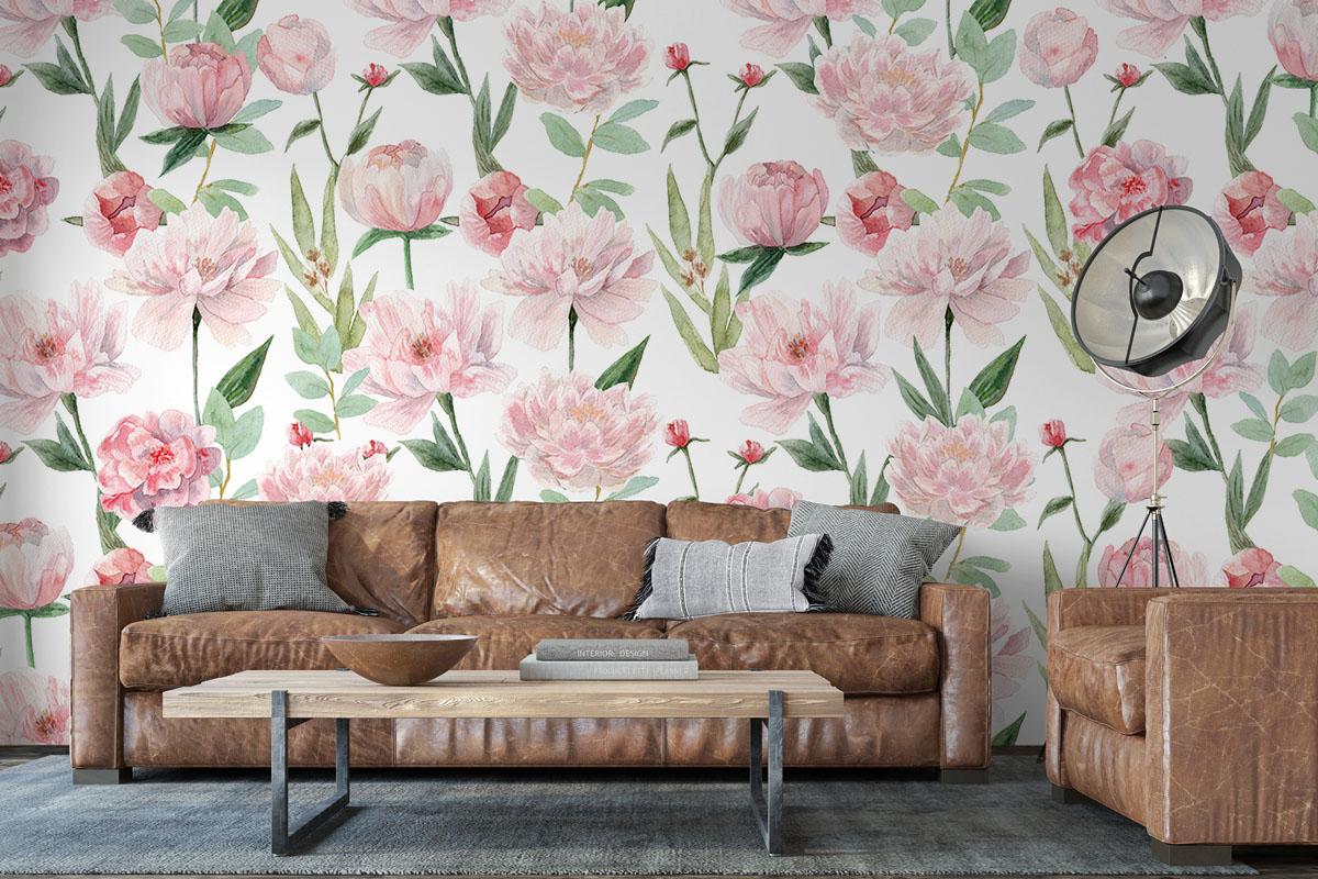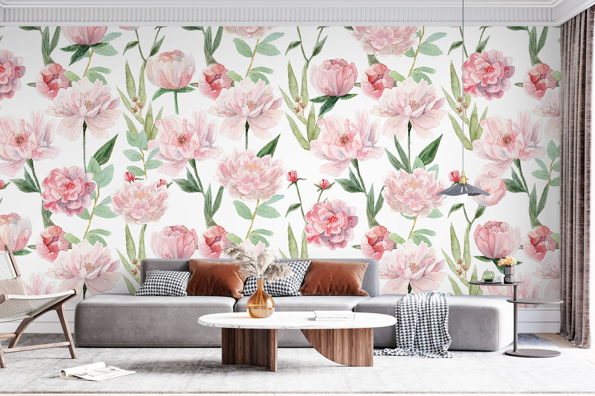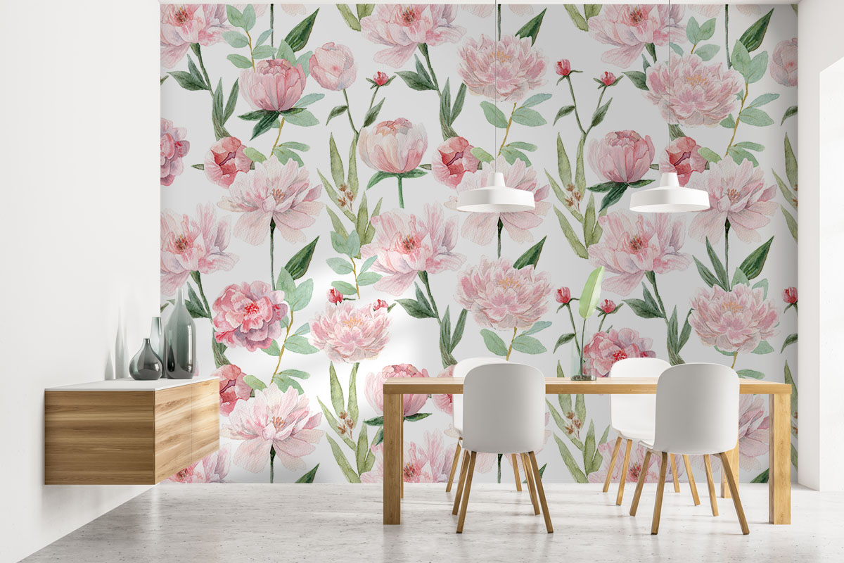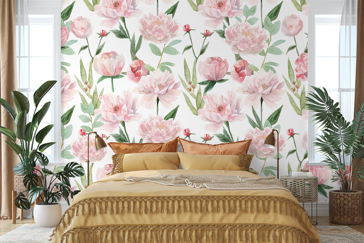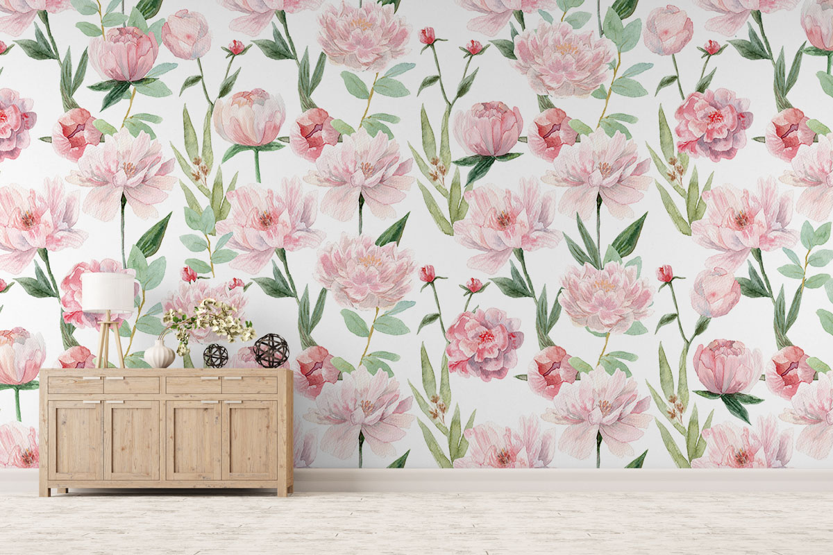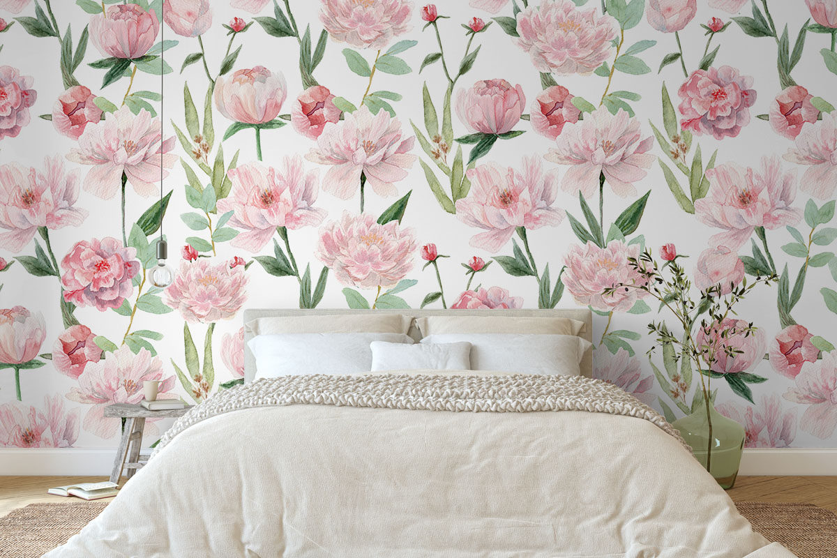 Zachte roze pioenrozen op wit creëren een dromerige sfeer. Een romantisch bloemenbehang dat elegantie ademt.