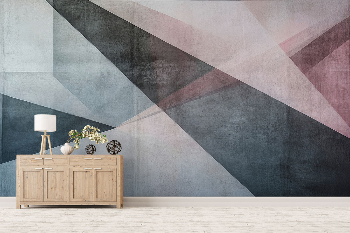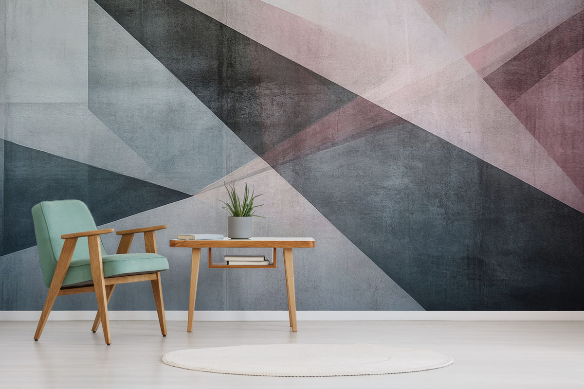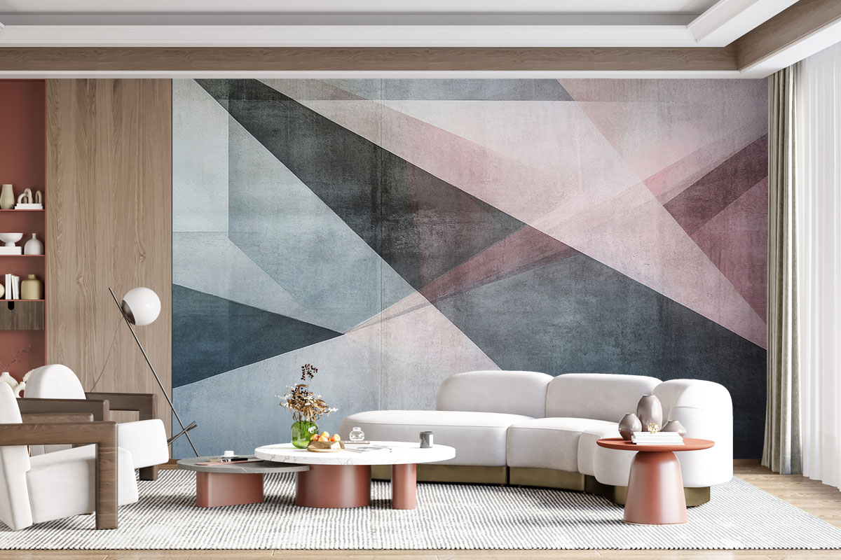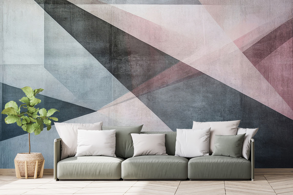 Abstract patroon met transparante driehoeken in roze, grijs en petrol. Modern en verfijnd.