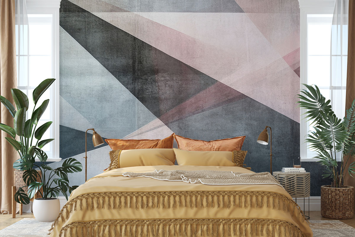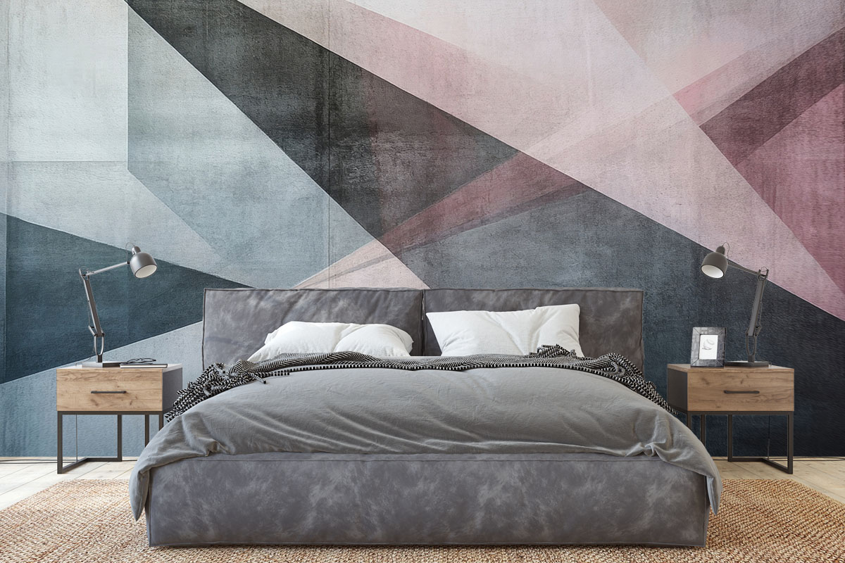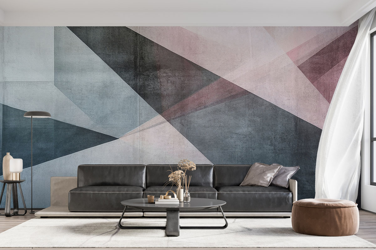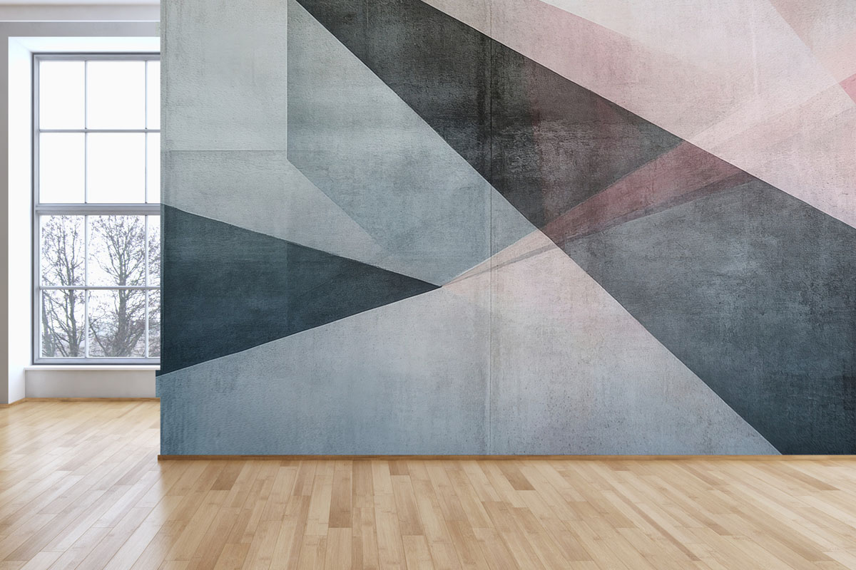 Abstract patroon met transparante driehoeken in roze, grijs en petrol. Modern en verfijnd.