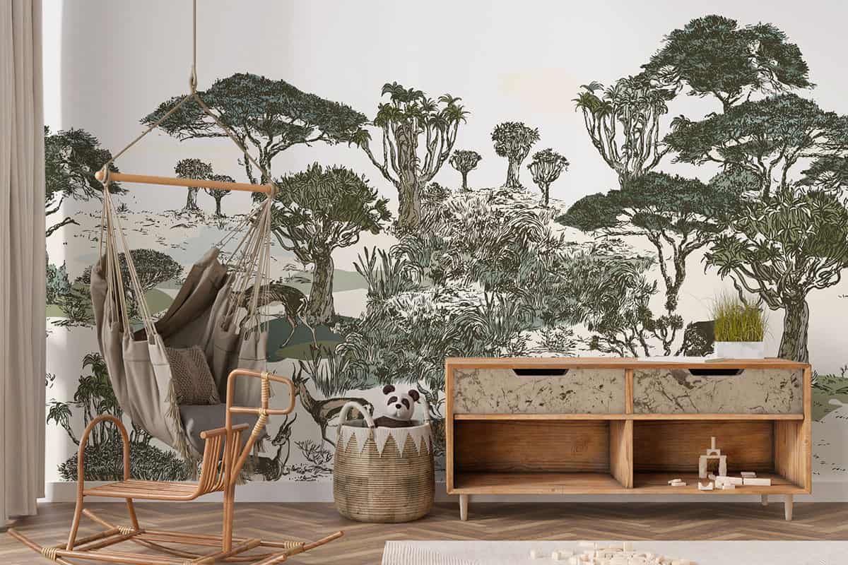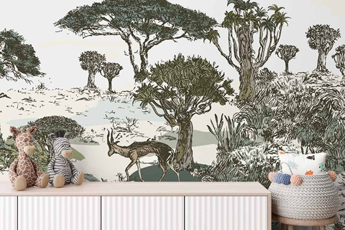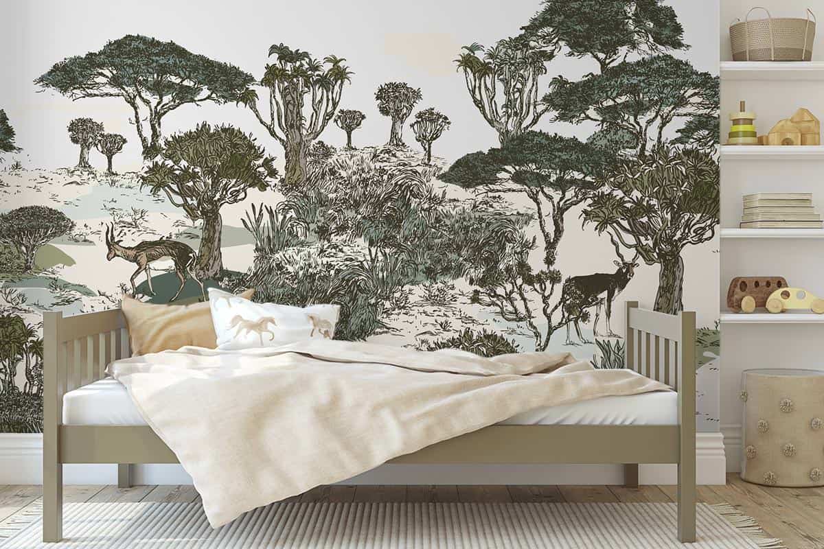 Wil je naast het behang ook een muur in de baby- of kinderkamer verven? Wij hebben alvast 3 Flexa Pure kleuren geselecteerd die perfect passen bij dit fotobehang Savanne landschap toile design.