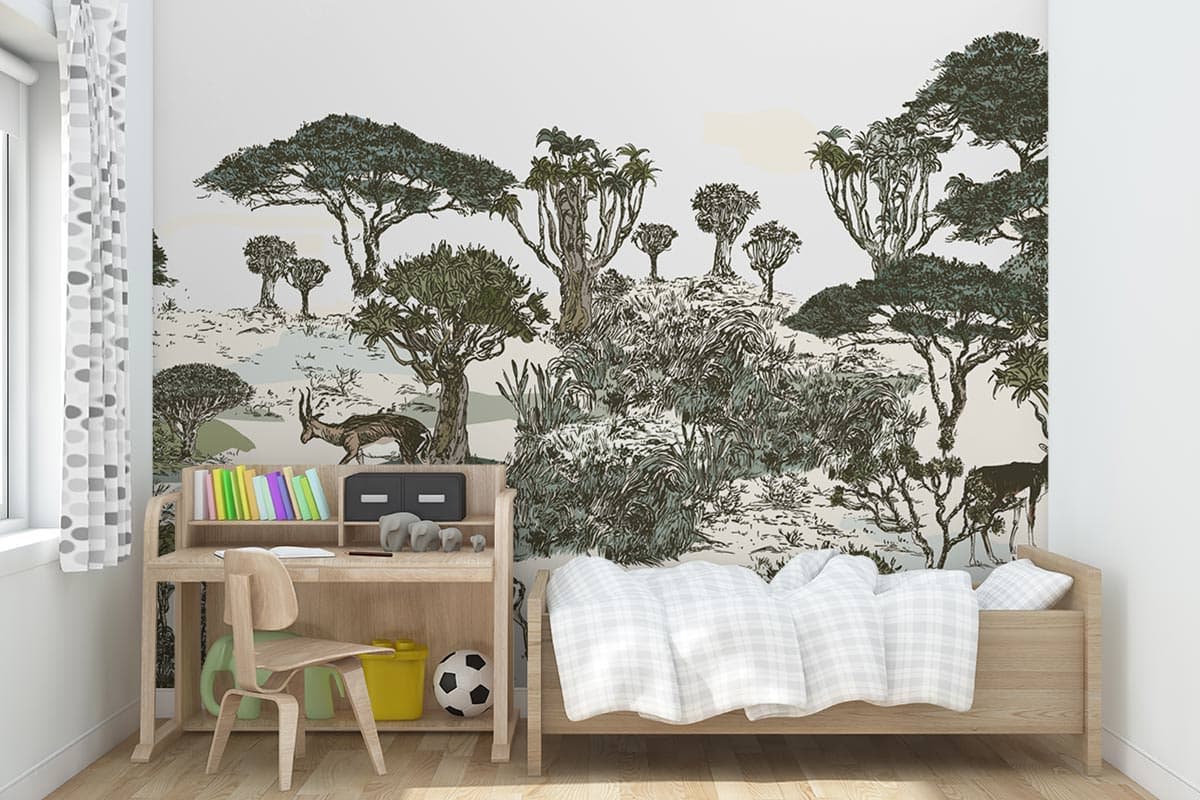 Jouw design Savanne landschap toile design wordt geprint op hoogwaardig duurzaam vliesbehang van premium kwaliteit. Dit stevige behang (200 g/m²) is krasvast, robuust en blijft jarenlang mooi — perfect voor in de kinderkamer, babykamer of speelkamer. Je kunt het behang helemaal op maat laten maken, zodat het ontwerp precies past op jouw muur. Dankzij de gladde afwerking en strakke structuur komt elk detail van het ontwerp perfect tot zijn recht.