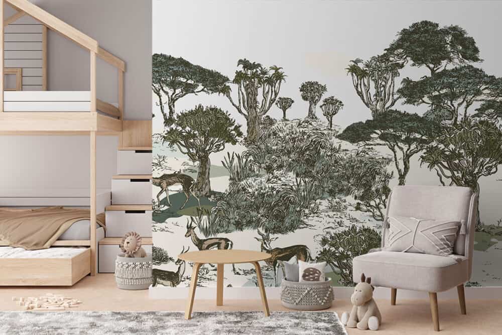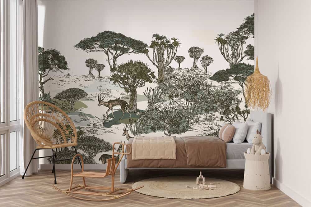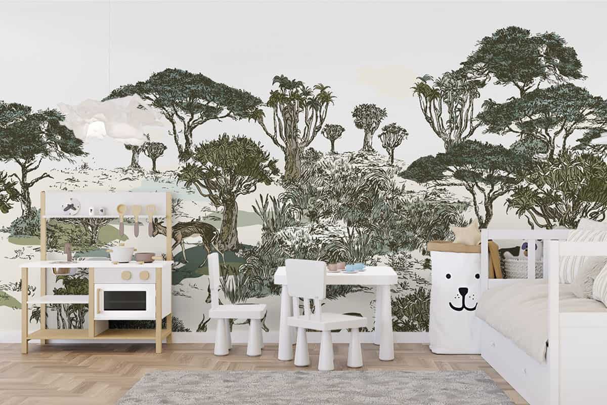 Wil je naast het behang ook een muur in de baby- of kinderkamer verven? Wij hebben alvast 3 Flexa Pure kleuren geselecteerd die perfect passen bij dit fotobehang Savanne landschap toile design.