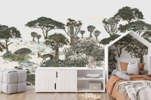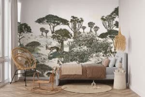 Jouw design Savanne landschap toile design wordt geprint op hoogwaardig duurzaam vliesbehang van premium kwaliteit. Dit stevige behang (200 g/m²) is krasvast, robuust en blijft jarenlang mooi — perfect voor in de kinderkamer, babykamer of speelkamer. Je kunt het behang helemaal op maat laten maken, zodat het ontwerp precies past op jouw muur. Dankzij de gladde afwerking en strakke structuur komt elk detail van het ontwerp perfect tot zijn recht.