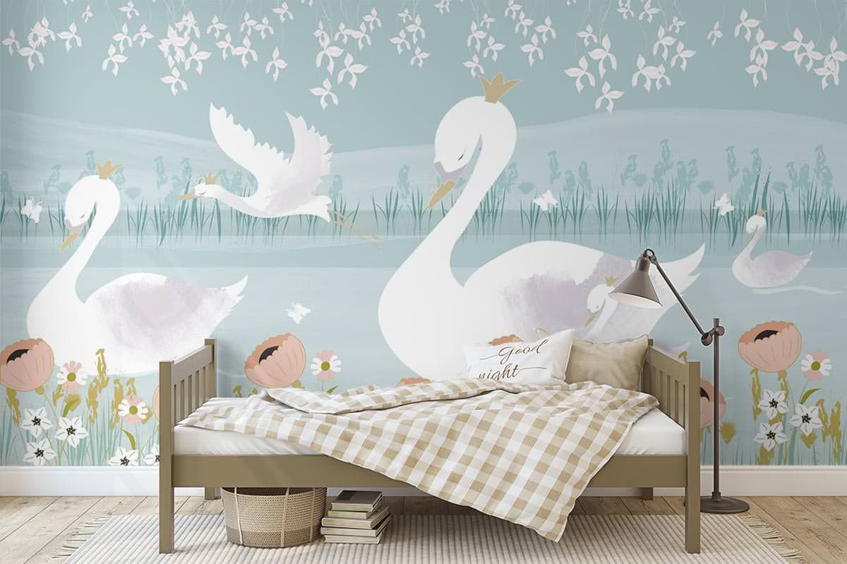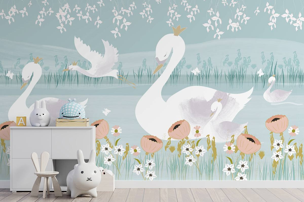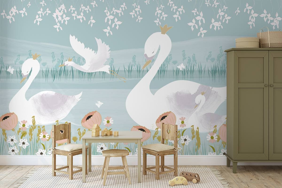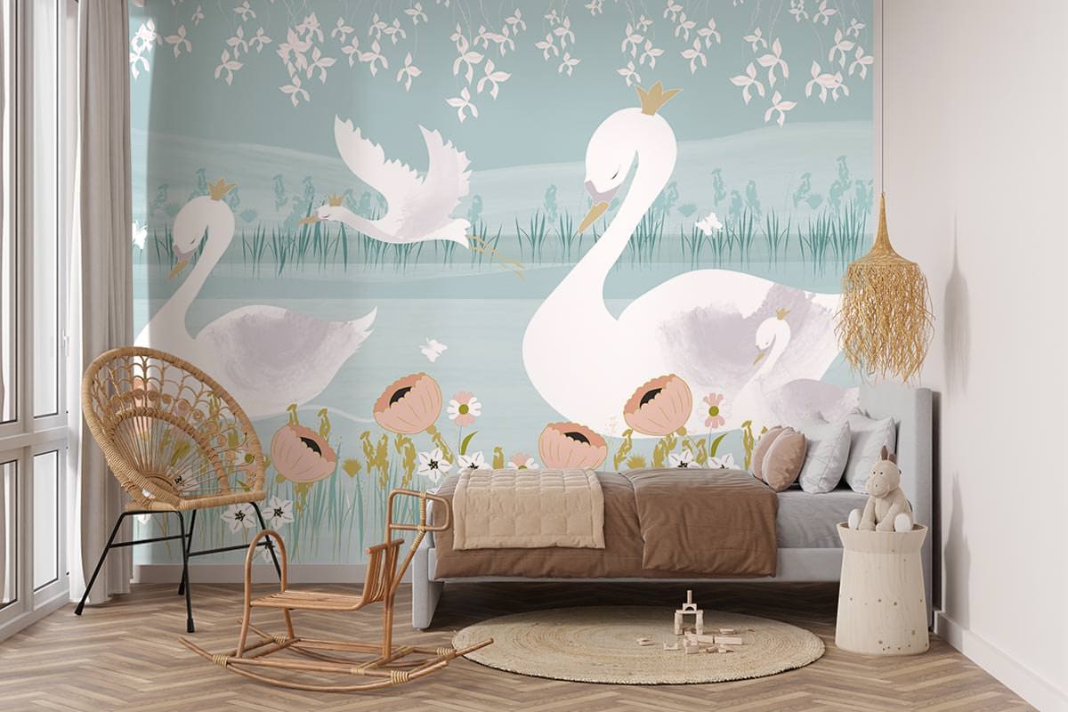 Wil je naast het behang ook een muur in de baby- of kinderkamer verven? Wij hebben alvast 3 Flexa Pure kleuren geselecteerd die perfect passen bij dit fotobehang Sierlijke zwanen.