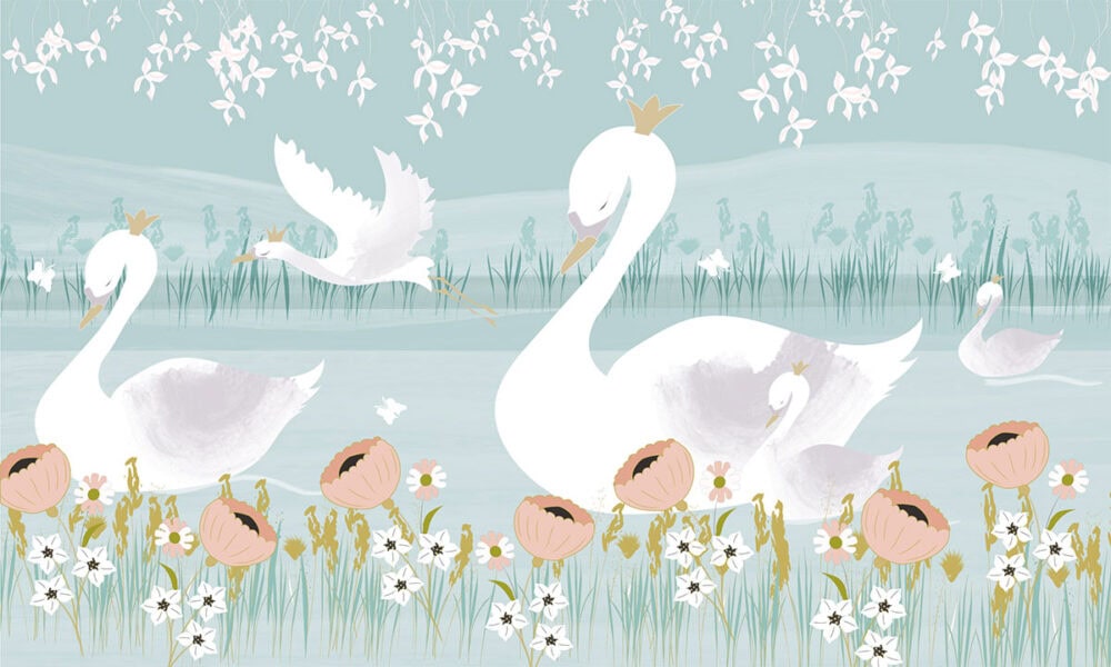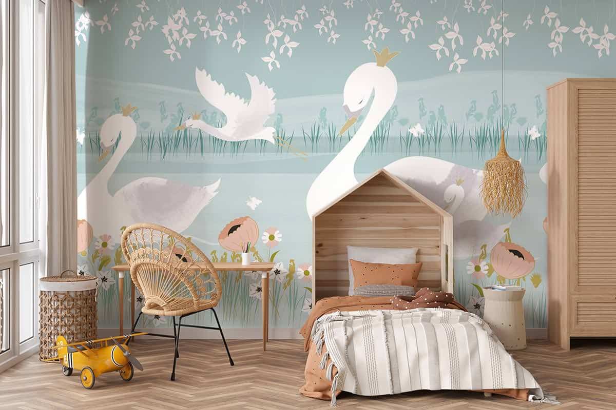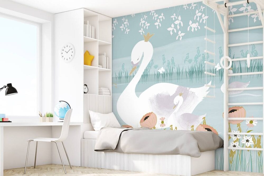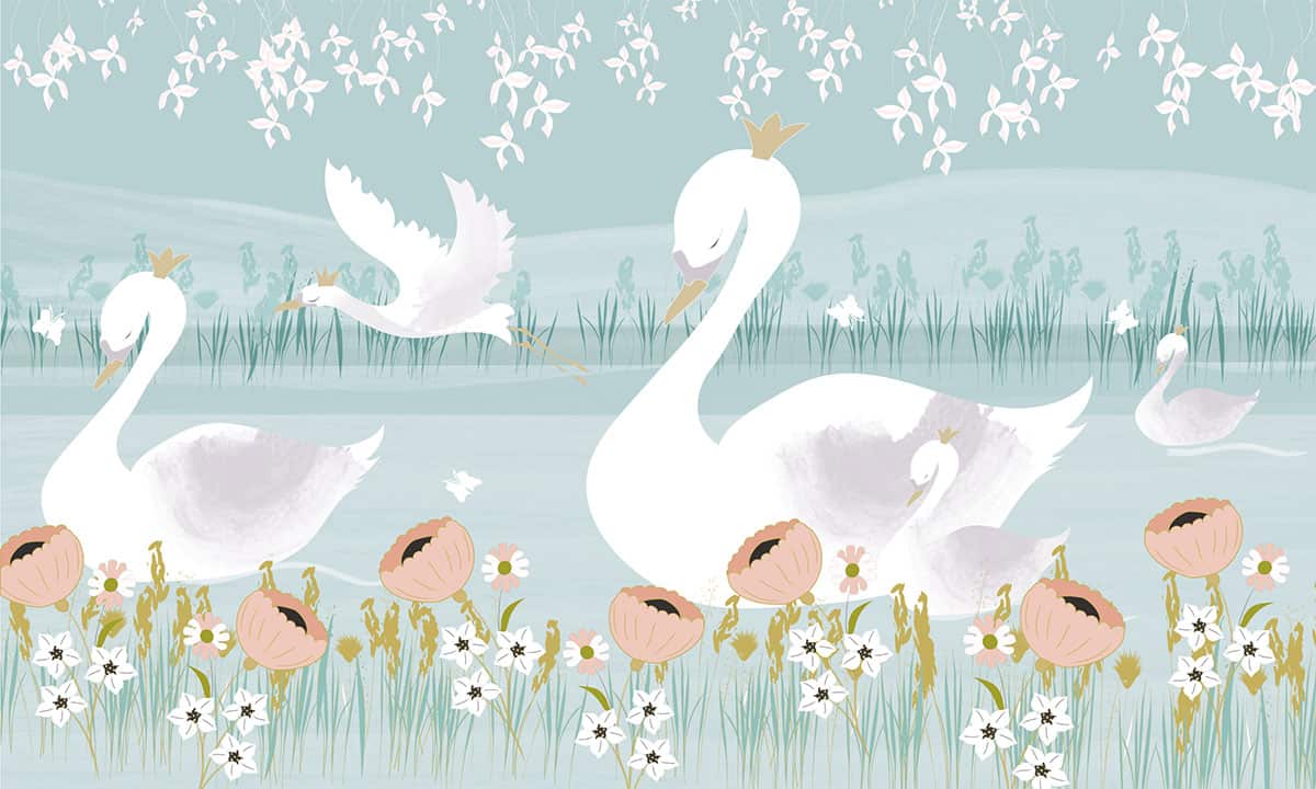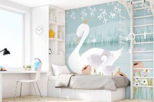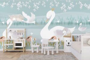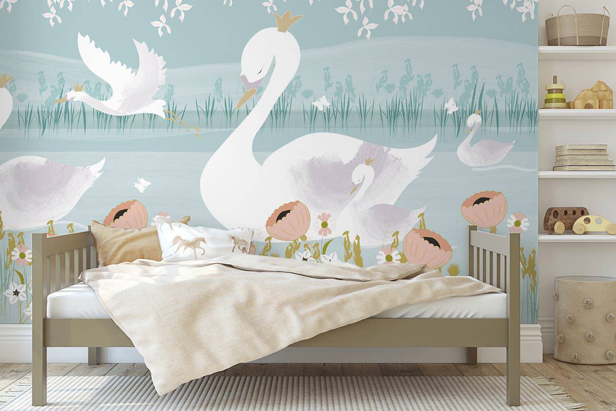 Wil je naast het behang ook een muur in de baby- of kinderkamer verven? Wij hebben alvast 3 Flexa Pure kleuren geselecteerd die perfect passen bij dit fotobehang Sierlijke zwanen.