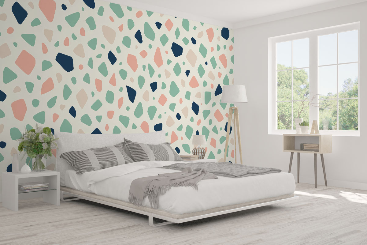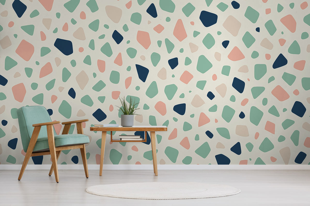 Wil je de muur combineren met verf? We hebben drie Flexa Pure kleuren geselecteerd die perfect matchen met dit fotobehang Terrazzo patroon. Zo creëer je eenvoudig een harmonieus interieur.