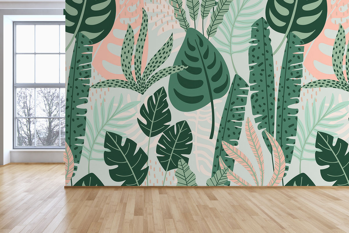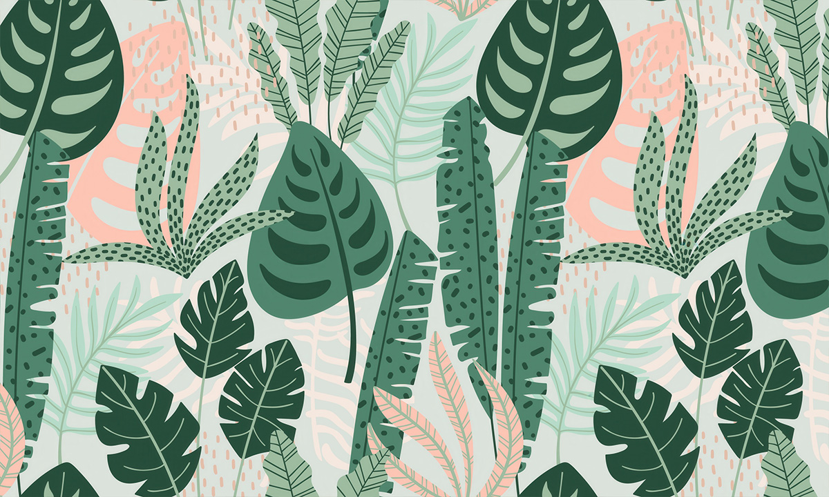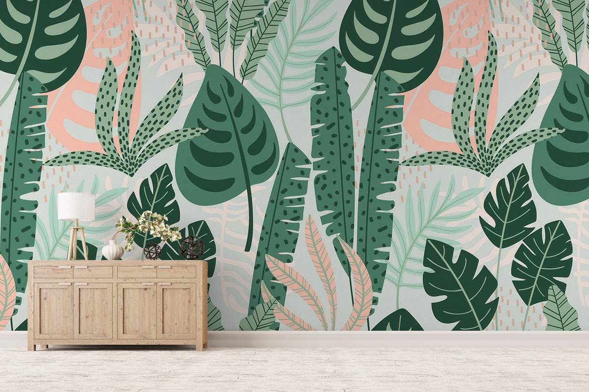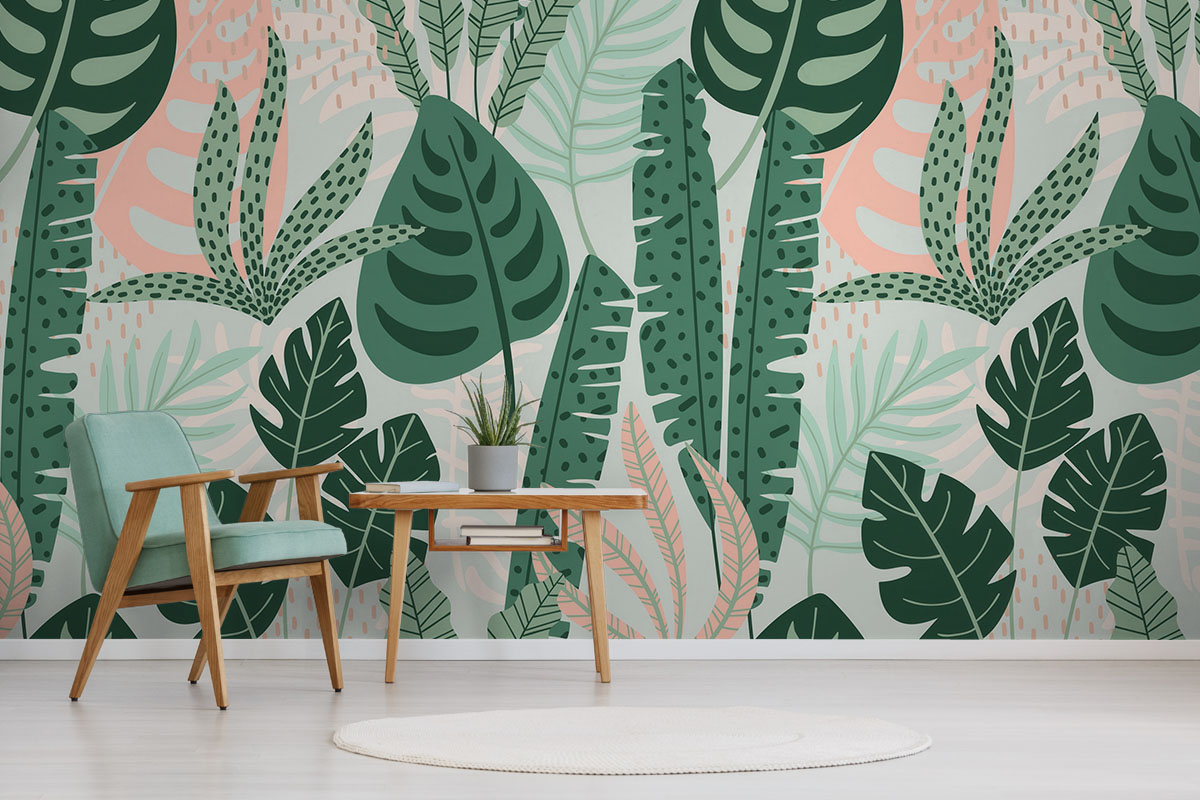 Weelderig bladerdek met monstera en palmen in mint- en bosgroen. Fris, modern en rustgevend.