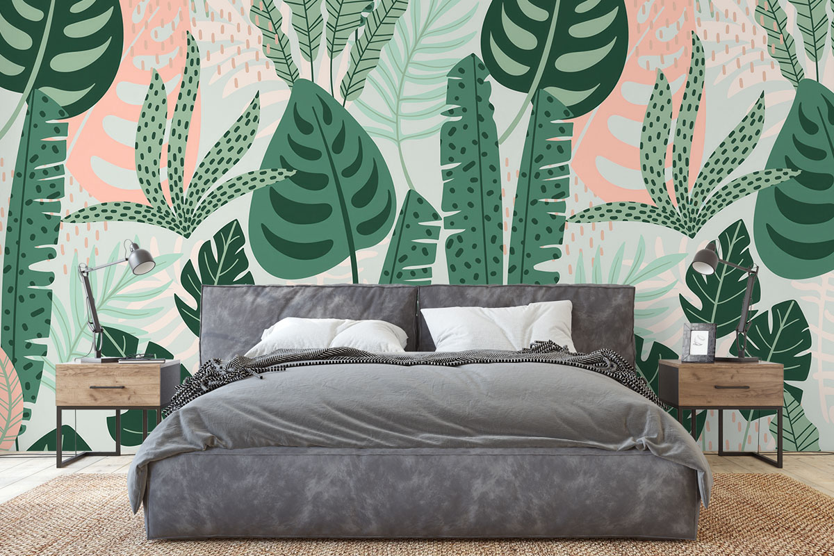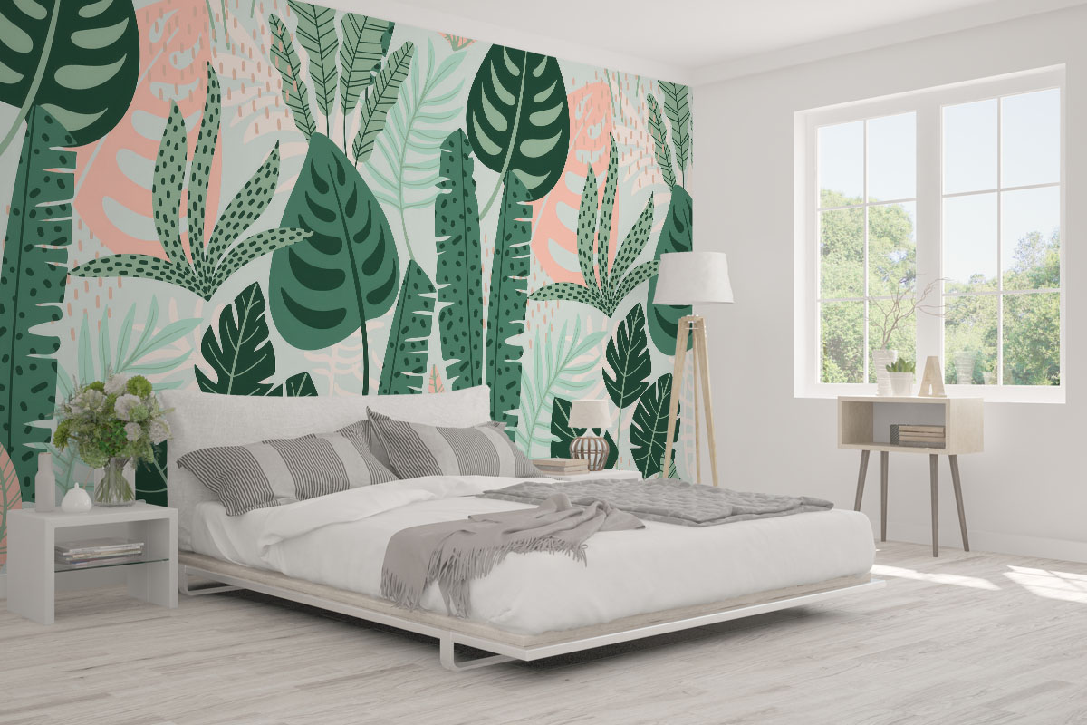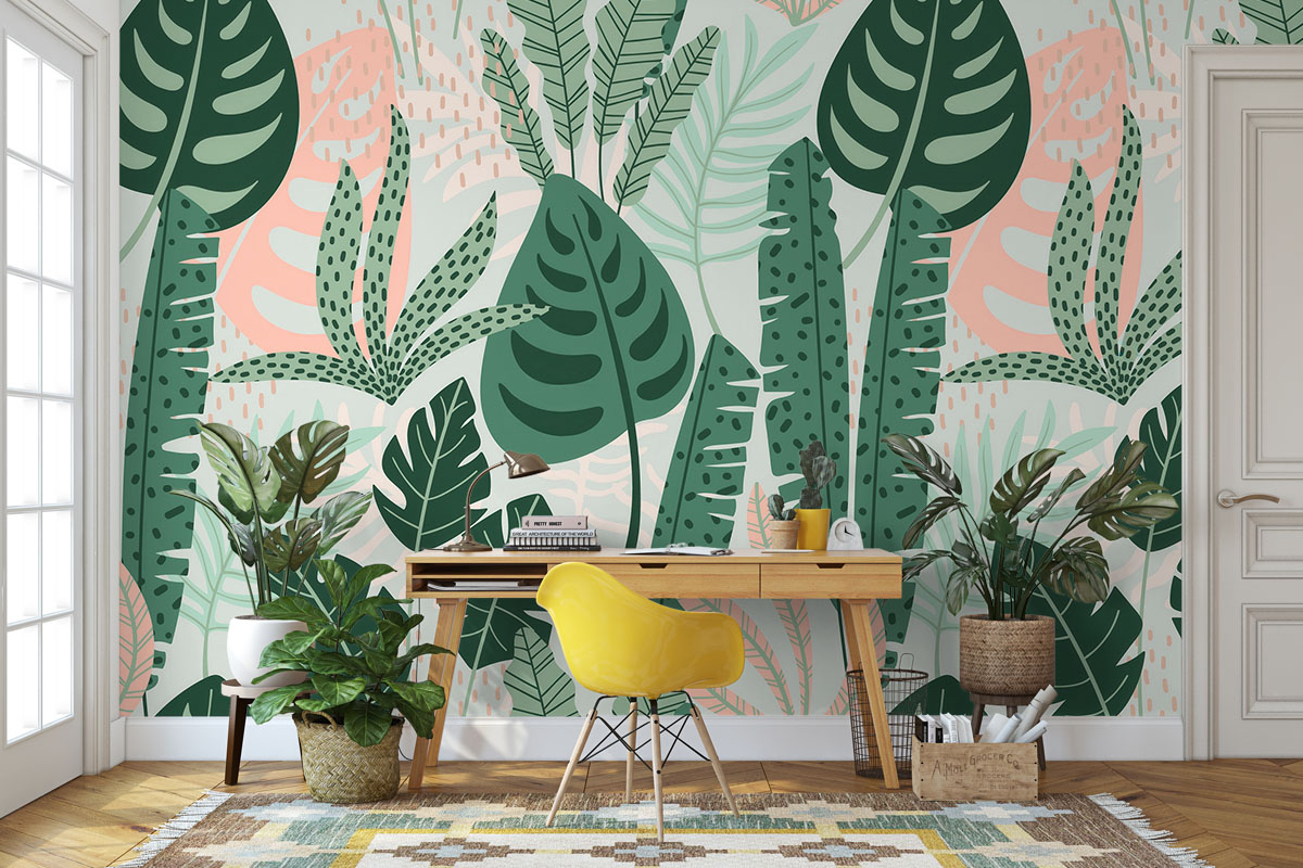 Weelderig bladerdek met monstera en palmen in mint- en bosgroen. Fris, modern en rustgevend.