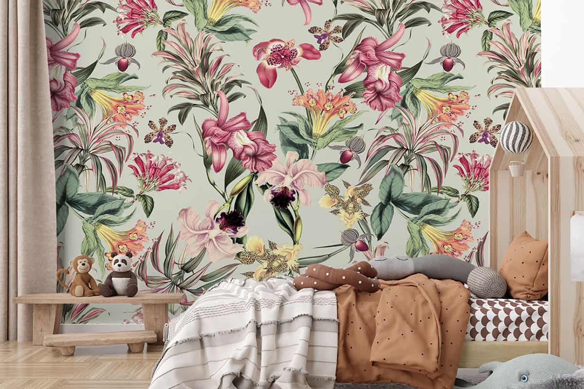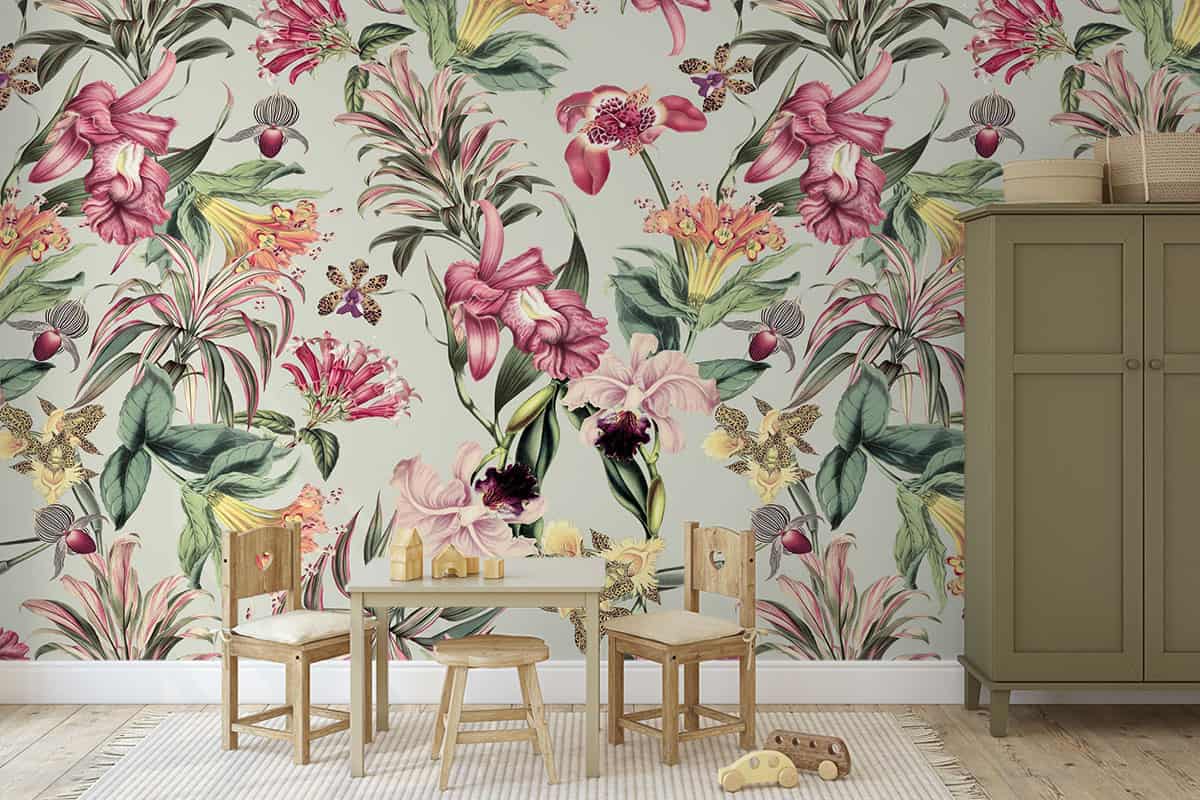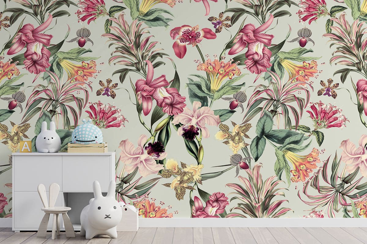 Wil je naast het behang ook een muur in de baby- of kinderkamer verven? Wij hebben alvast 3 Flexa Pure kleuren geselecteerd die perfect passen bij dit fotobehang Tropische bloemen op grijsgroene achtergrond.