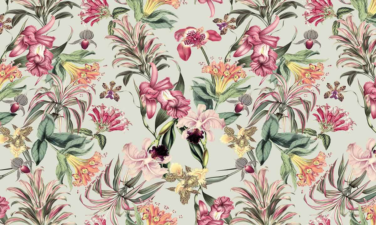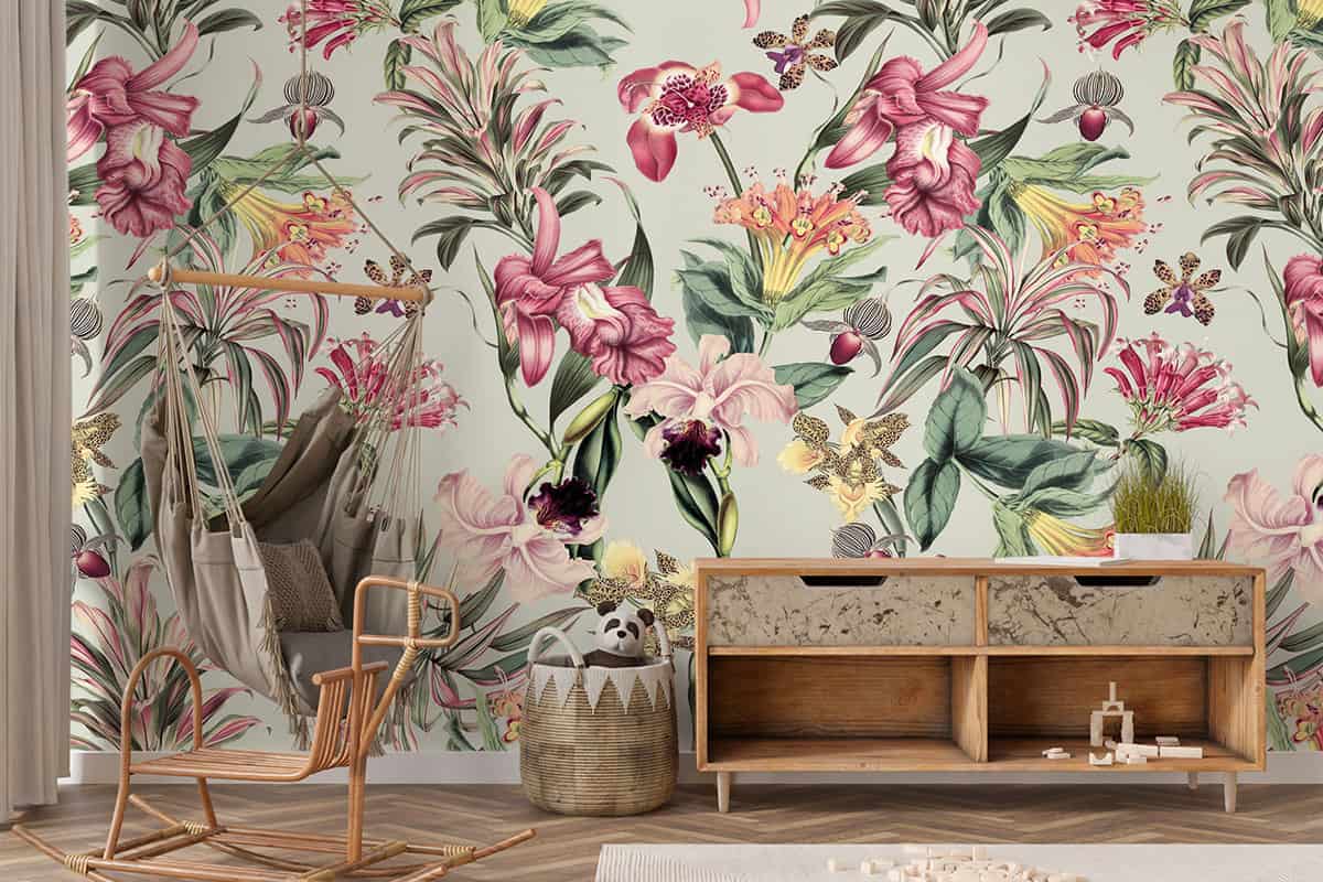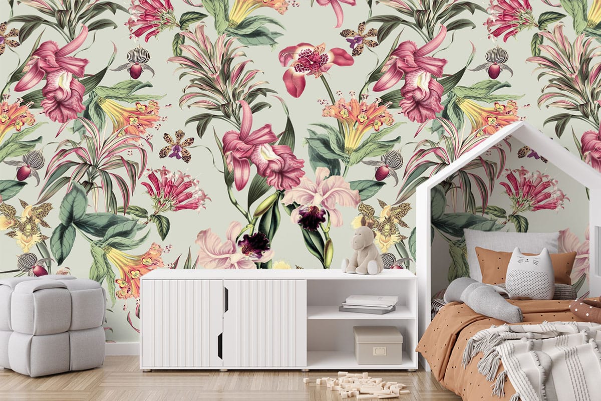 Wil je naast het behang ook een muur in de baby- of kinderkamer verven? Wij hebben alvast 3 Flexa Pure kleuren geselecteerd die perfect passen bij dit fotobehang Tropische bloemen op grijsgroene achtergrond.