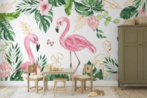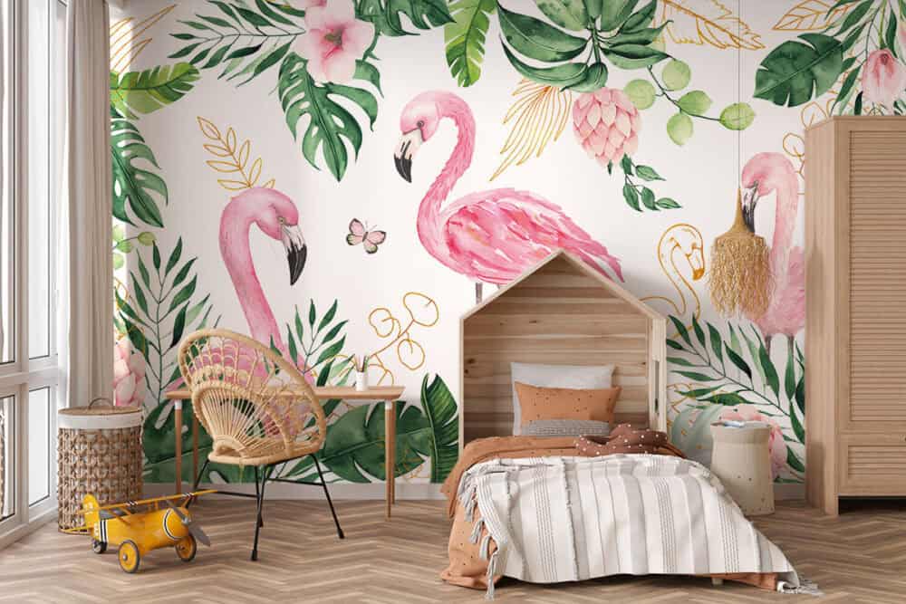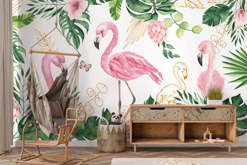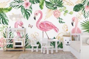 Wil je naast het behang ook een muur in de baby- of kinderkamer verven? Wij hebben alvast 3 Flexa Pure kleuren geselecteerd die perfect passen bij dit fotobehang Tropische flamingo's.