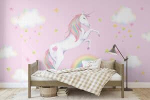 Wil je naast het behang ook een muur in de baby- of kinderkamer verven? Wij hebben alvast 3 Flexa Pure kleuren geselecteerd die perfect passen bij dit fotobehang Unicorn in de wolken.
