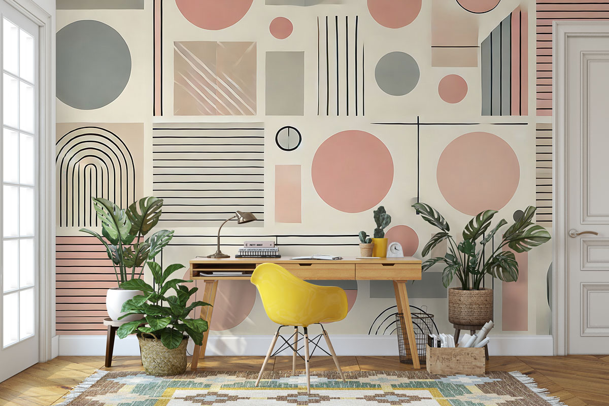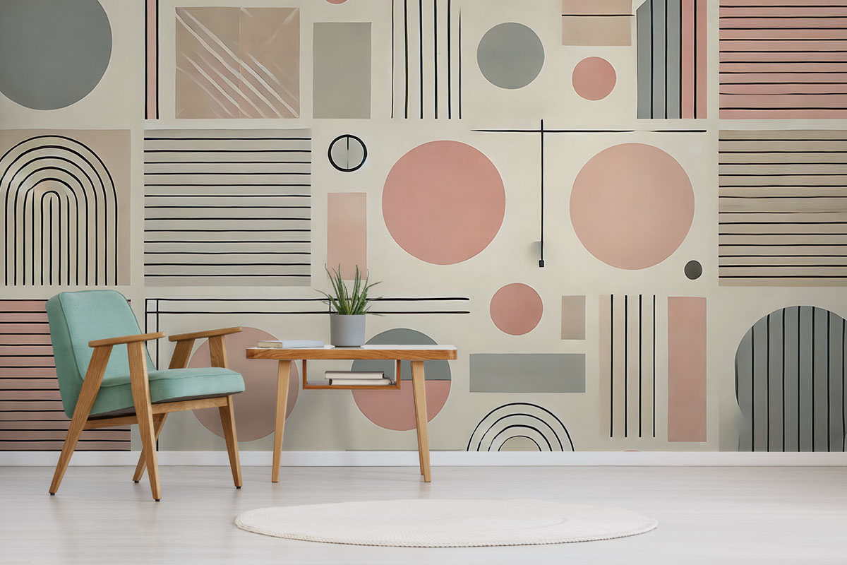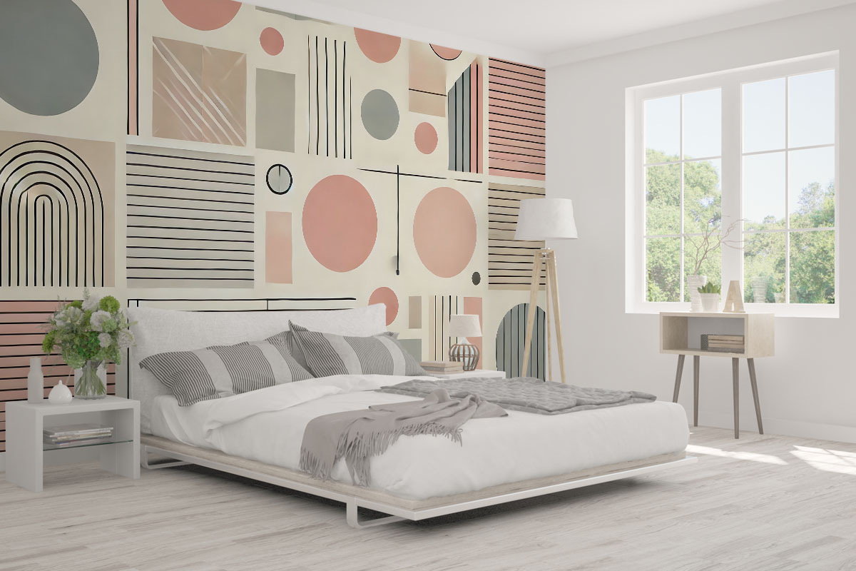 Wil je de muur combineren met verf? We hebben drie Flexa Pure kleuren geselecteerd die perfect matchen met dit fotobehang Vormenspel. Zo creëer je eenvoudig een harmonieus interieur.