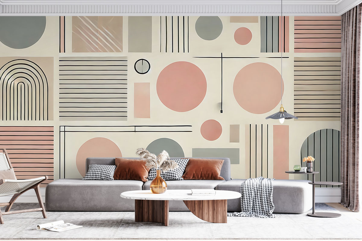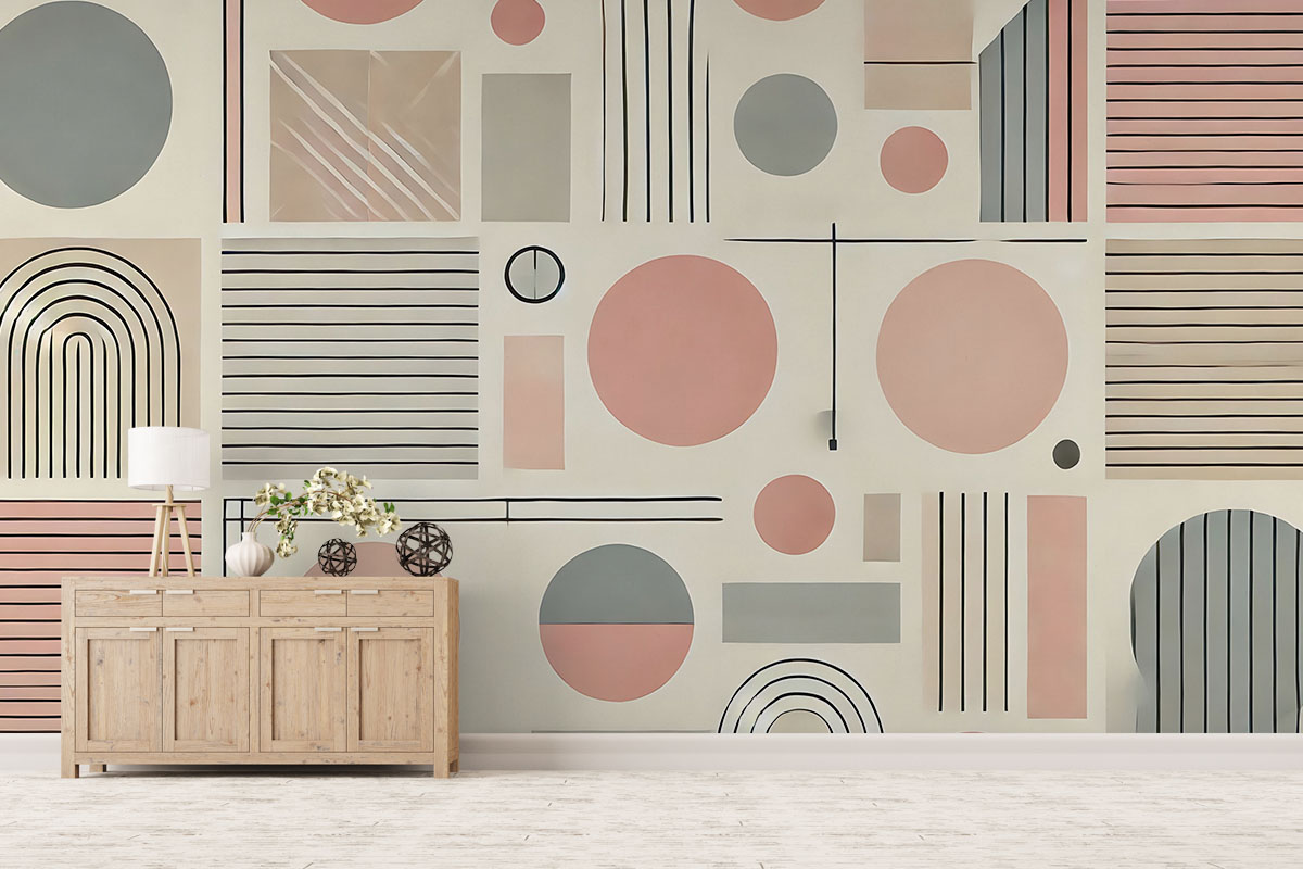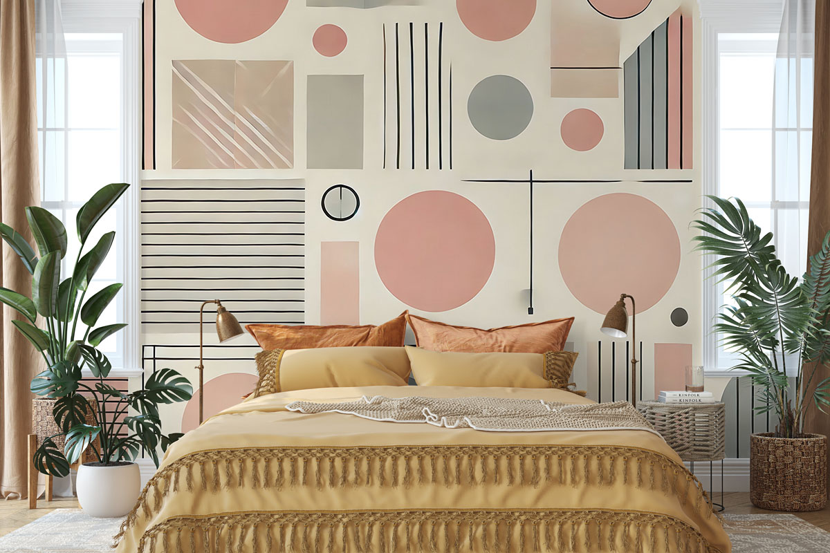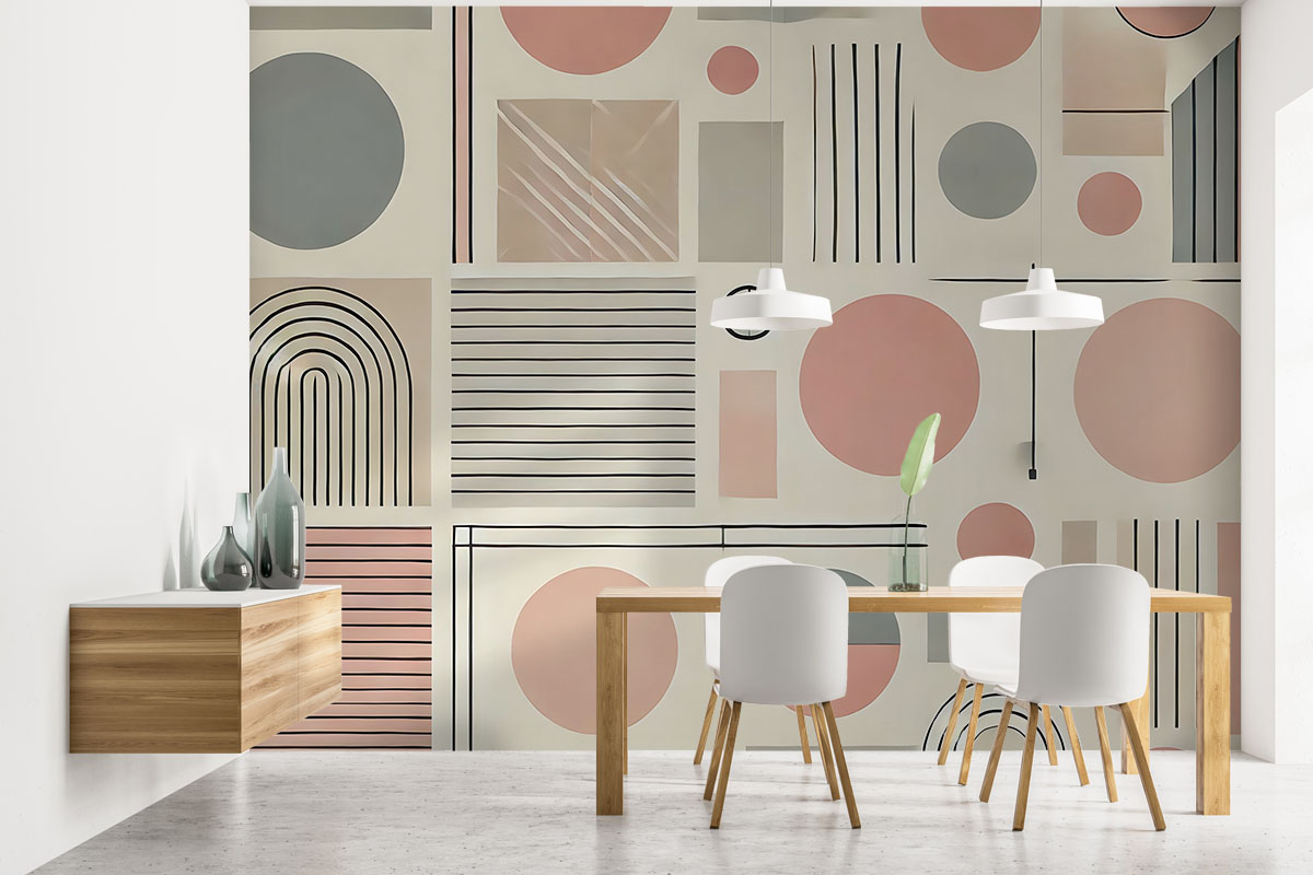 Wil je de muur combineren met verf? We hebben drie Flexa Pure kleuren geselecteerd die perfect matchen met dit fotobehang Vormenspel. Zo creëer je eenvoudig een harmonieus interieur.