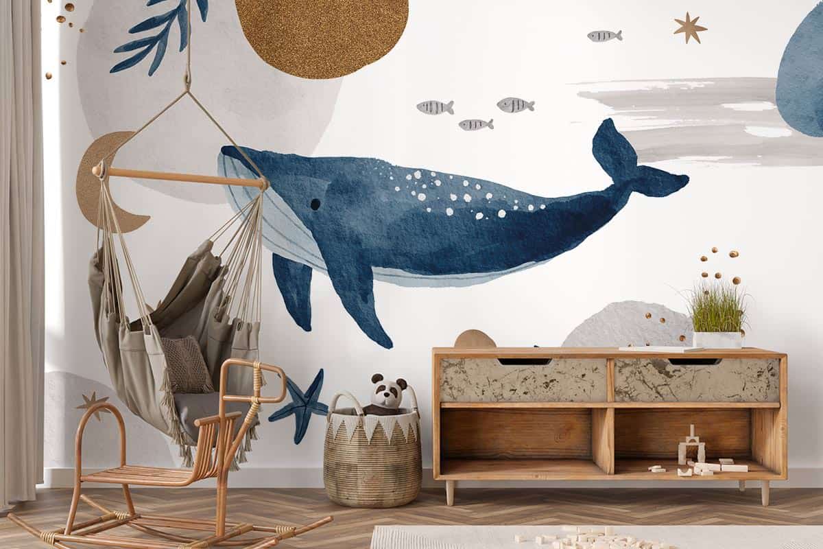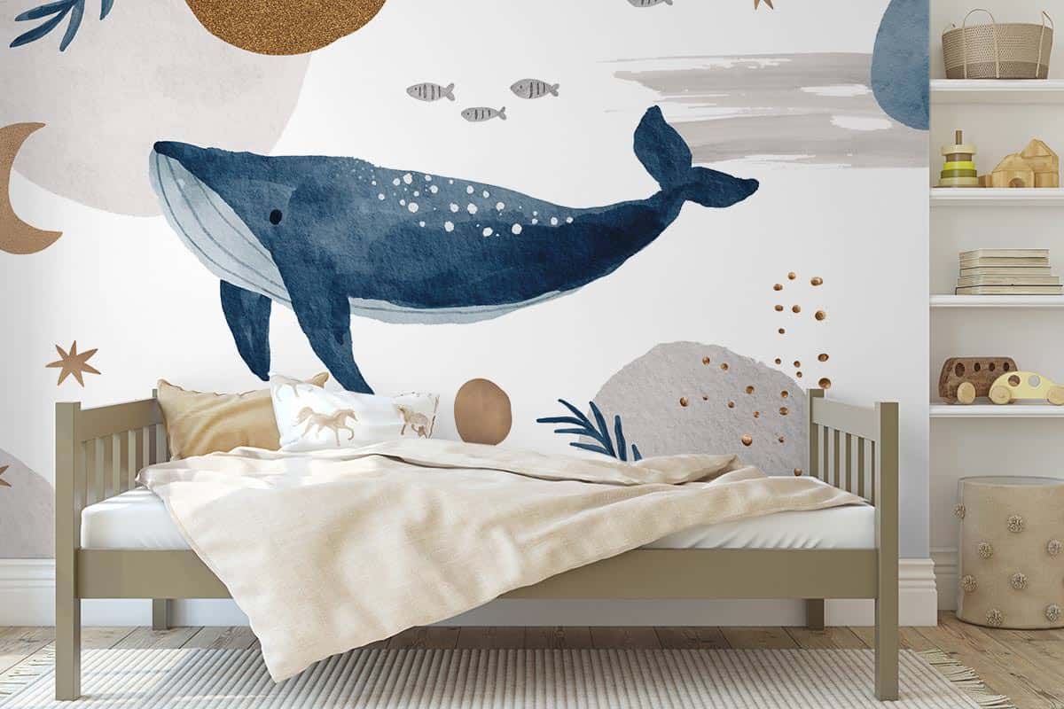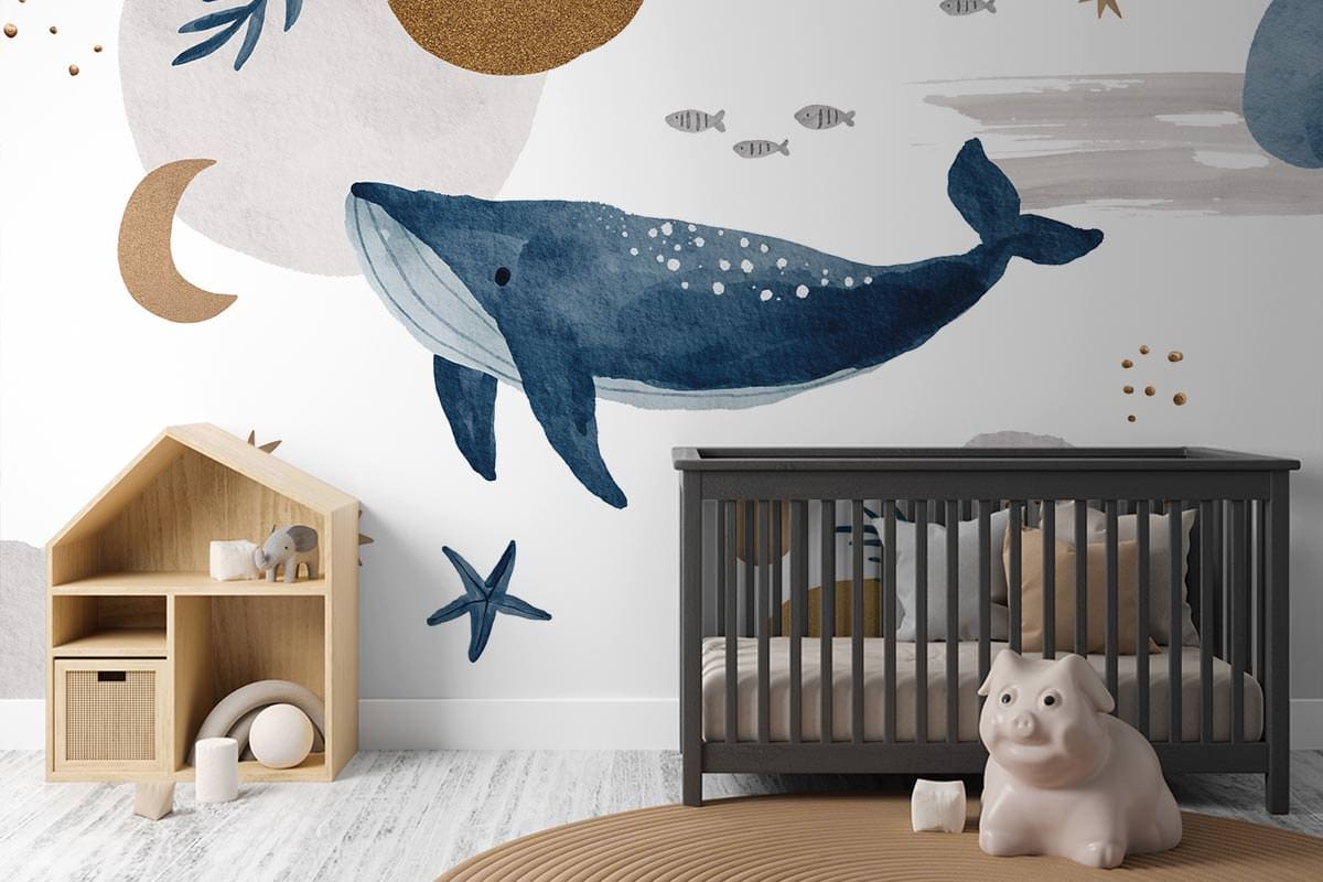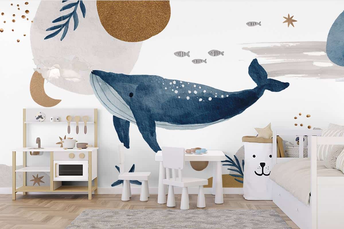Wil je naast het behang ook een muur in de baby- of kinderkamer verven? Wij hebben alvast 3 Flexa Pure kleuren geselecteerd die perfect passen bij dit fotobehang Walvis met kleine visjes.