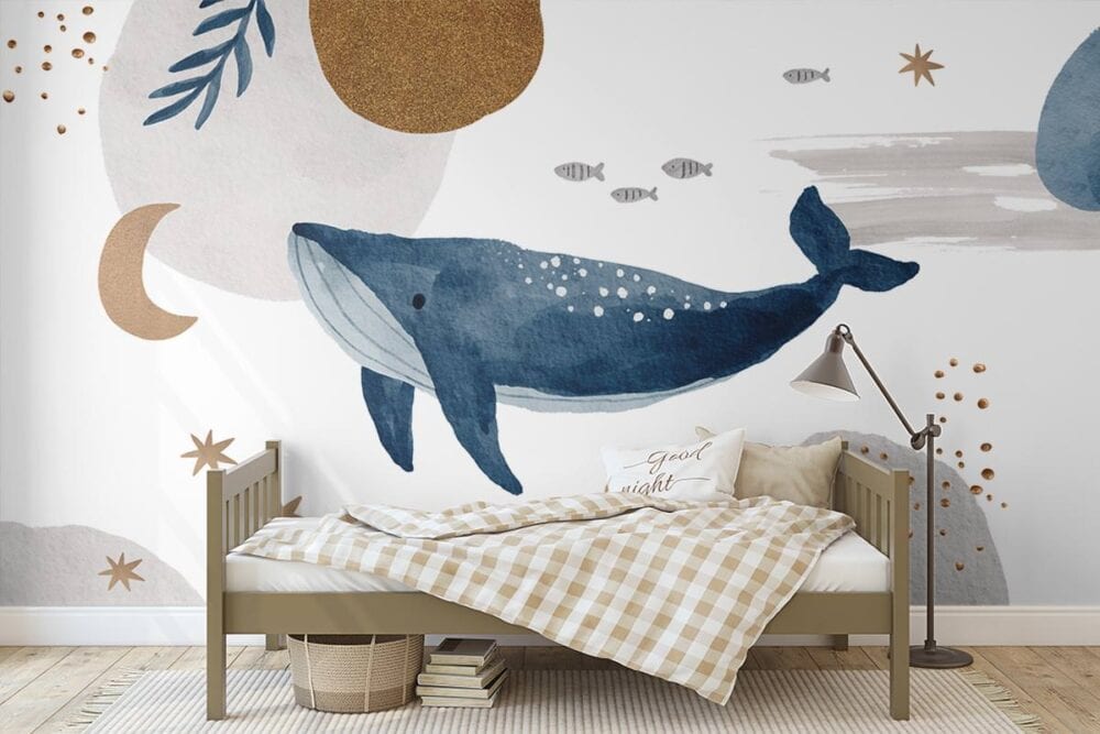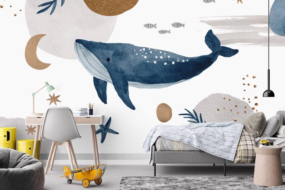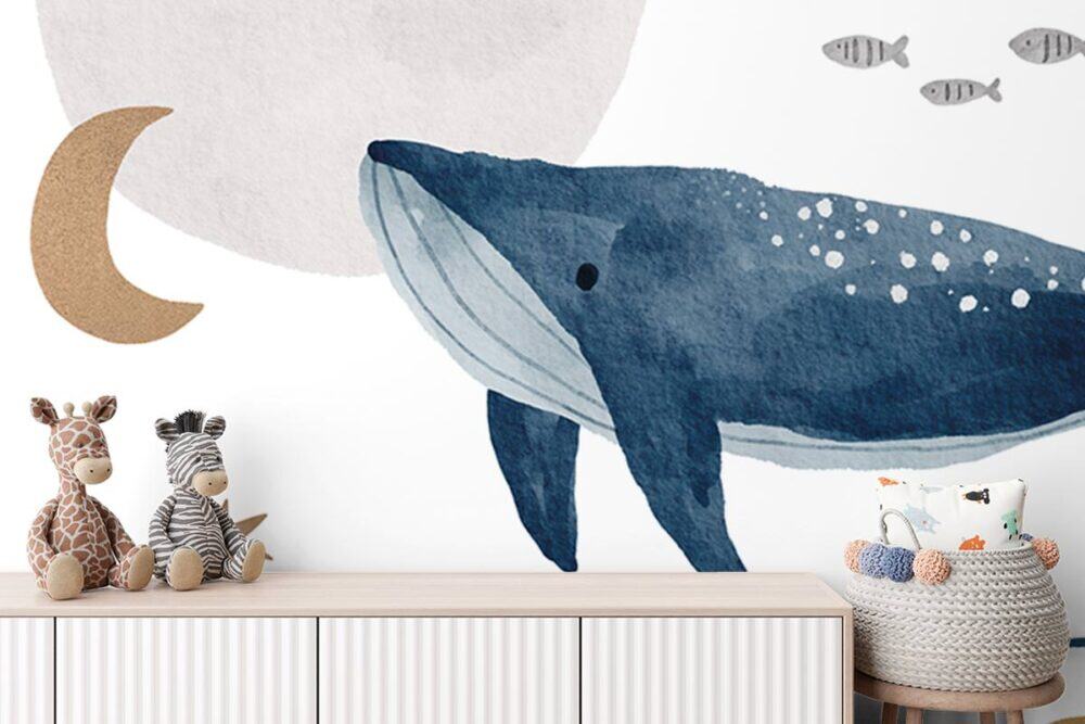 Wil je naast het behang ook een muur in de baby- of kinderkamer verven? Wij hebben alvast 3 Flexa Pure kleuren geselecteerd die perfect passen bij dit fotobehang Walvis met kleine visjes.