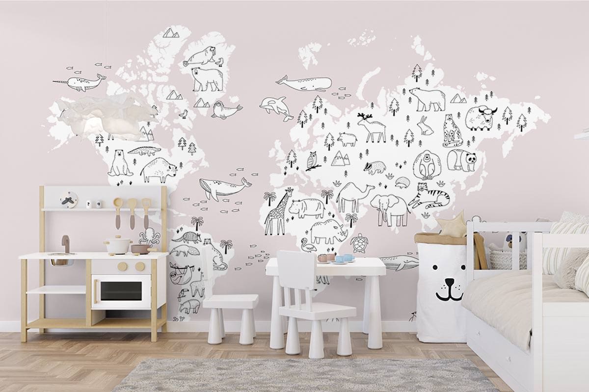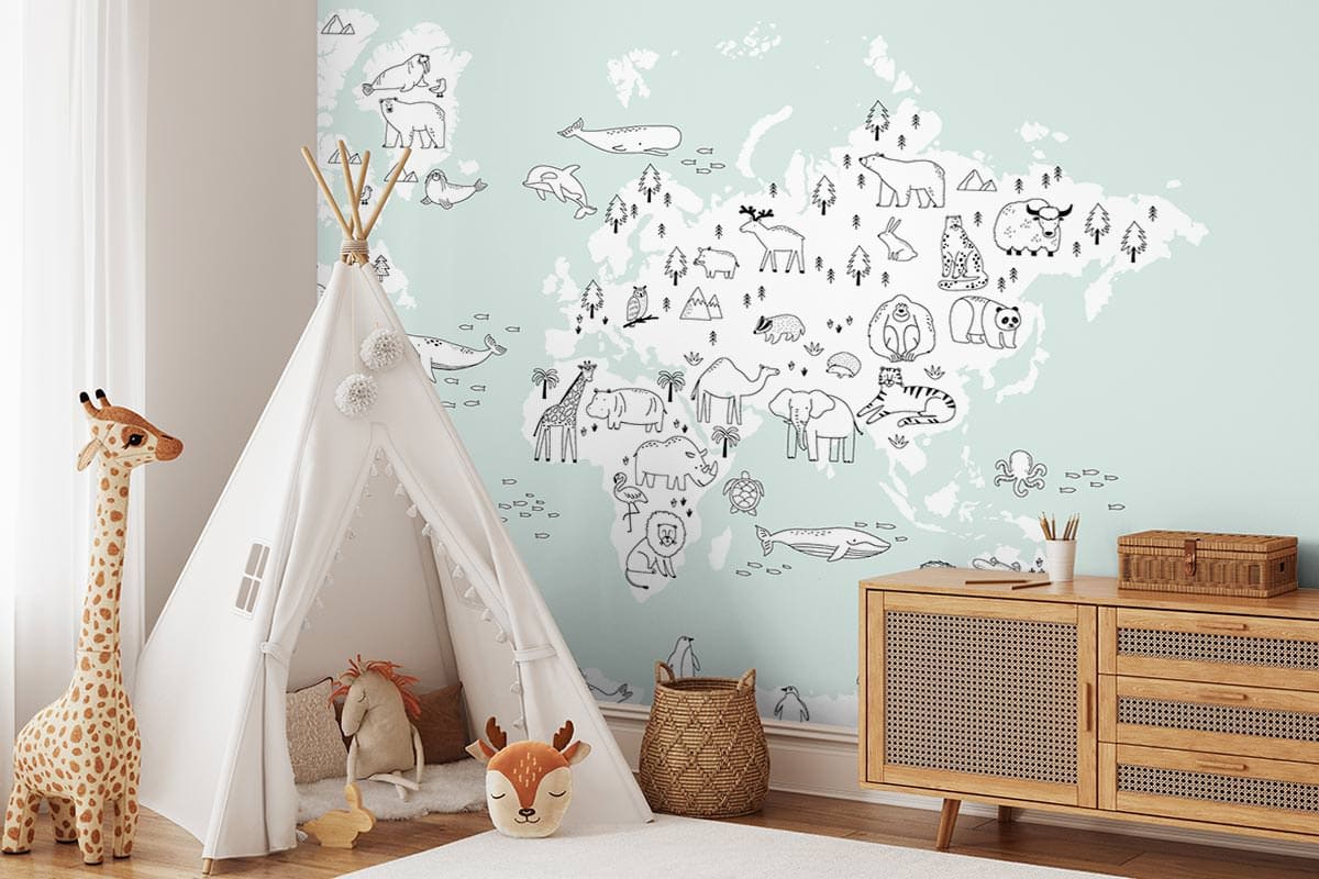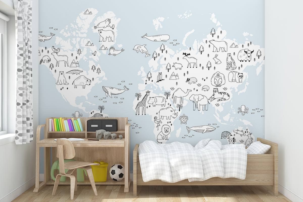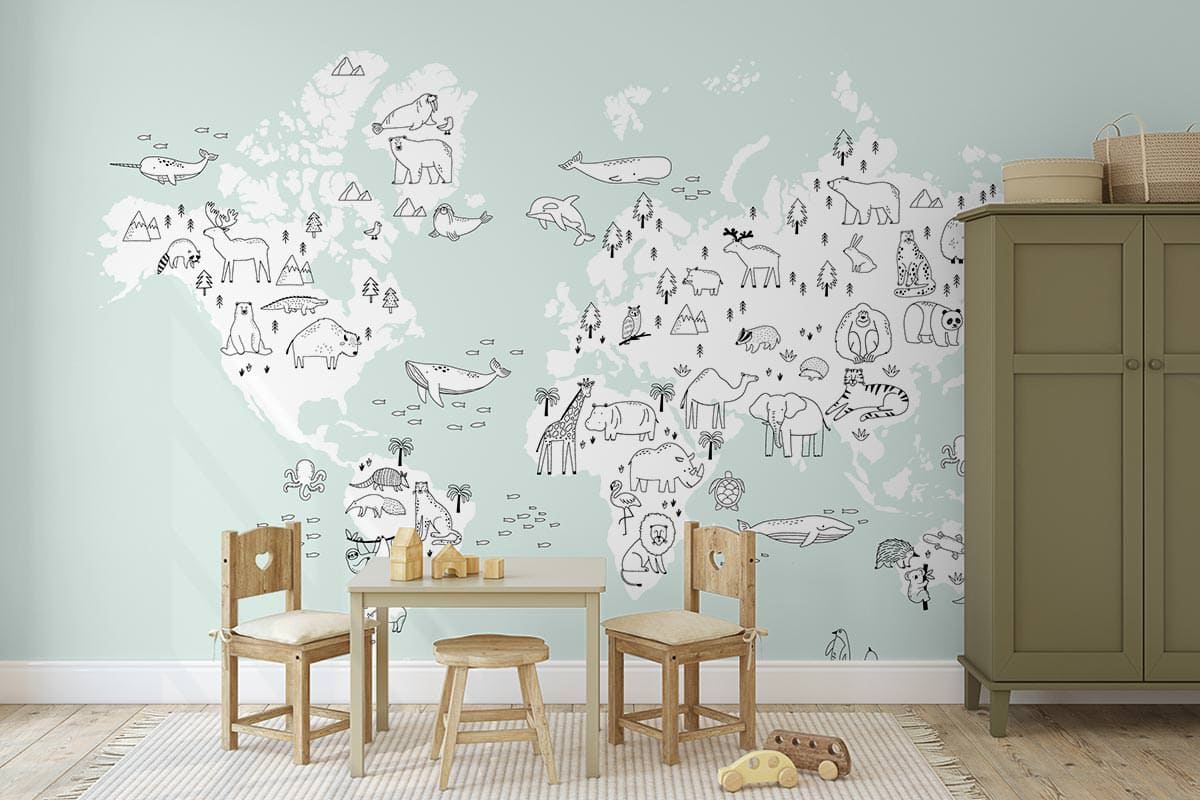 Jouw design Wereldkaart met handgetekende dieren, lichtblauw wordt geprint op hoogwaardig duurzaam vliesbehang van premium kwaliteit. Dit stevige behang (200 g/m²) is krasvast, robuust en blijft jarenlang mooi — perfect voor in de kinderkamer, babykamer of speelkamer. Je kunt het behang helemaal op maat laten maken, zodat het ontwerp precies past op jouw muur. Dankzij de gladde afwerking en strakke structuur komt elk detail van het ontwerp perfect tot zijn recht.