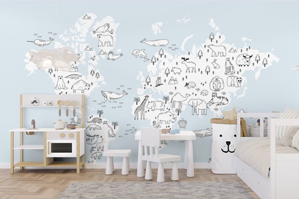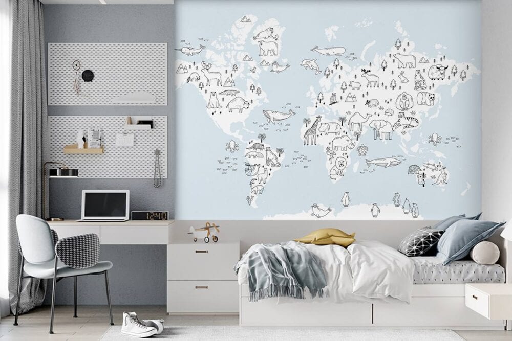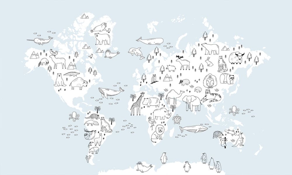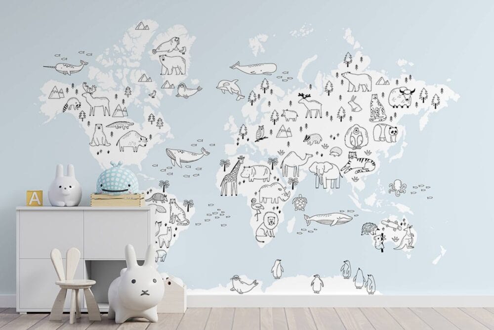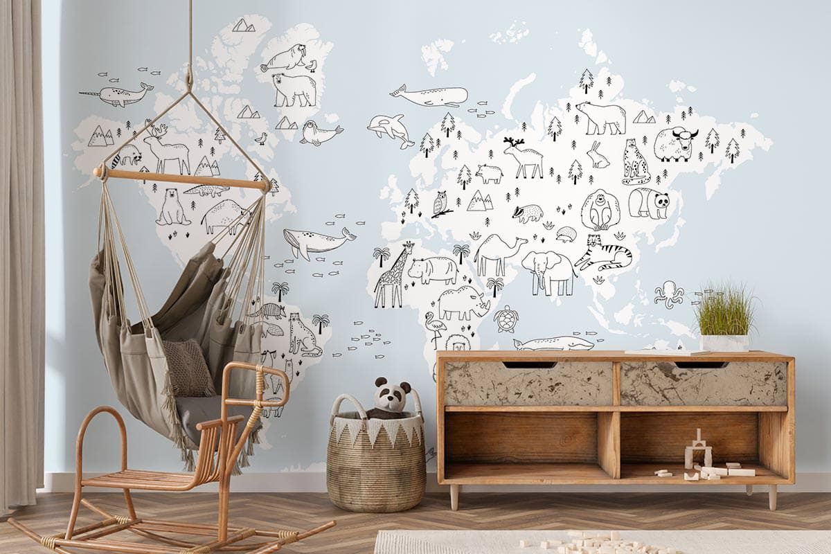 Jouw design Wereldkaart met handgetekende dieren, lichtblauw wordt geprint op hoogwaardig duurzaam vliesbehang van premium kwaliteit. Dit stevige behang (200 g/m²) is krasvast, robuust en blijft jarenlang mooi — perfect voor in de kinderkamer, babykamer of speelkamer. Je kunt het behang helemaal op maat laten maken, zodat het ontwerp precies past op jouw muur. Dankzij de gladde afwerking en strakke structuur komt elk detail van het ontwerp perfect tot zijn recht.