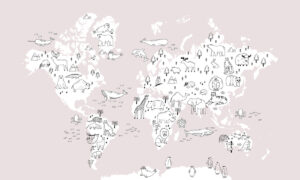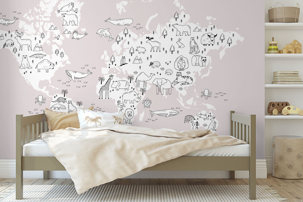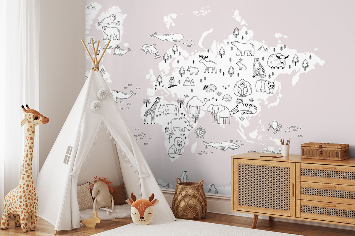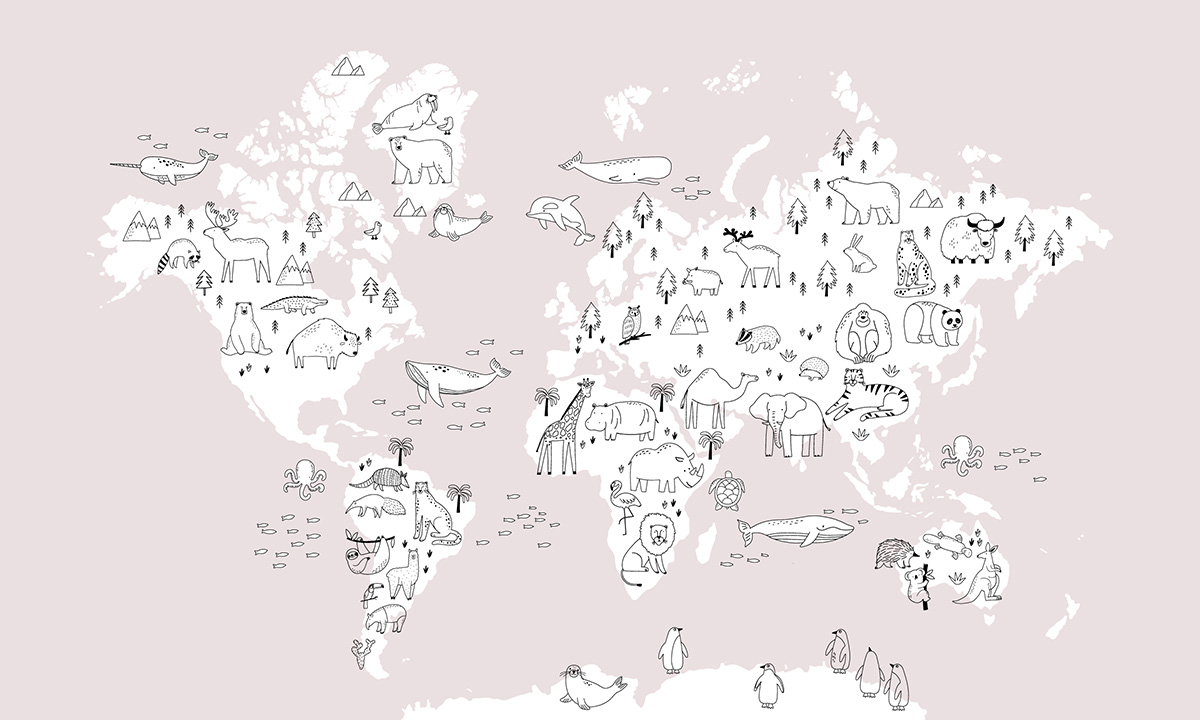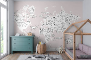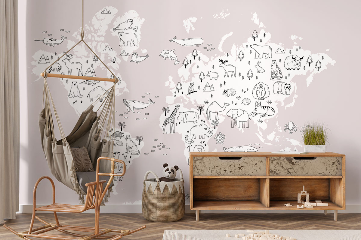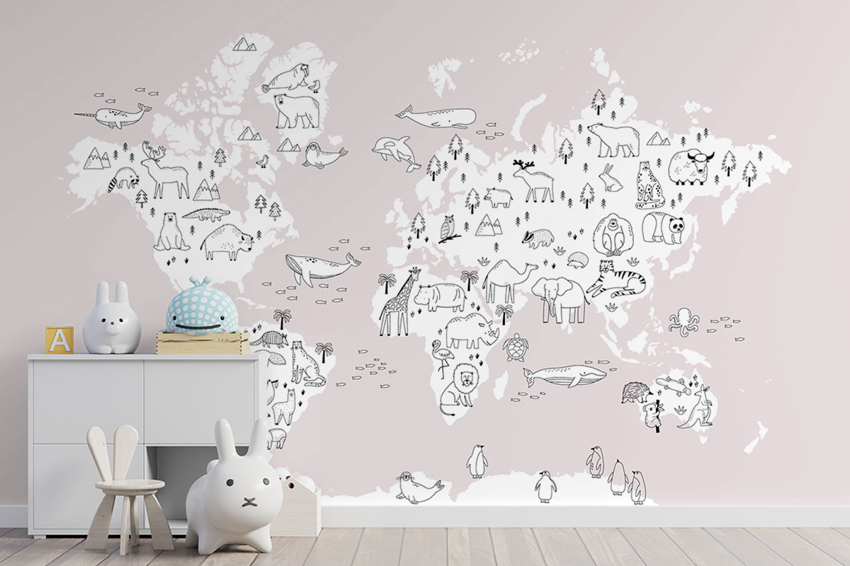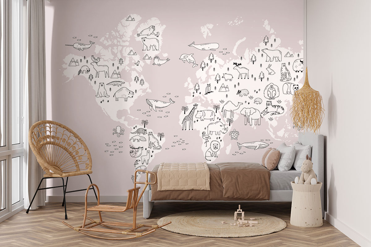 Jouw design Wereldkaart met handgetekende dieren, roze wordt geprint op hoogwaardig duurzaam vliesbehang van premium kwaliteit. Dit stevige behang (200 g/m²) is krasvast, robuust en blijft jarenlang mooi — perfect voor in de kinderkamer, babykamer of speelkamer. Je kunt het behang helemaal op maat laten maken, zodat het ontwerp precies past op jouw muur. Dankzij de gladde afwerking en strakke structuur komt elk detail van het ontwerp perfect tot zijn recht.