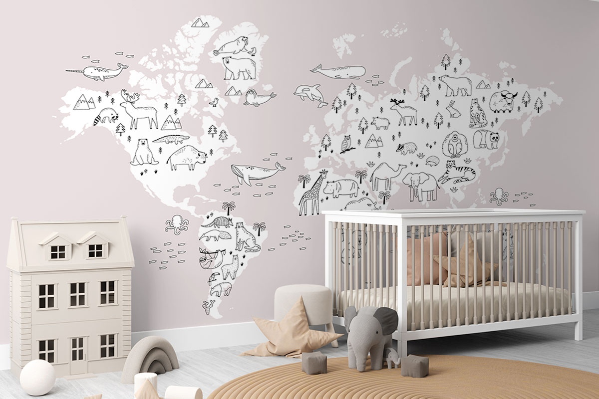 Wil je naast het behang ook een muur in de baby- of kinderkamer verven? Wij hebben alvast 3 Flexa Pure kleuren geselecteerd die perfect passen bij dit fotobehang Wereldkaart met handgetekende dieren, roze.